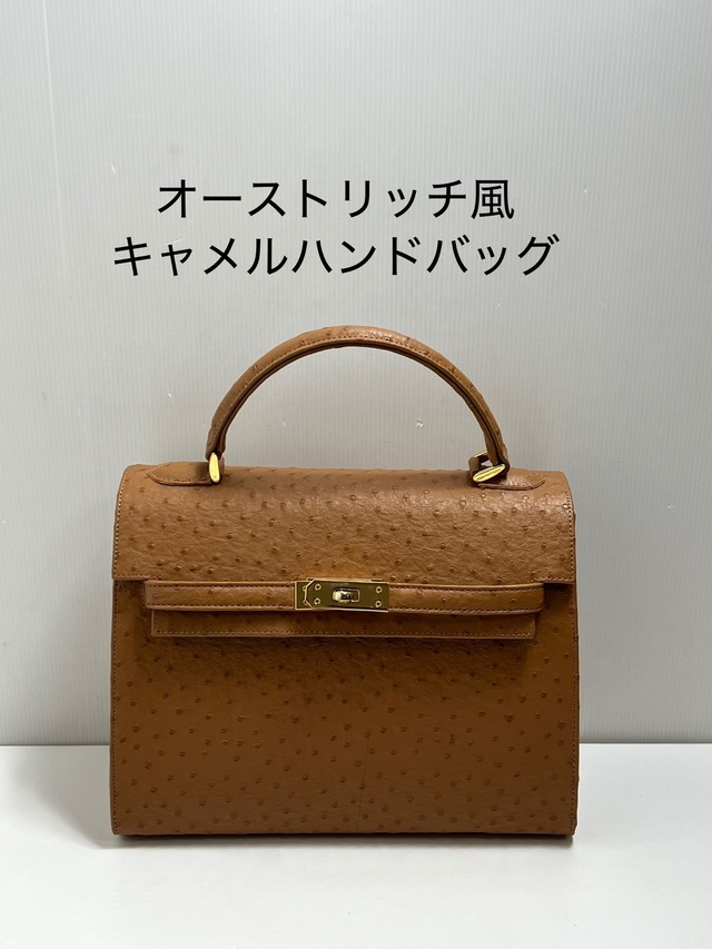 オーストリッチ風 ハンドバッグ キャメル系 レディースバッグ 高級感あり 上品デザイン 美品 革調 横幅28cm
