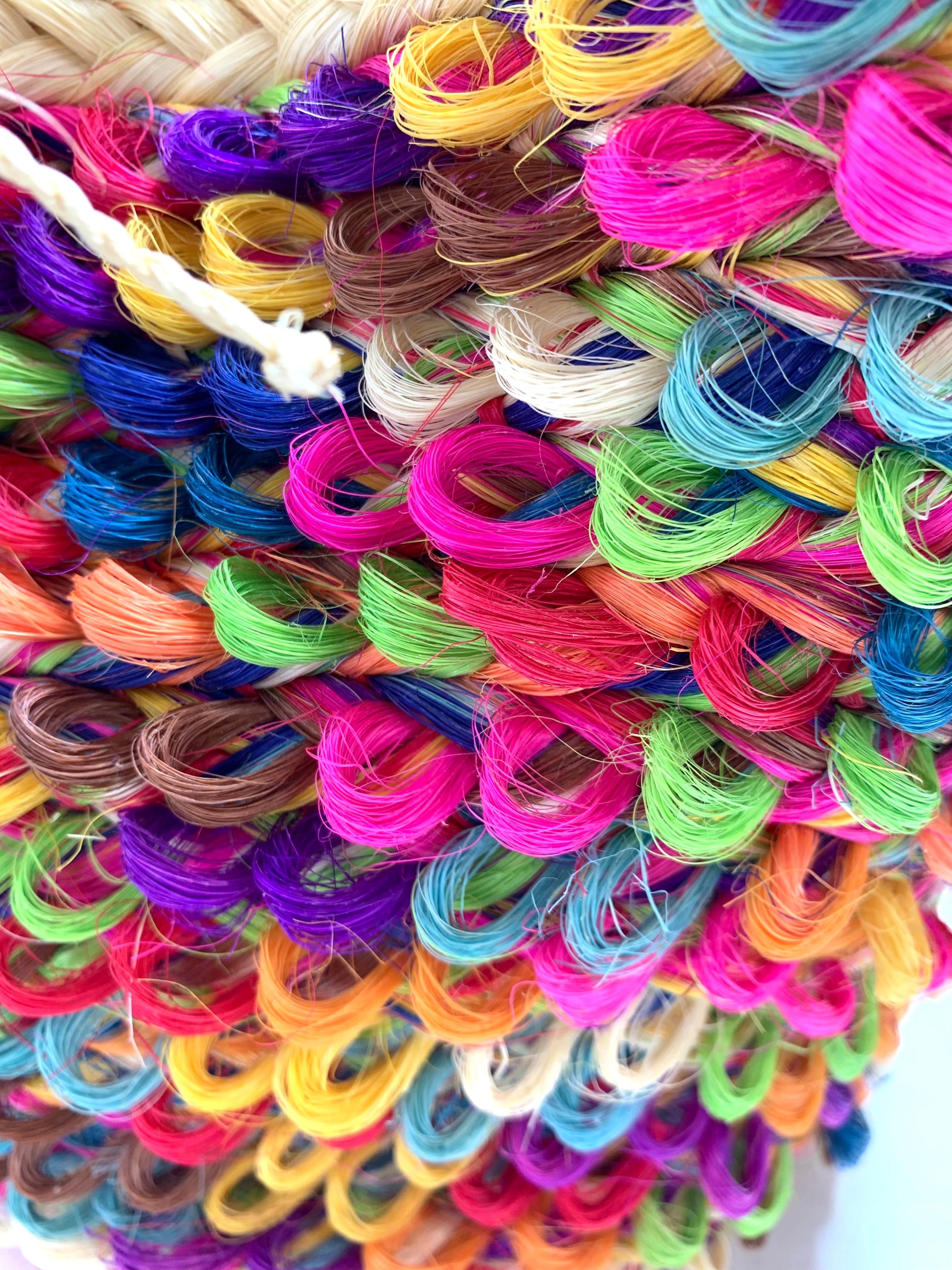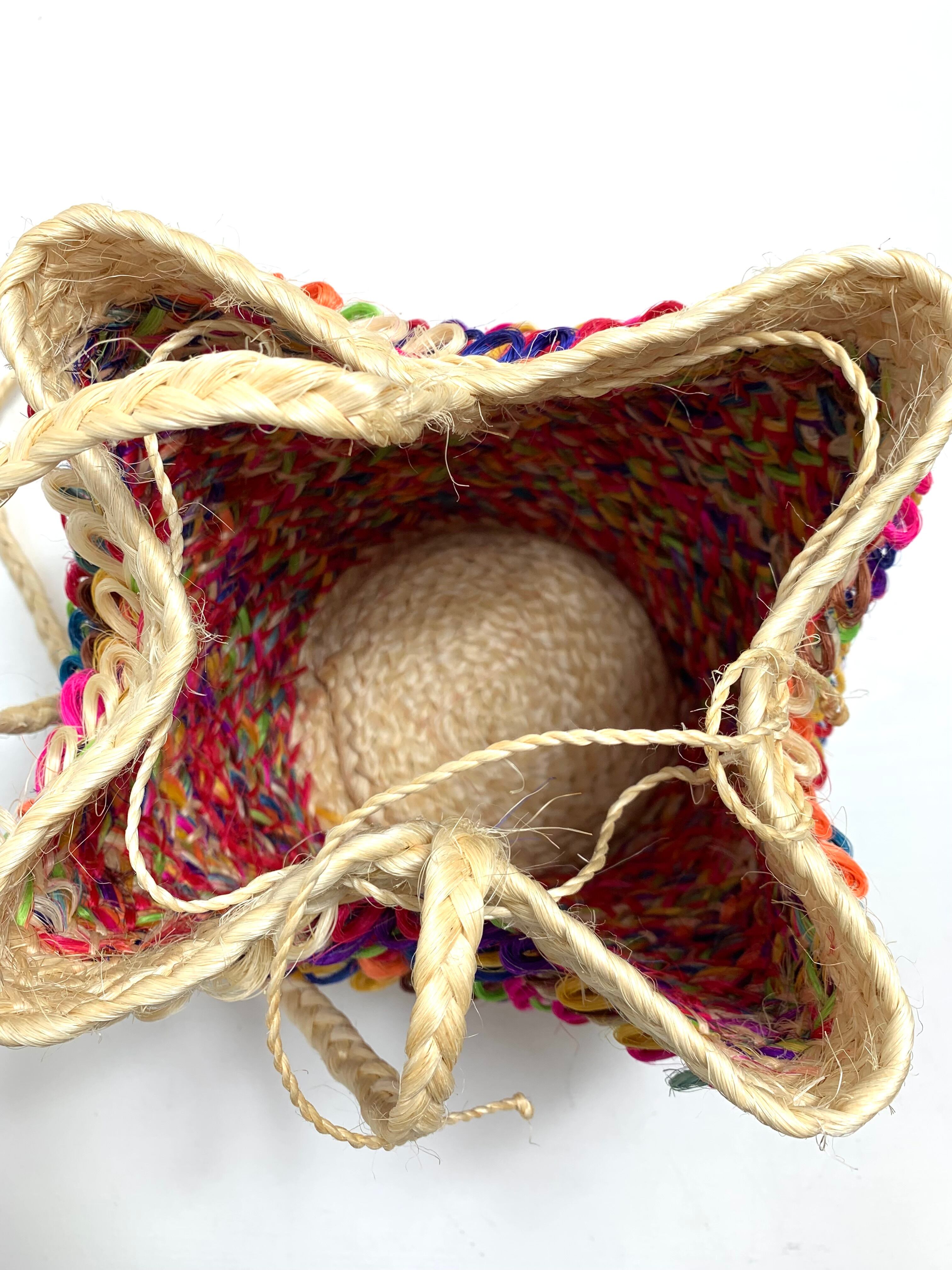 レインボー色で丁寧に編まれたデザインは、どんな色のコーディネートにもマッチ。ナチュラルな天然素材で作られており、軽やかで使い心地も抜群です。