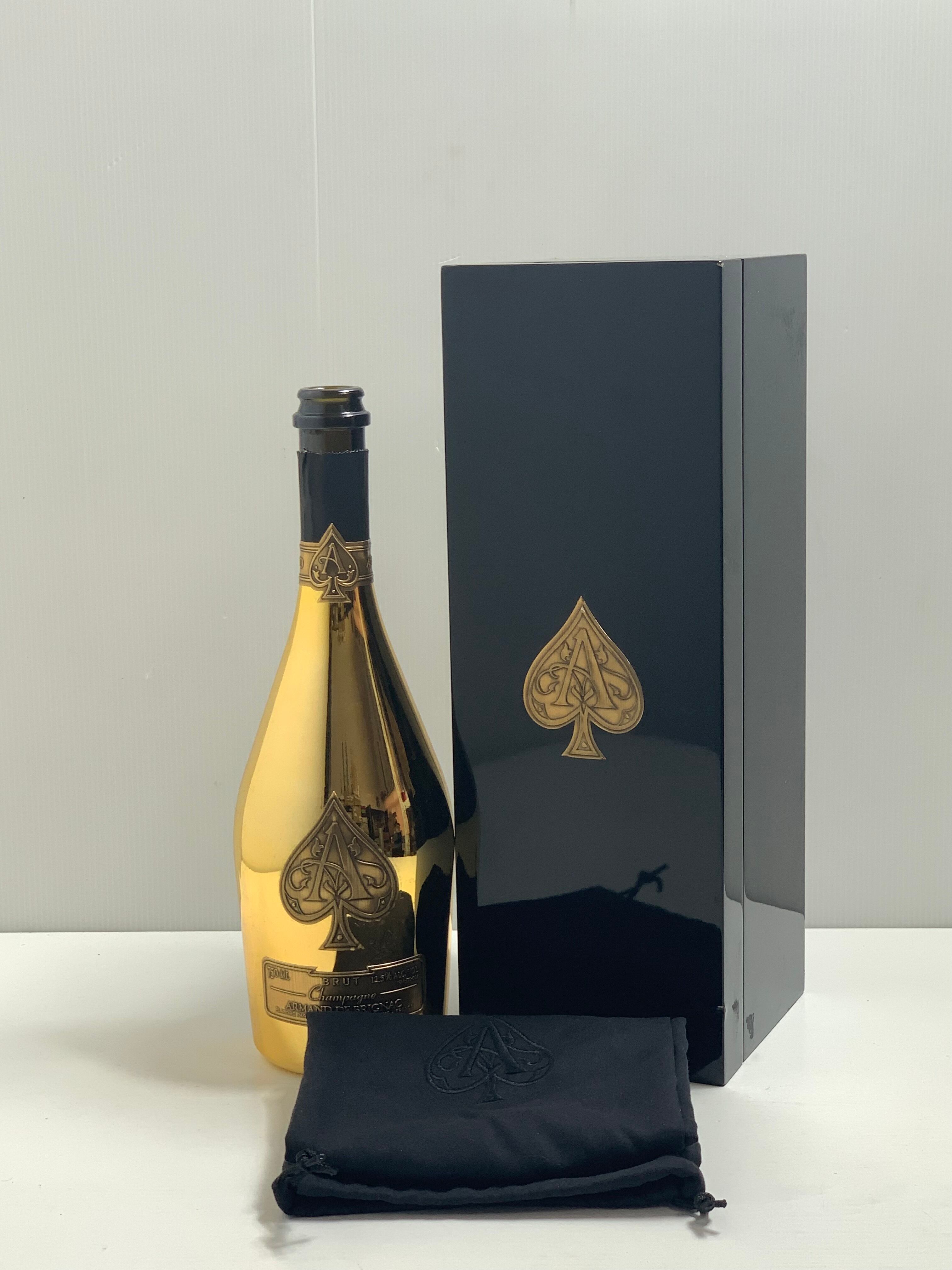 アルマンドゴールドの空瓶、専用袋、専用ハードケースのセットです。高級感あふれるゴールドボトルはディスプレイ用としてお楽しみいただけます。