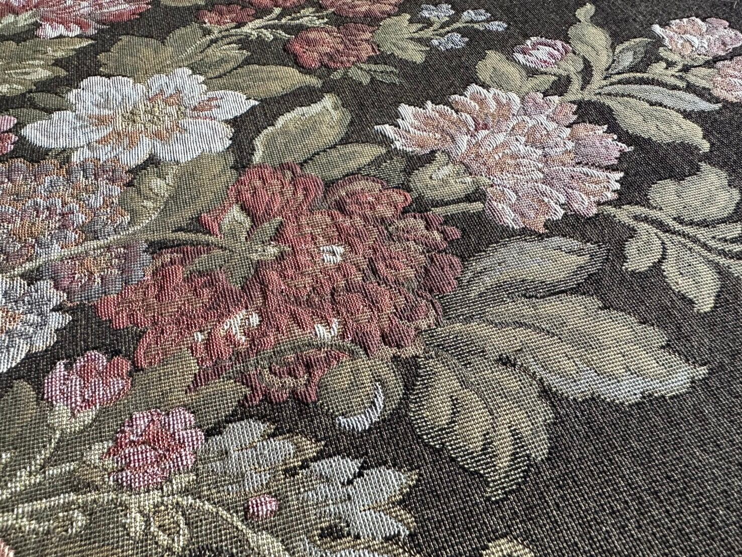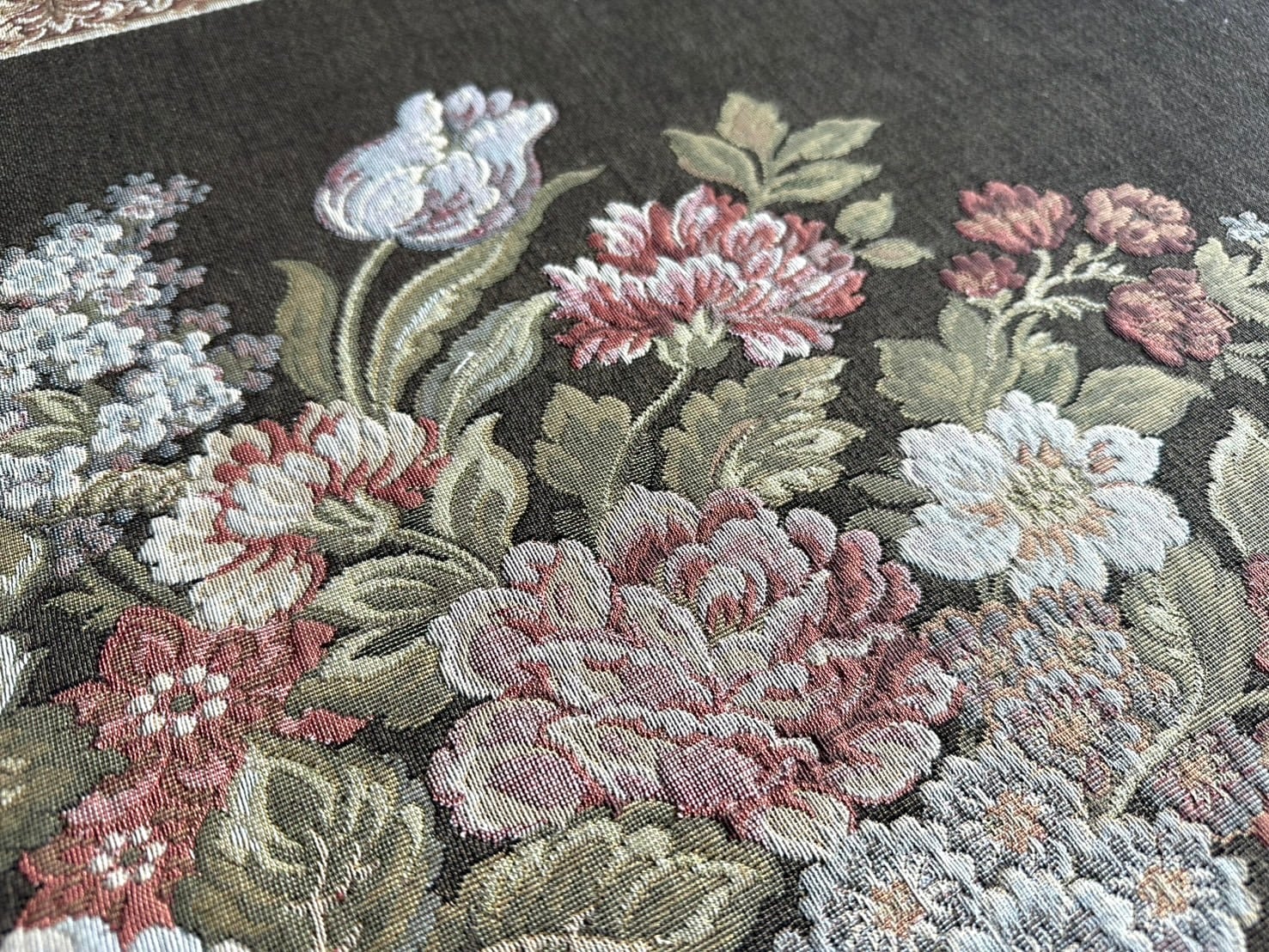この西洋額縁のゴブラン織タペストリーは、落ち着いた黒のバックグラウンドに、色とりどりの花々が織り込まれた美しいデザインです。テーブルの上に置かれた花籠からは、赤、ピンク、ブルー、紫、オレンジなどの淡い色味の花々が華やかに描かれています。