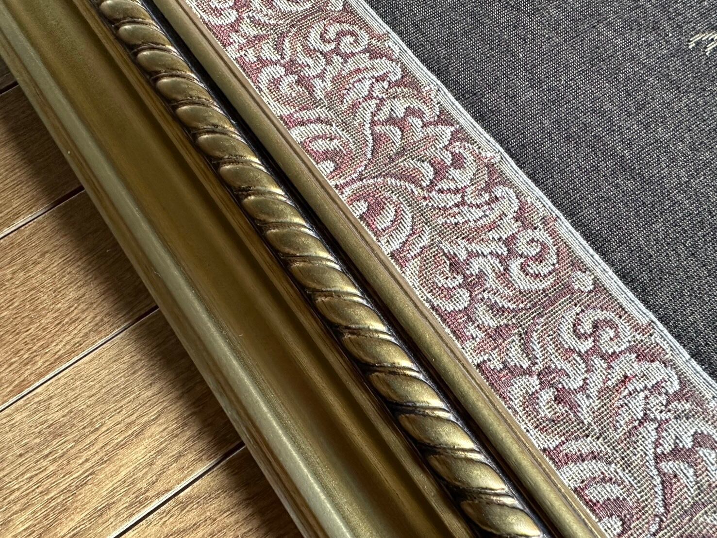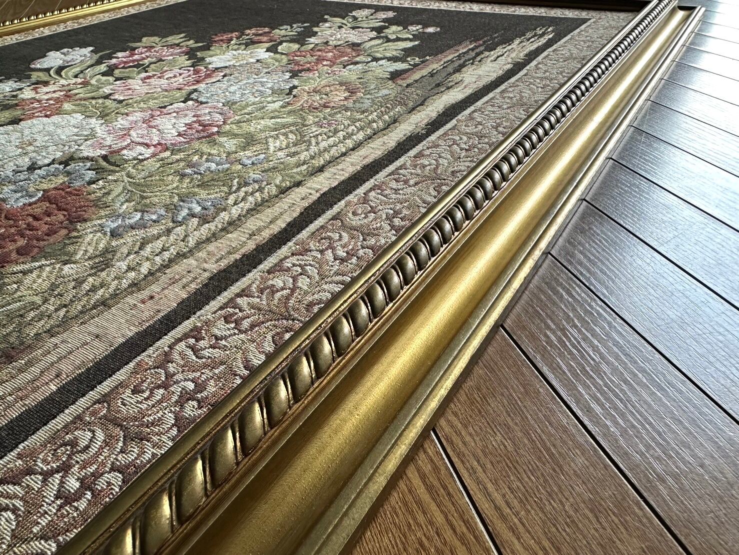 外枠には、花のような模様が施されており、木枠は金縁の額で囲まれて、豪華で上品な印象を与えます。サイズは横幅130cm、縦82cm厚み3cm と十分な大きさで、お部屋のインテリアとしてインパクトを与えること間違いなしです。