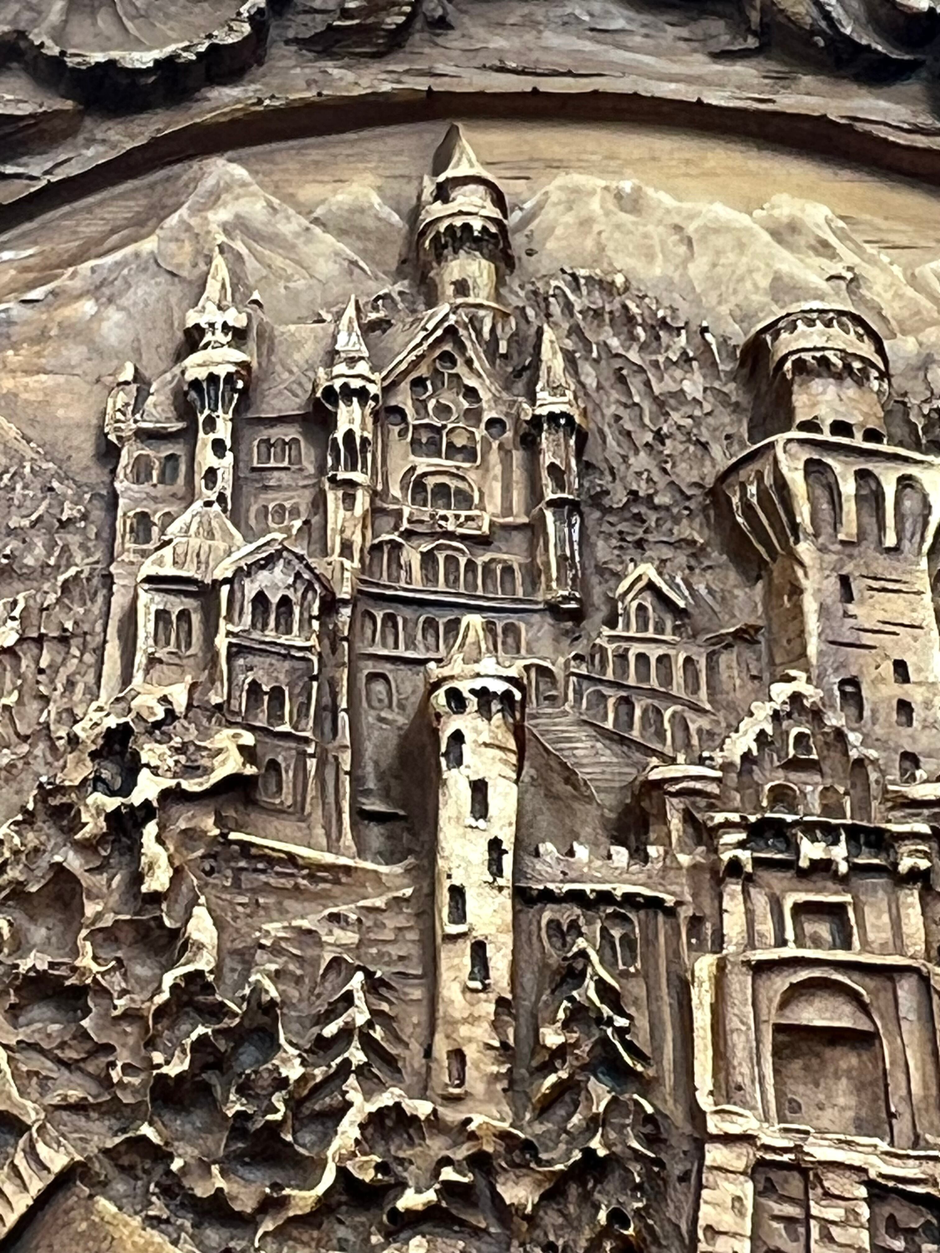 ディズニーの「眠れる森の美女」の城のモデルにもなった、ドイツ・バイエルンの名城「ノイシュヴァンシュタイン城」をモチーフにした木彫りの壁掛けアートです。
