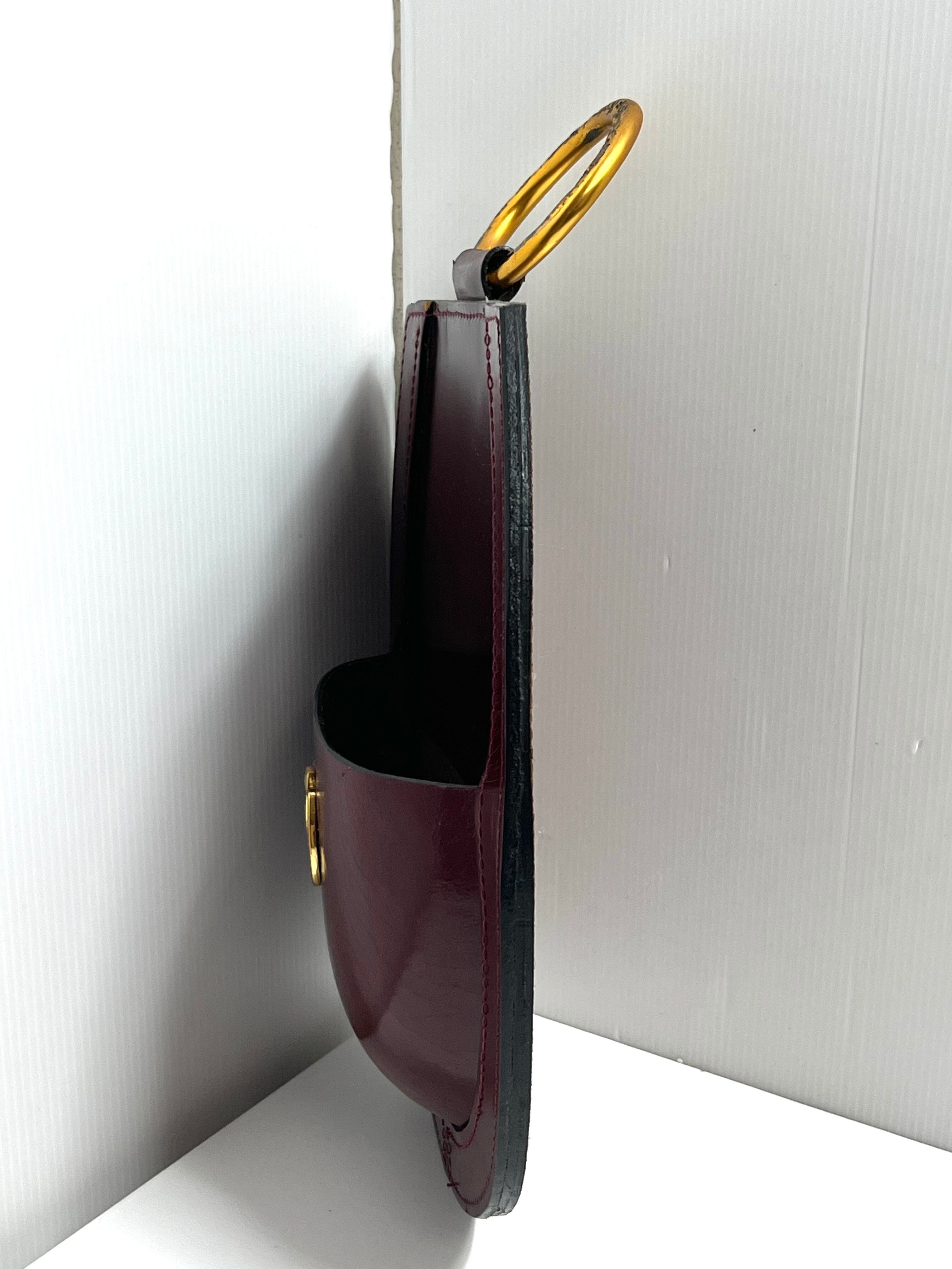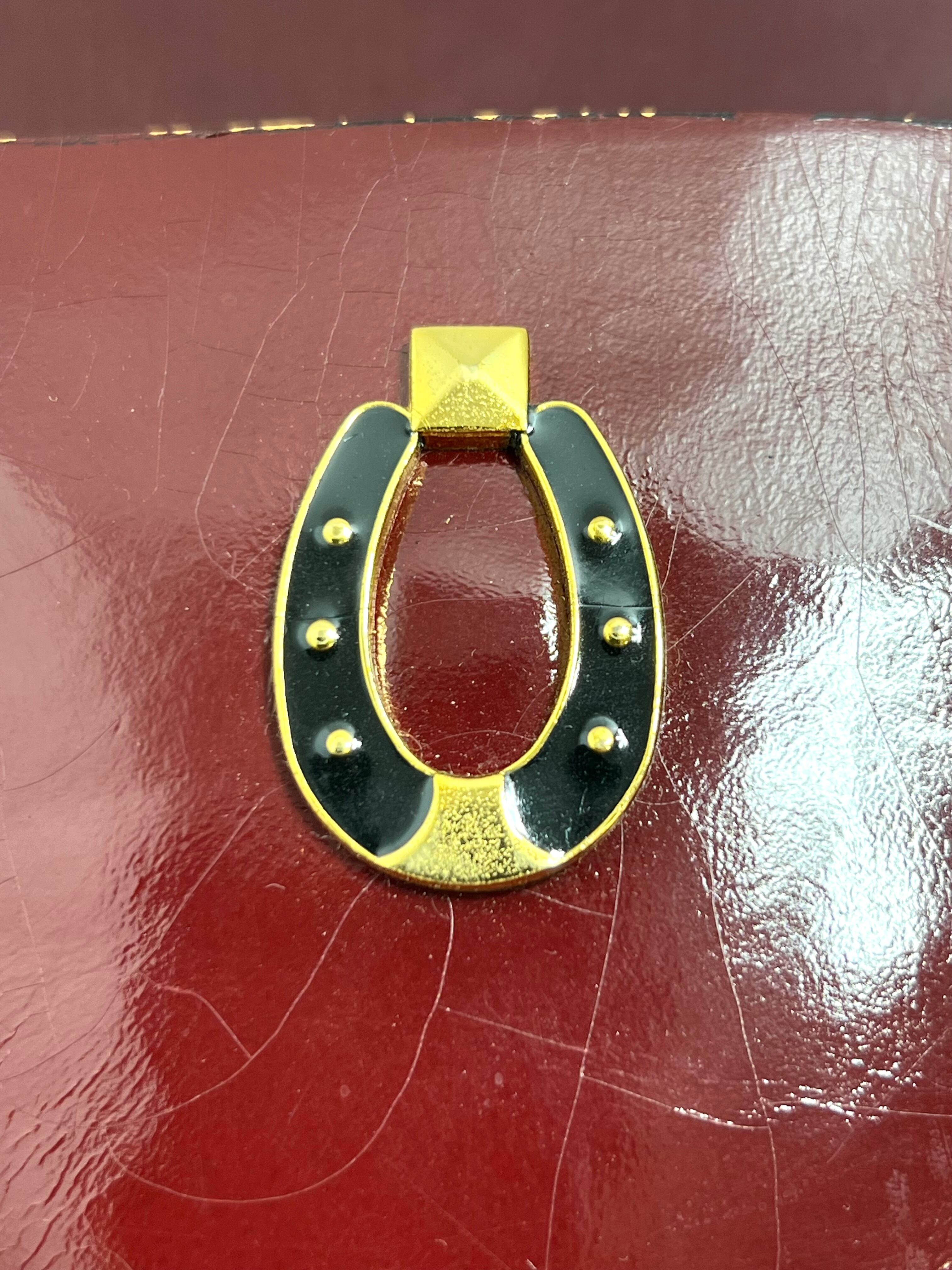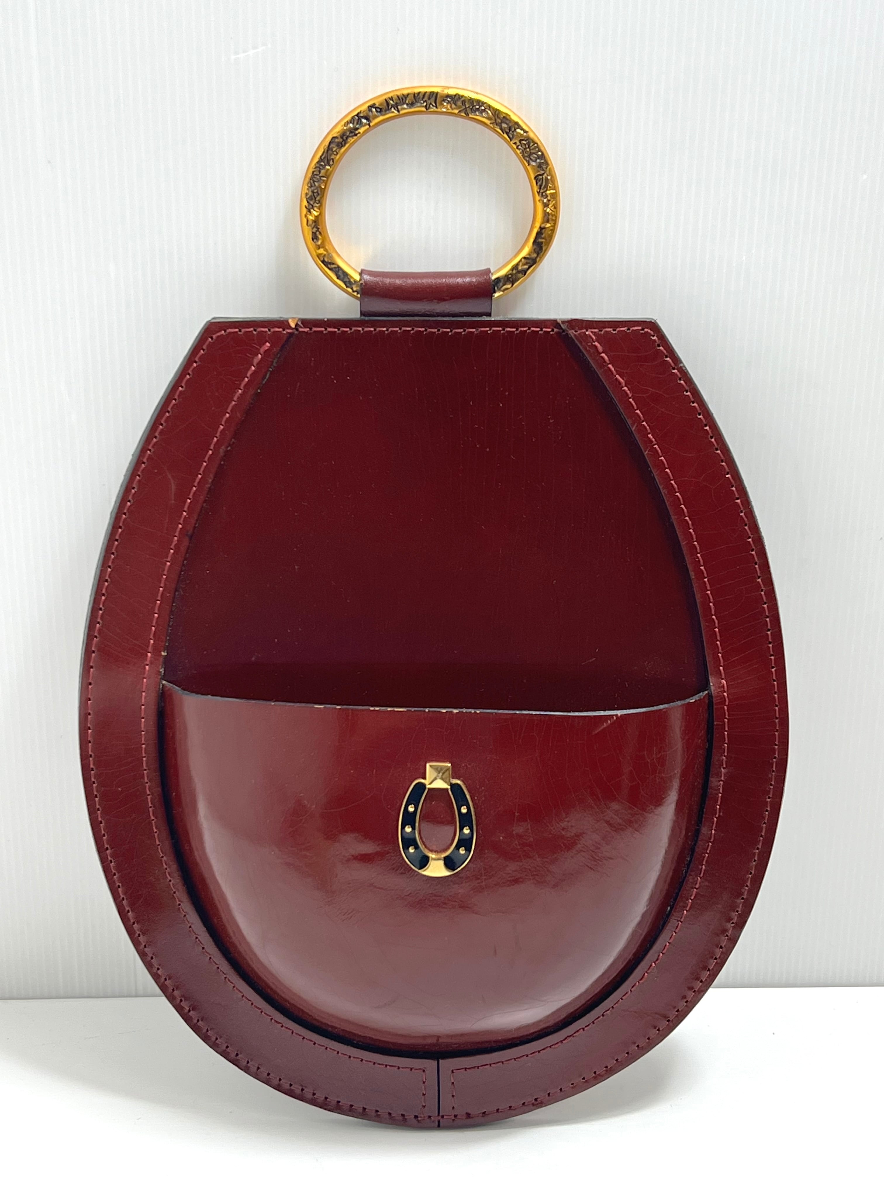 縁起物としても知られる「蹄鉄(馬蹄)」をかたどった、美しいフォルムが特徴的。ボルドーカラーの本体に金色の金具が映え、上品で華やかな印象を与えます。