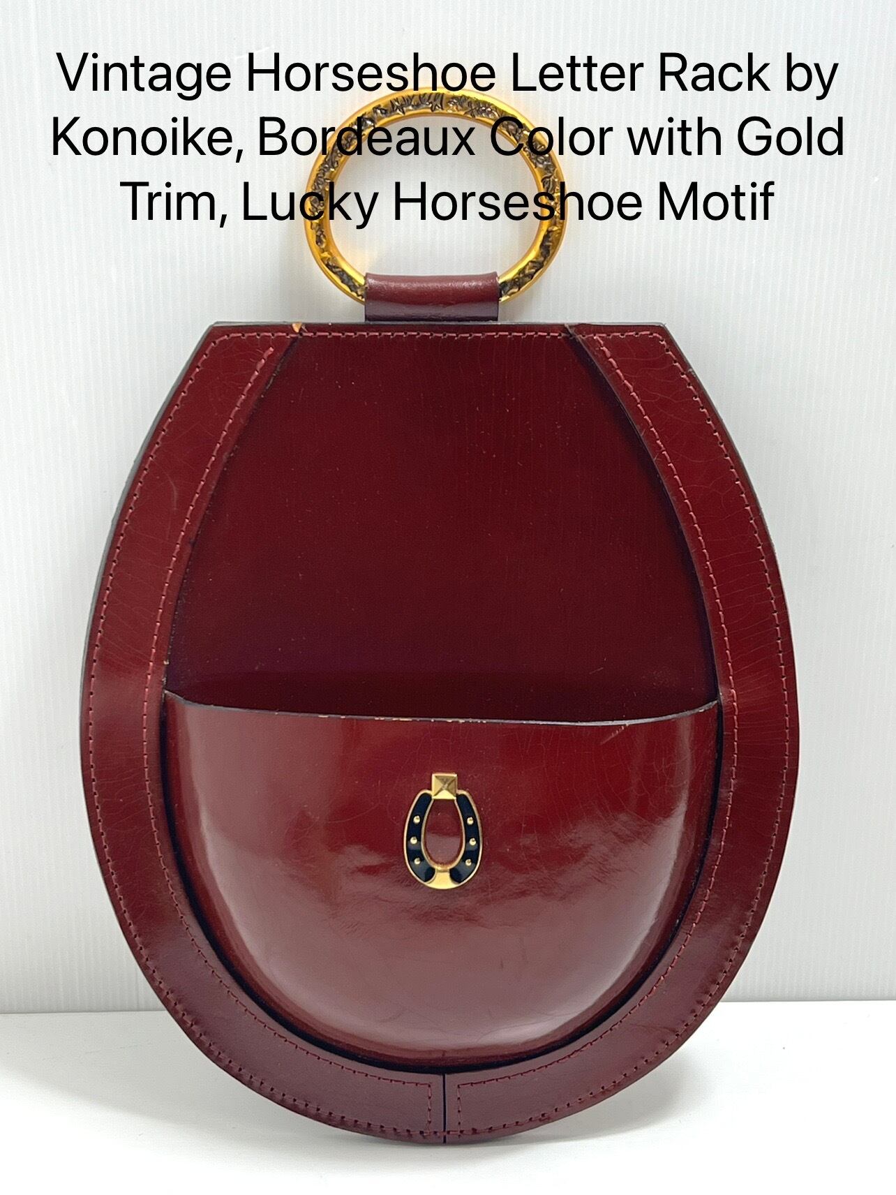 Vintage Horseshoe Letter Rack by Konoike, Bordeaux Color with Gold Trim, Lucky Horseshoe Motif
