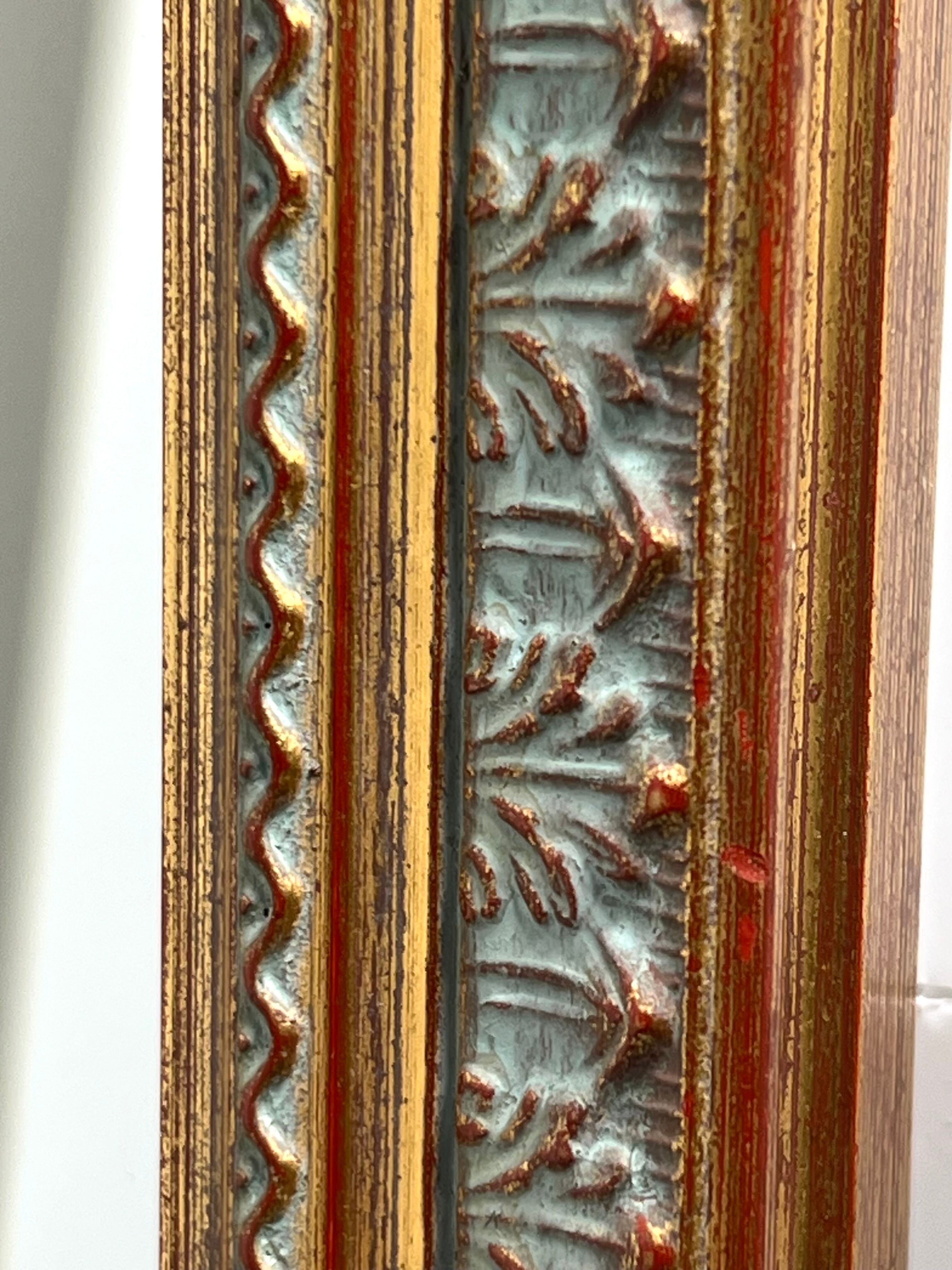 縁取りには金渕のアクセントが施され、フレーム部分には淡い水色をベースに、植物モチーフの手彫り装飾が立体的にあしらわれています。クラシカルでありながら、モダンなインテリアにも調和する上品な雰囲気を持った逸品です。