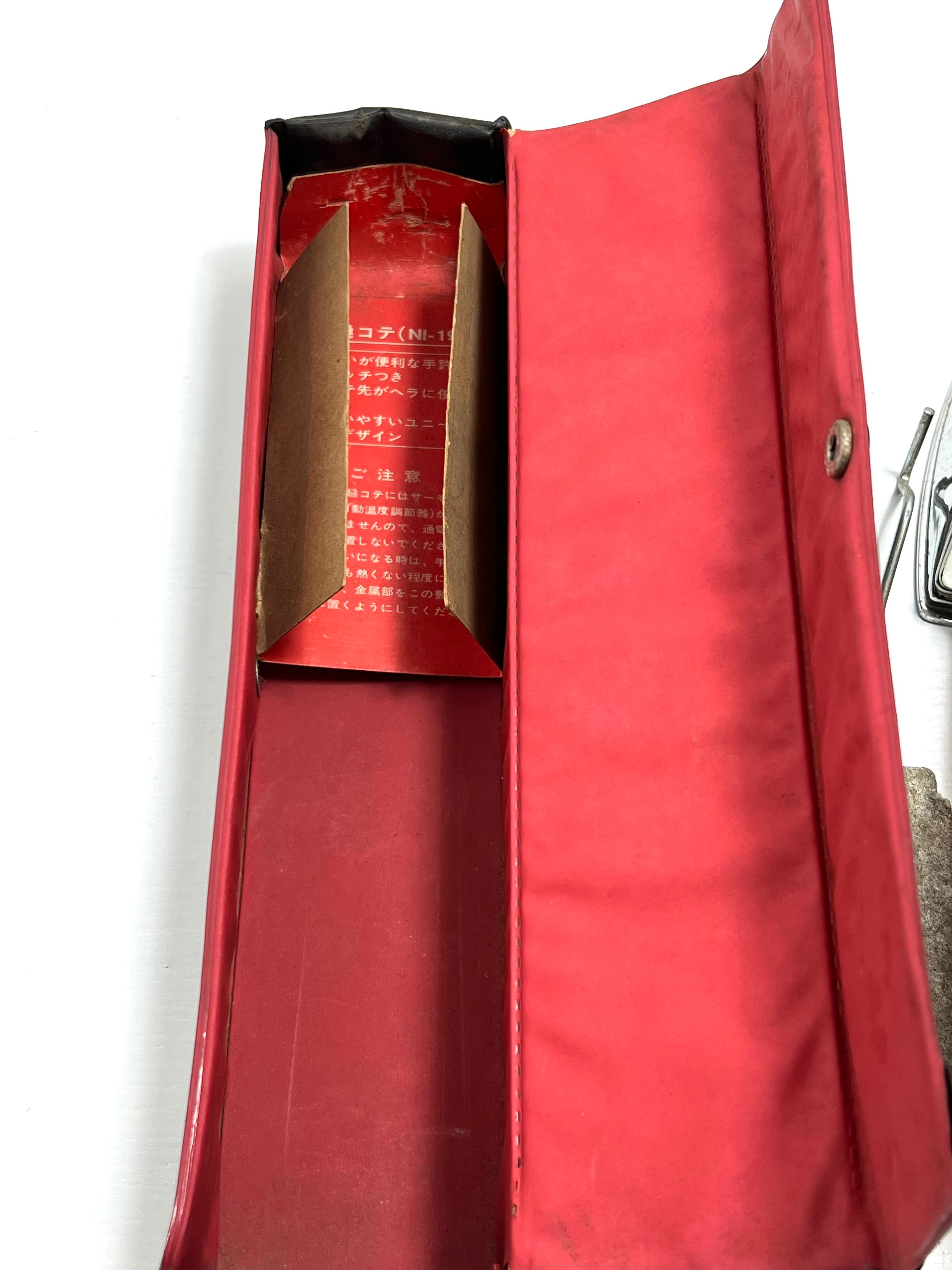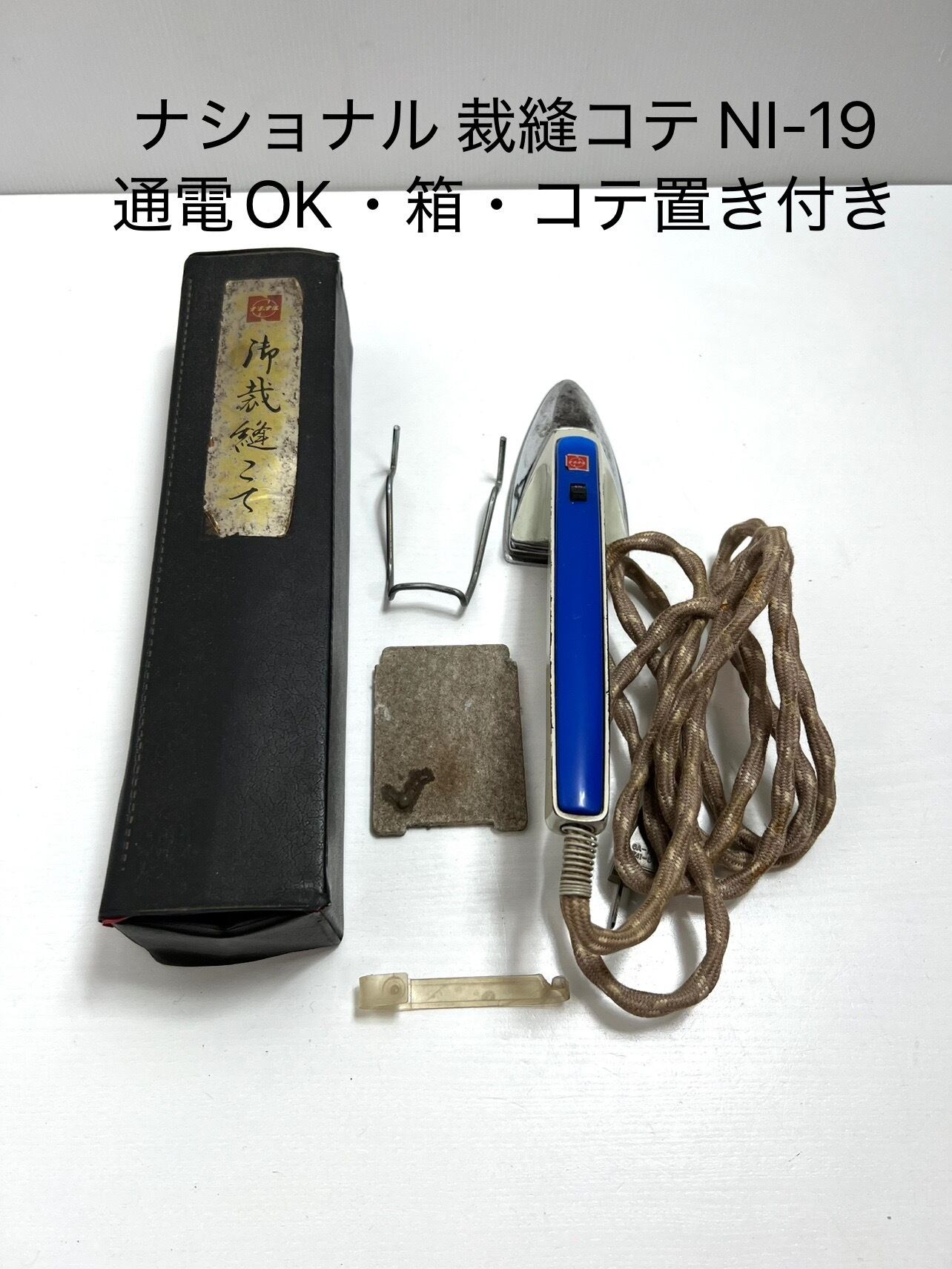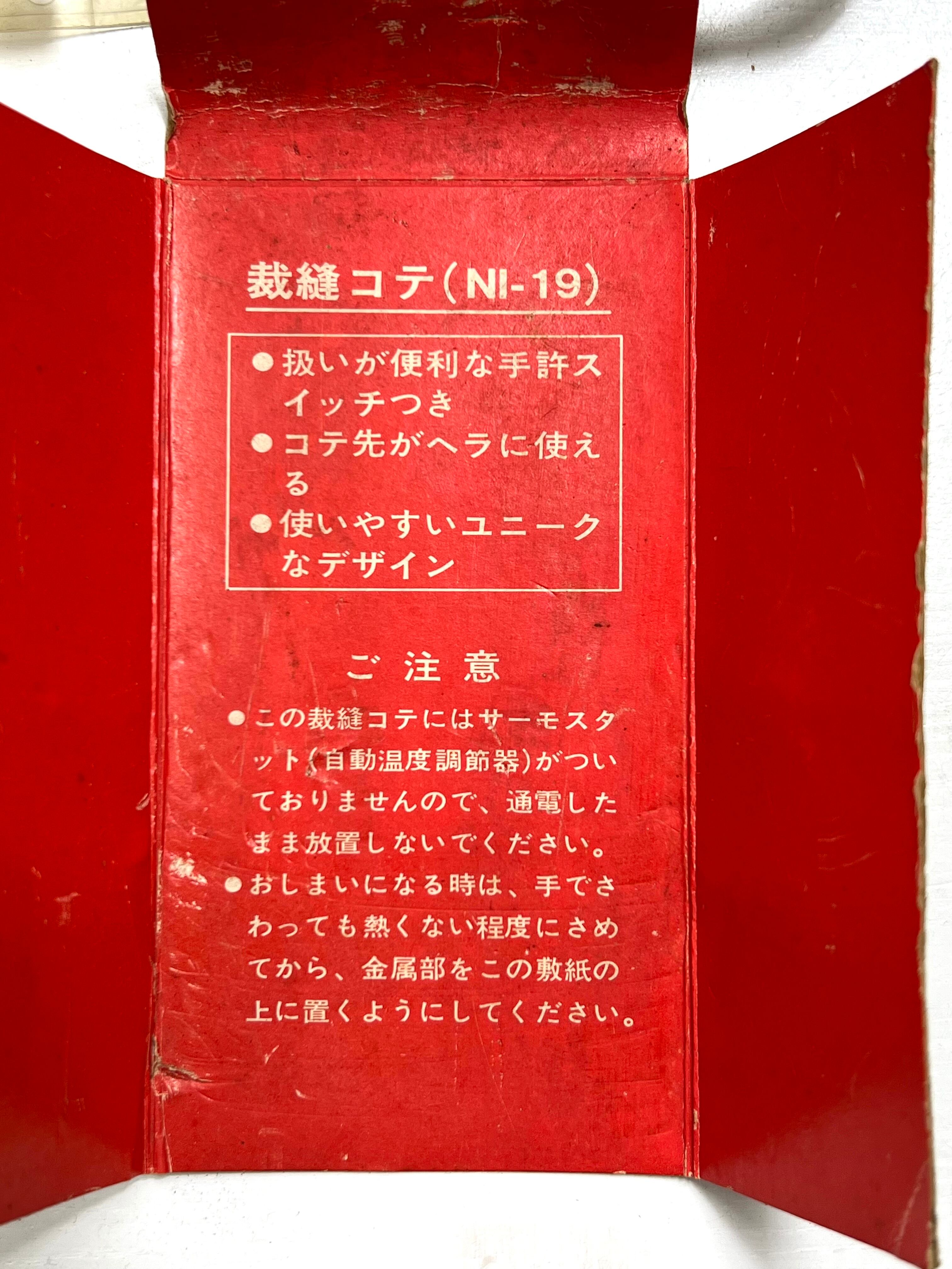 ナショナル製の裁縫用電熱コテ「NI-19」、箱付き・通電確認済のヴィンテージ品です。昭和レトロな佇まいで、コレクションにも実用にもおすすめです