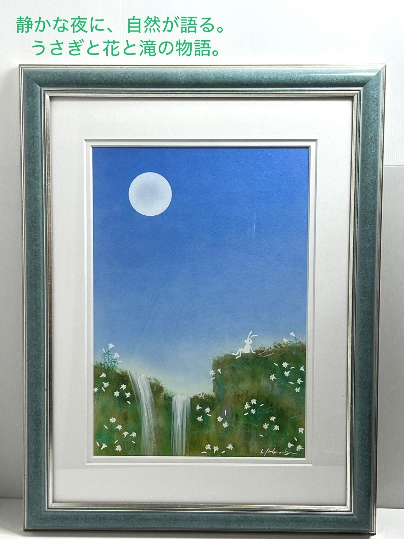 L.Hamachi 額装アート「月夜と滝とうさぎの幻想風景」