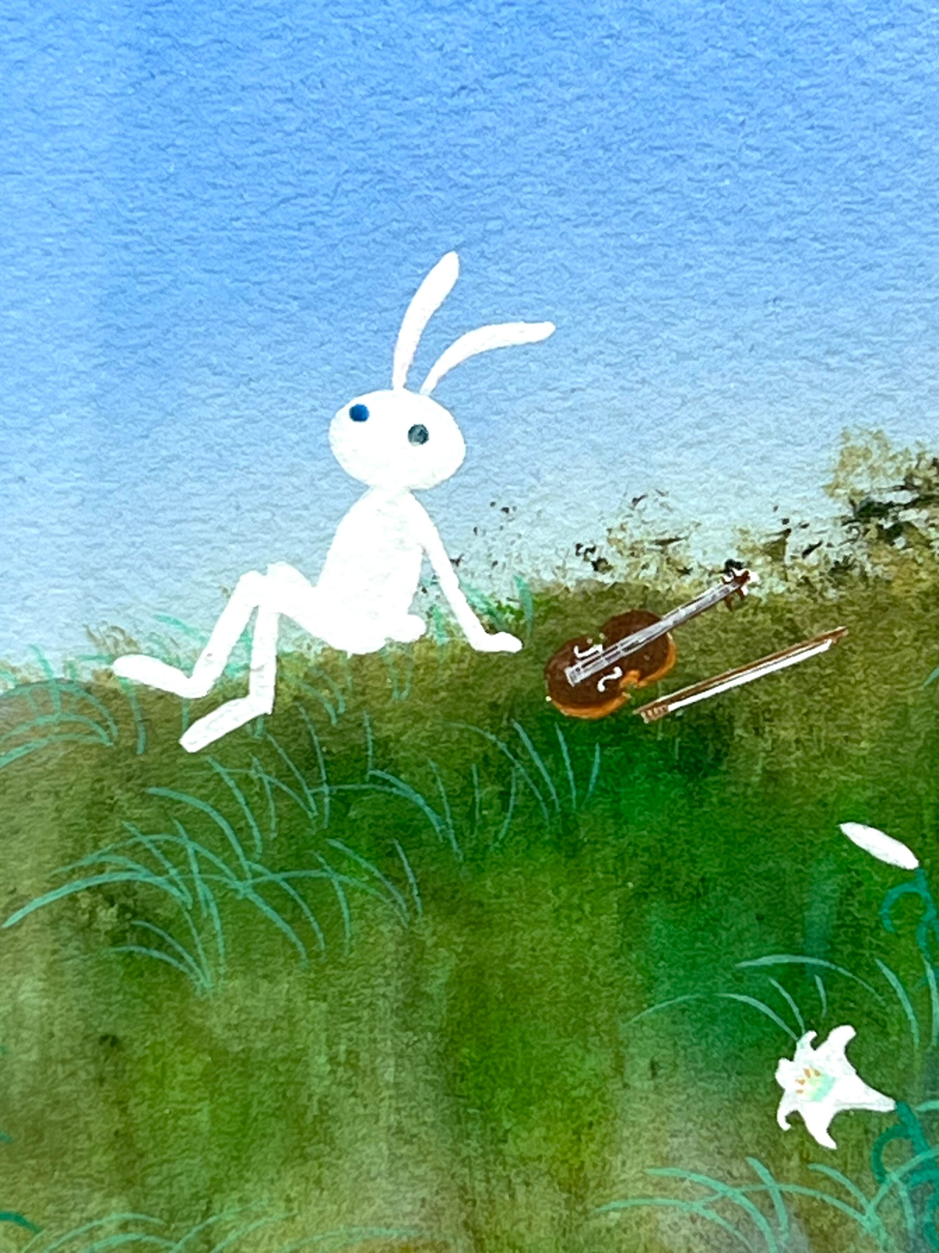 - 月明かりの夜、白いうさぎが草花に囲まれた丘の上に座る幻想的な風景。