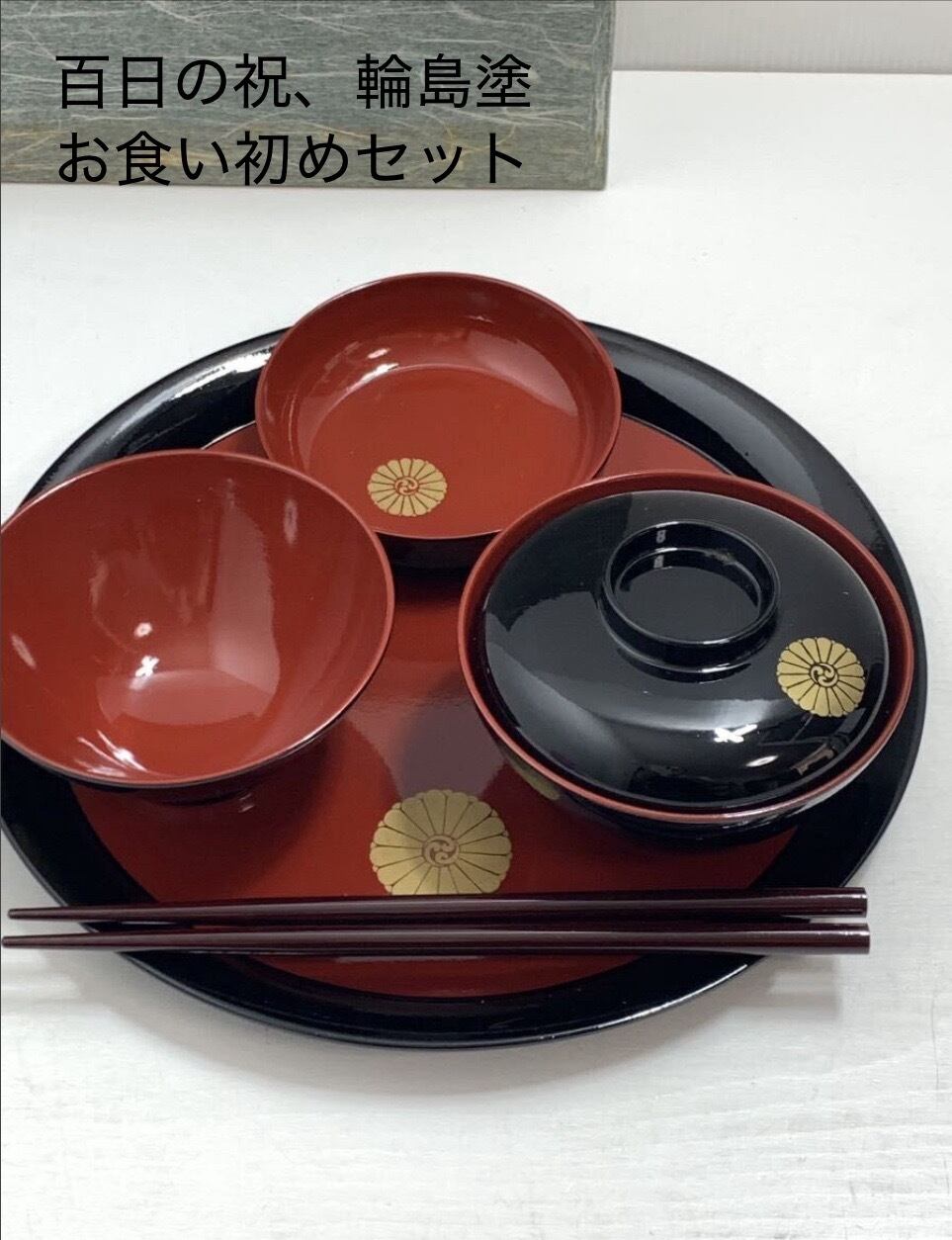お食い初めセット 輪島塗 漆器 お祝い膳 (平椀, 汁椀, 飯椀, 祝箸, 盆) 寒川神社