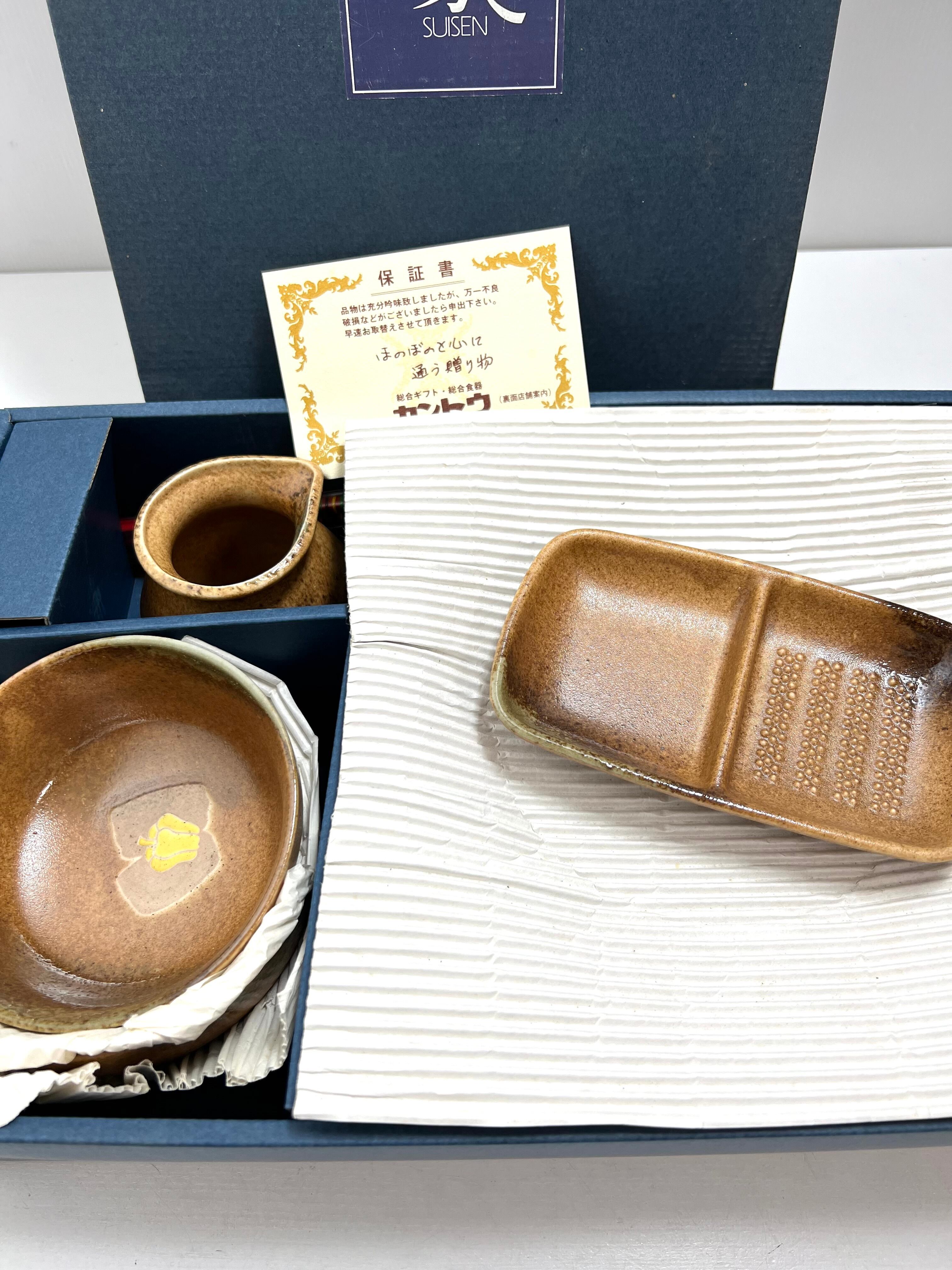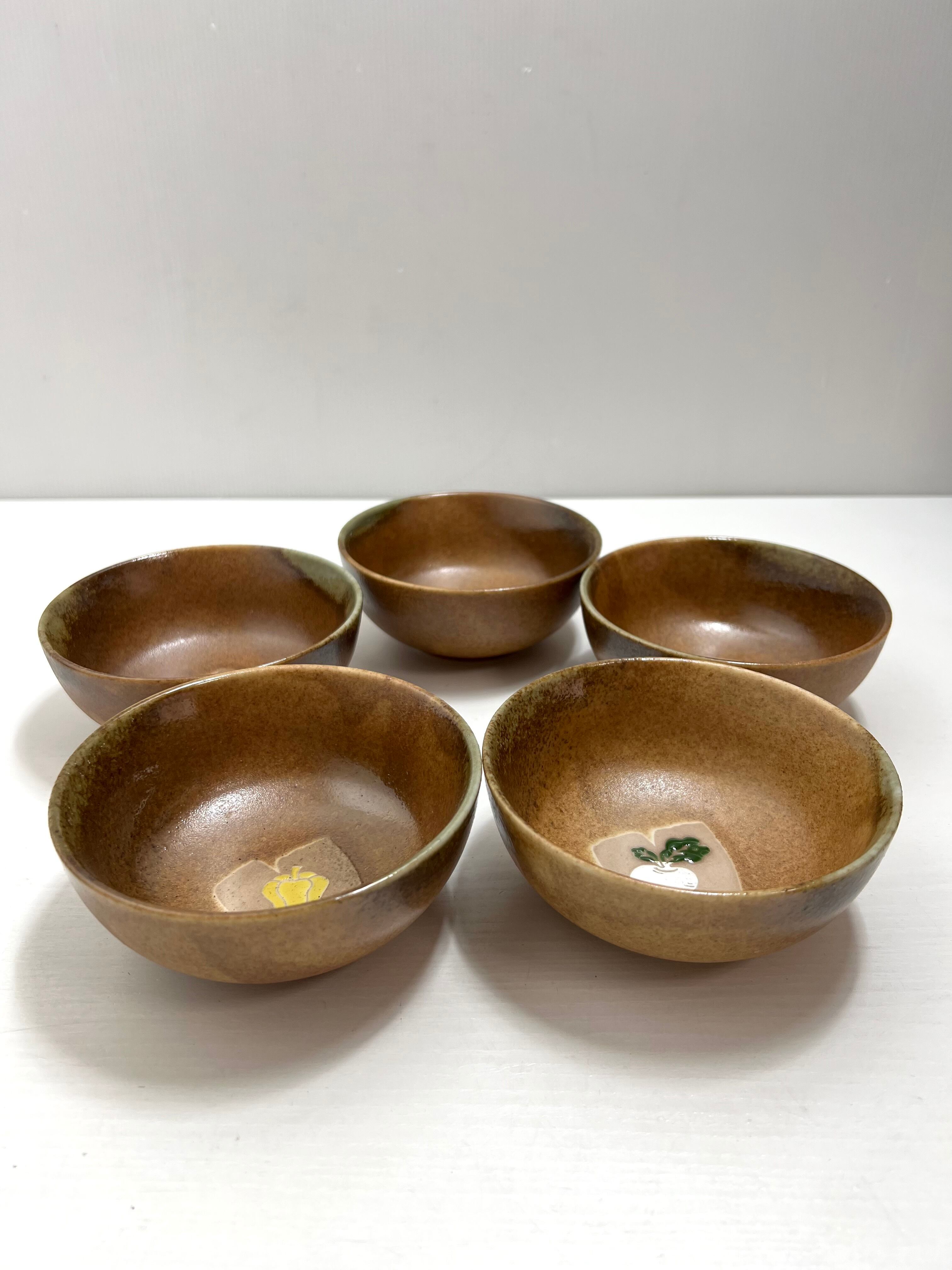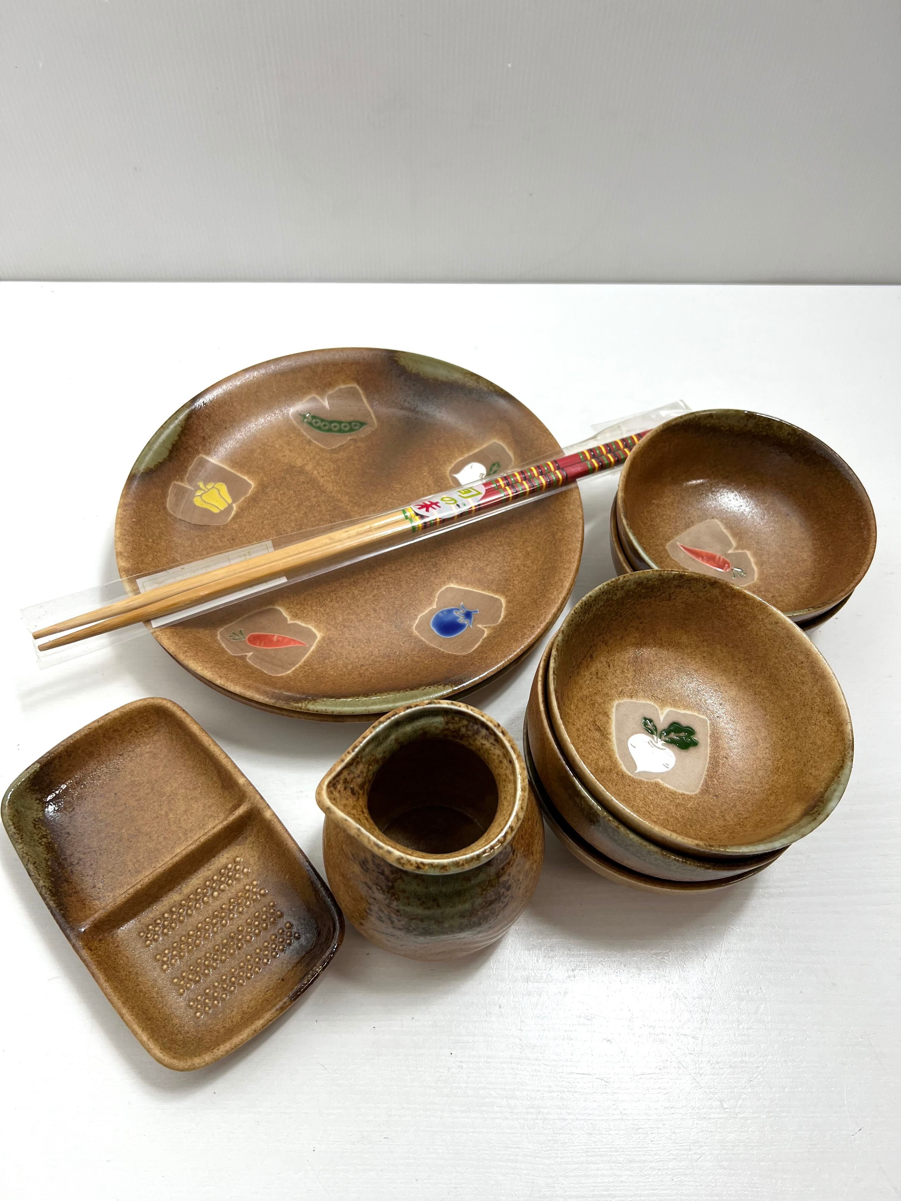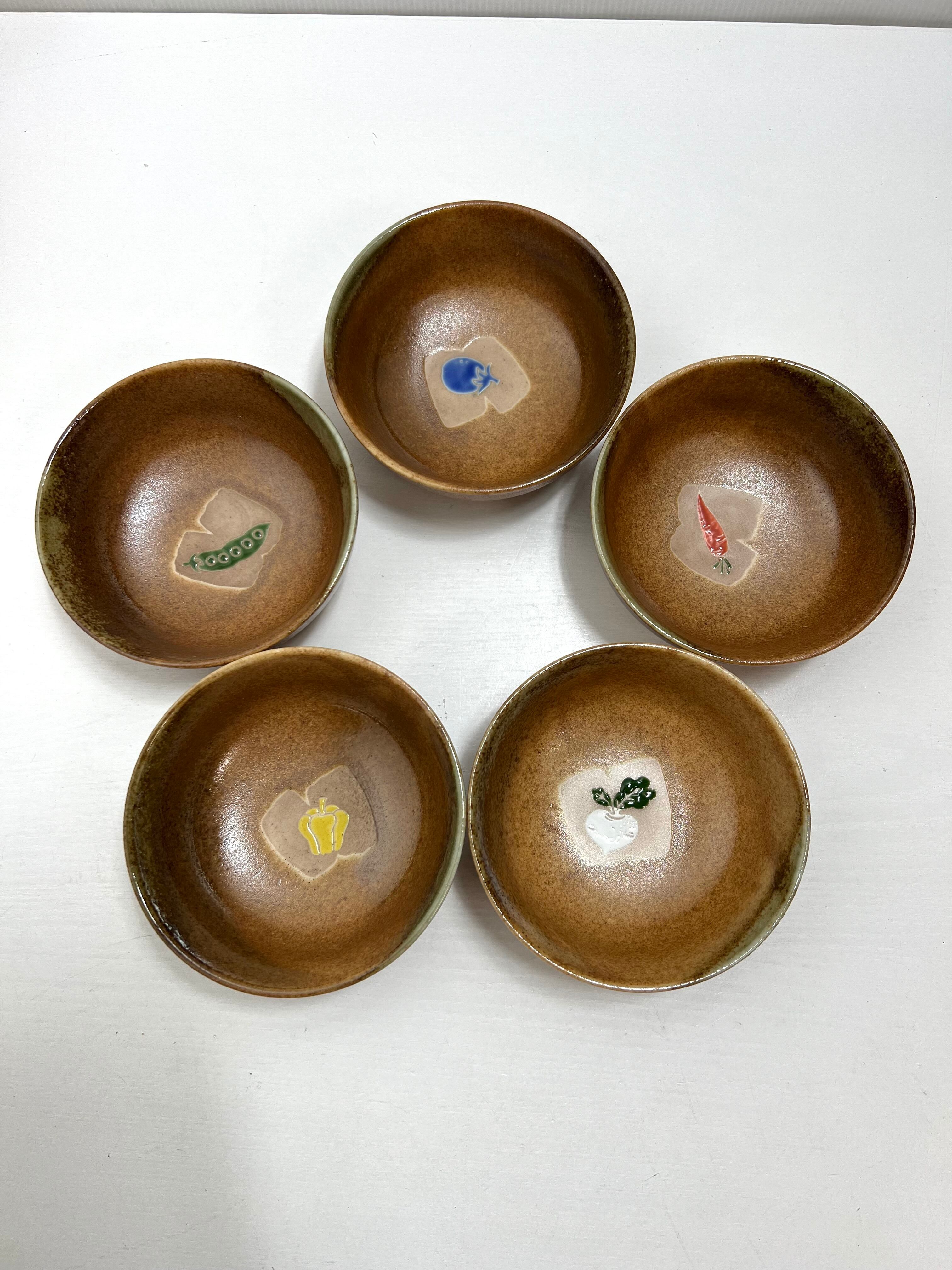 落ち着いた茶系の陶器に、丸茄子・カブ・サヤエンドウ・黄色ピーマン・にんじんの5種類の野菜がそれぞれ描かれた趣深い和食器セットです。