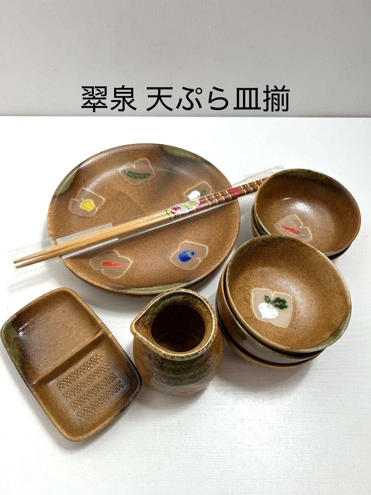 【美品】翠泉 天ぷら皿揃◆茶陶器セット とっくり/菜箸/薬味入れ/取り皿5枚/盛皿2枚◆野菜絵柄◎和食器 天ぷら器揃 和モダン