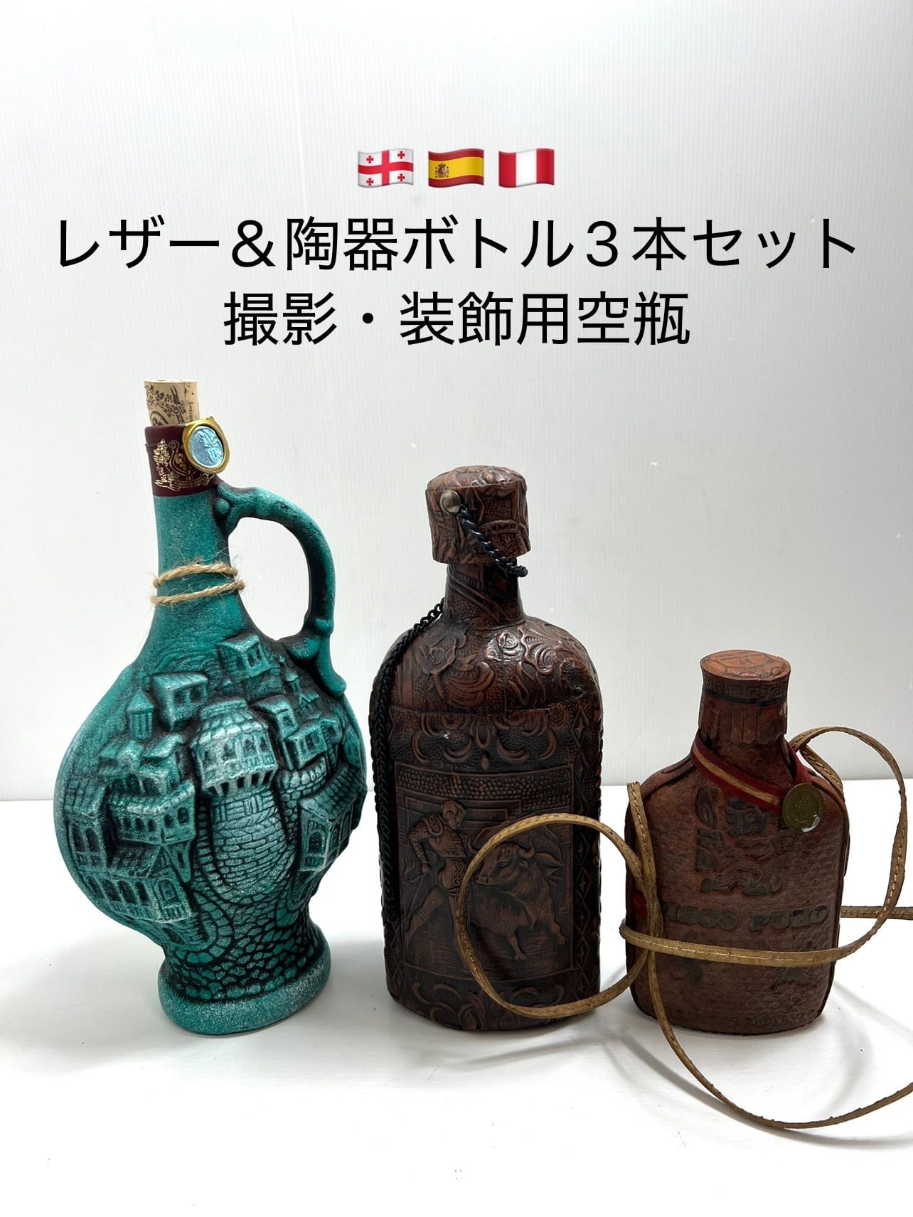 【空瓶3本セット】ワイン・ピスコ他|レザー&陶器ボトル|装飾・海外土産系