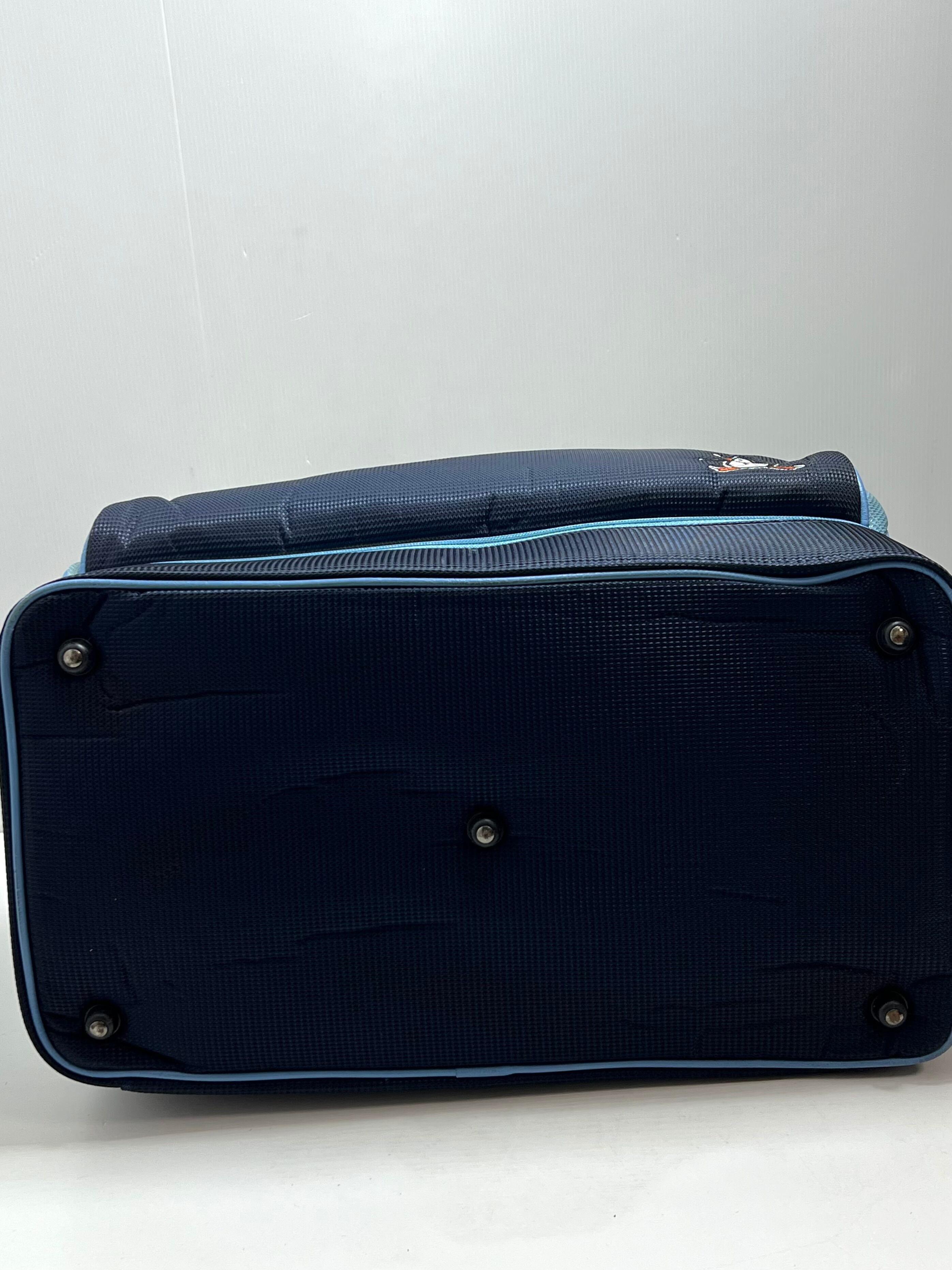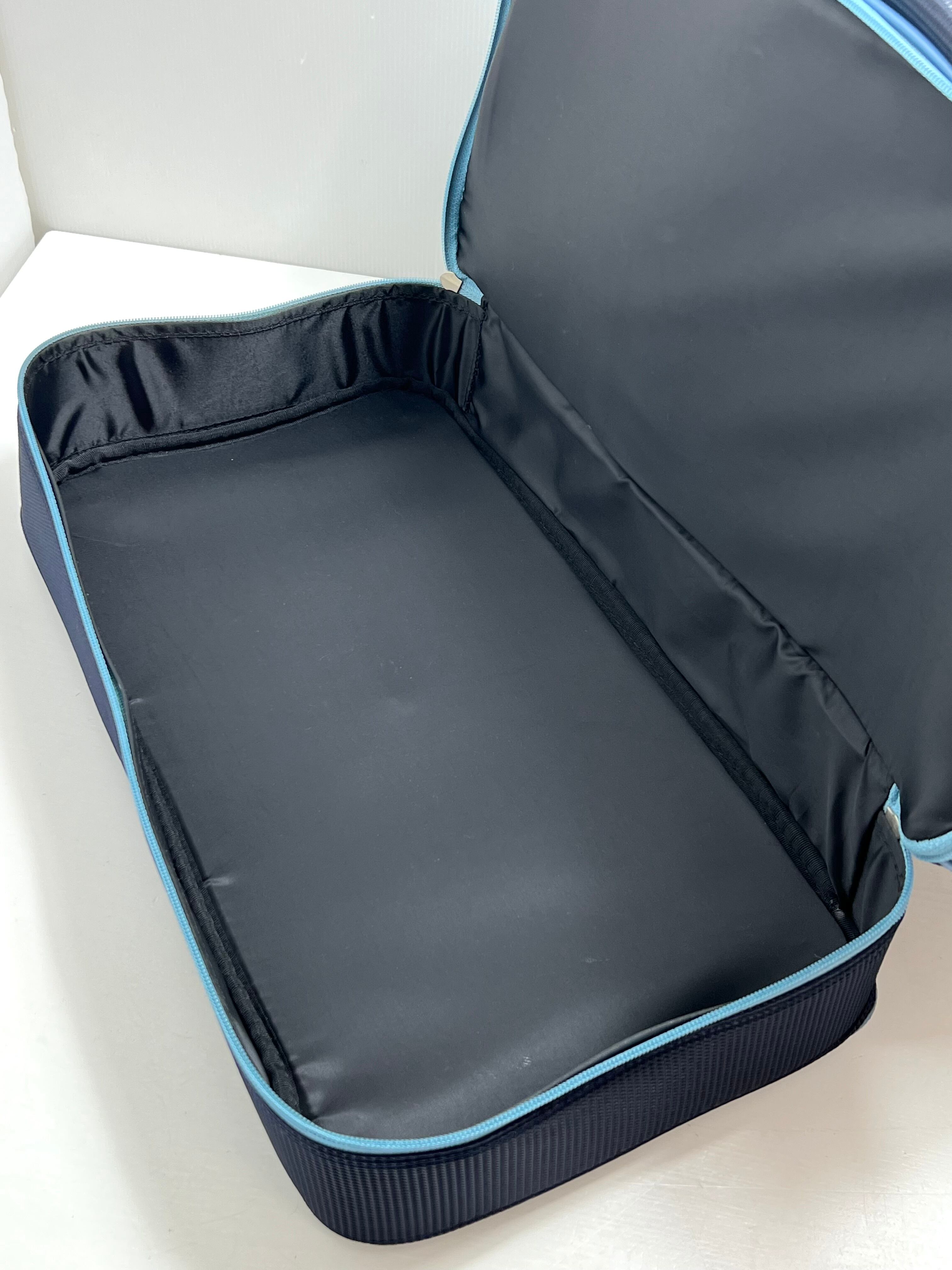 落ち着いたネイビーを基調に、水色と白がアクセントとなったスタイリッシュなデザイン。しっかりとした厚手の生地と、荷物を分けて収納できる便利な2段式仕様です。