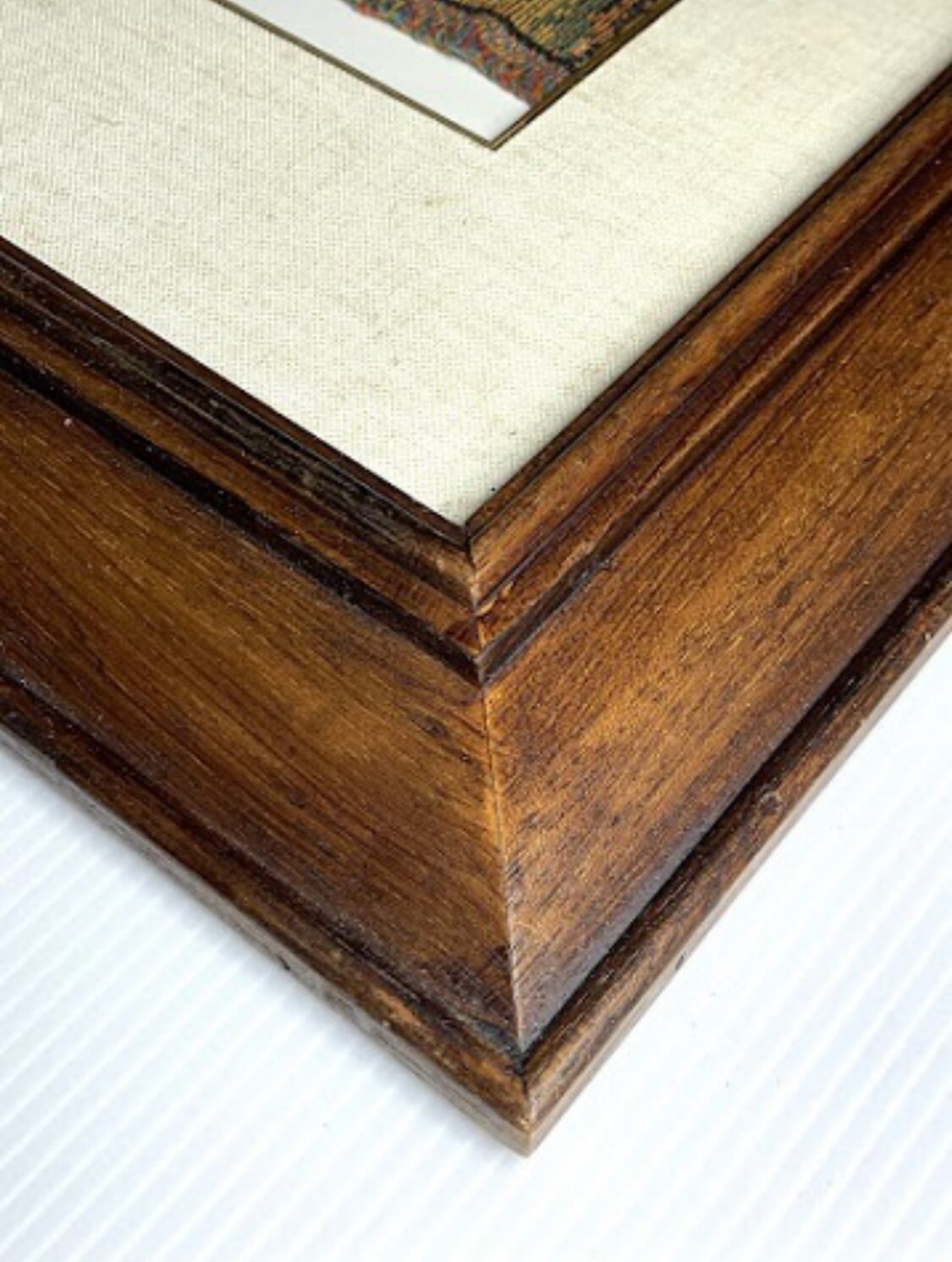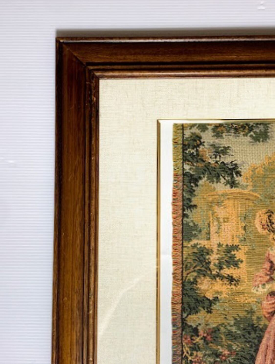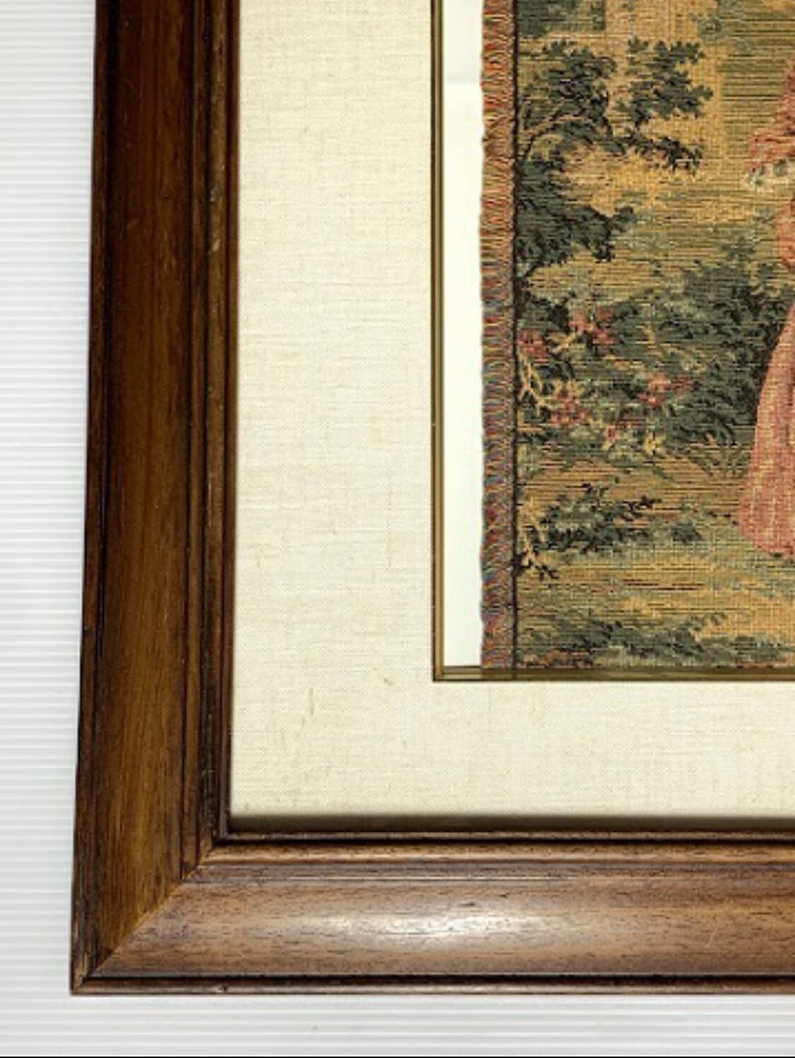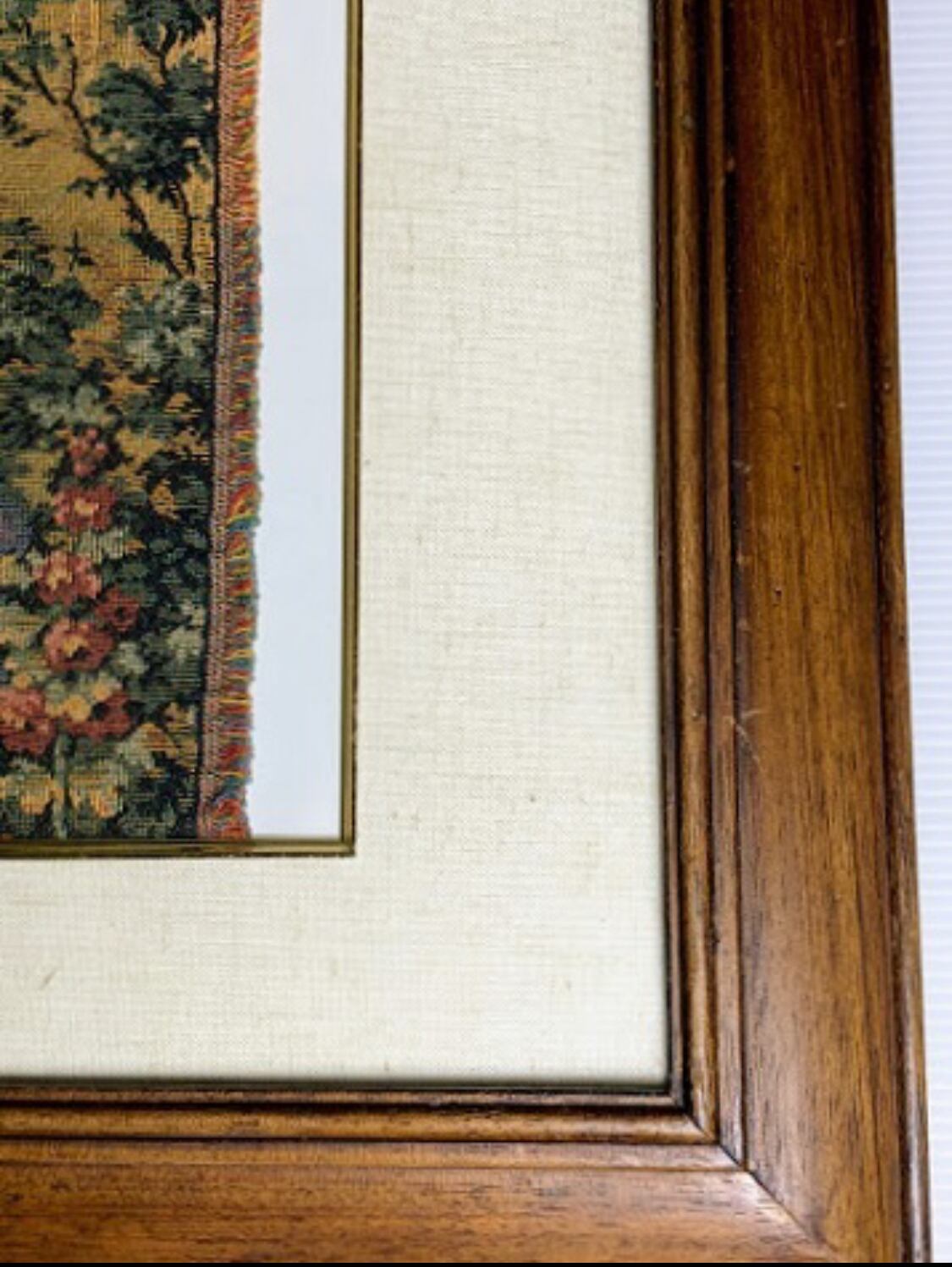 木製フレームに額装されたゴブラン織りのアンティークハンドメイドタペストリー。