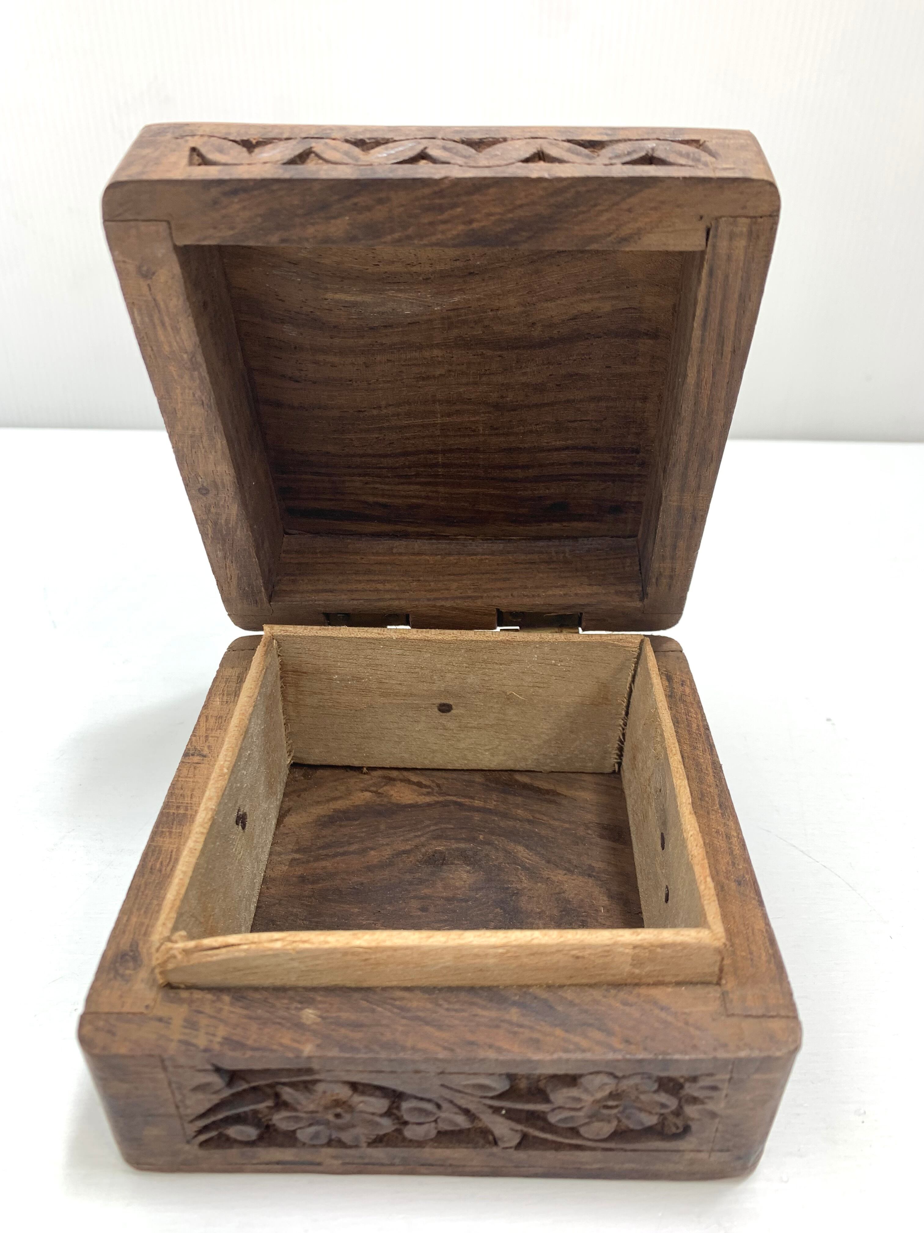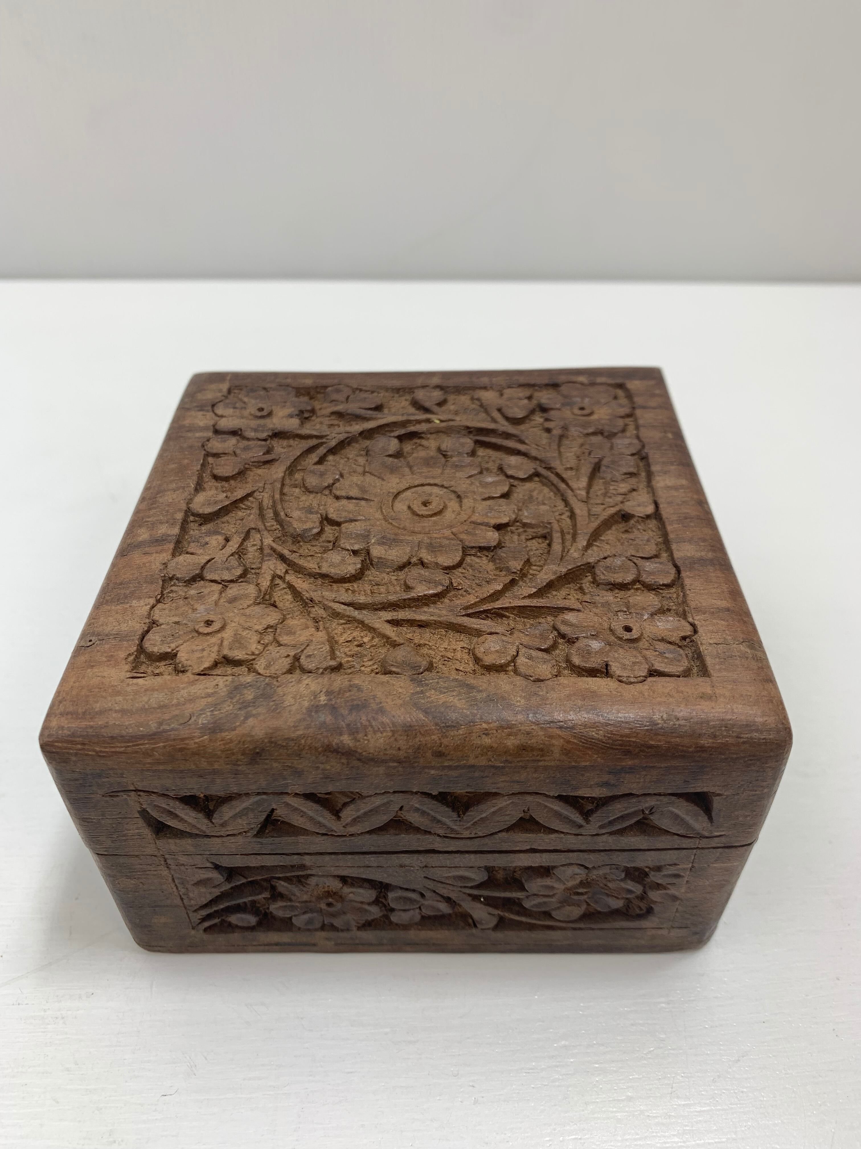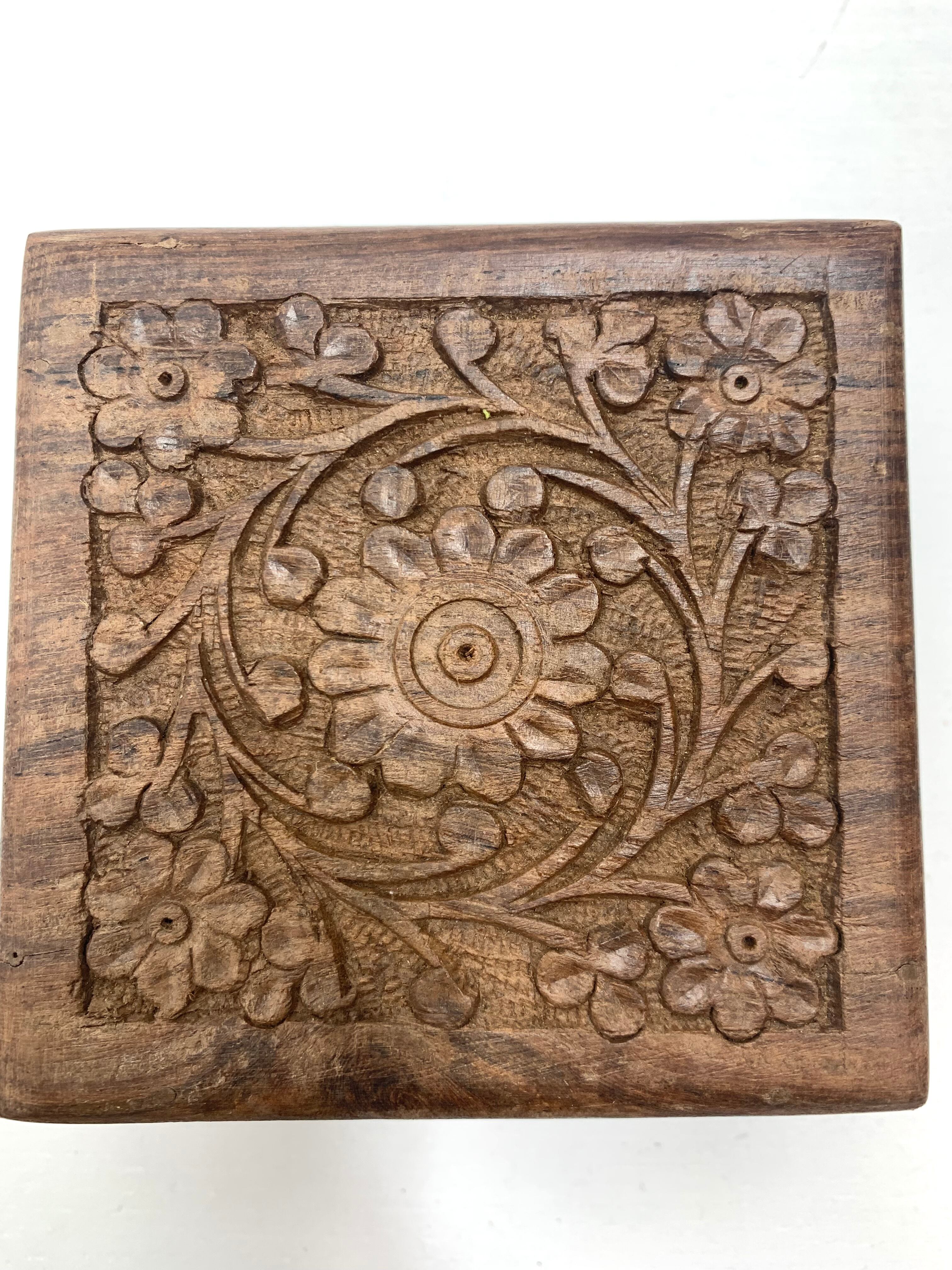 ビンテージ手彫りインドローズウッドコースター & マッチングボックスセット (コースター無し)Vintage Hand Carved Indian Rosewood Coasters & Matching Box Set