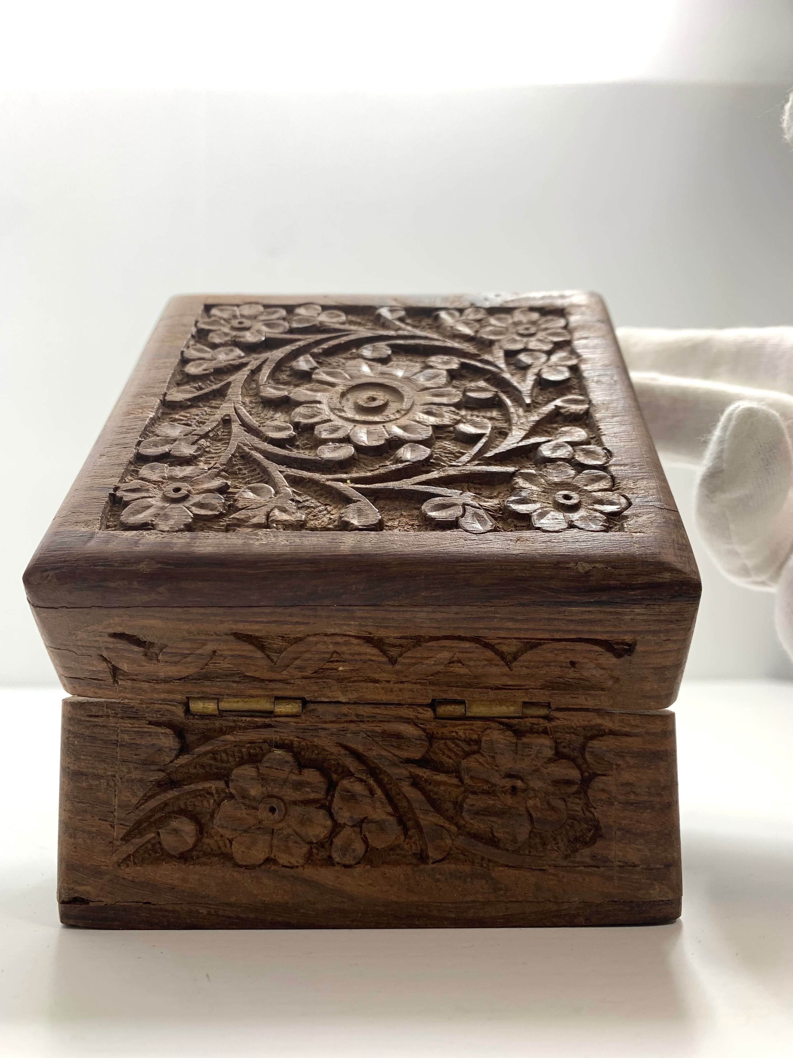 手彫りの美しいインドローズウッドボックス。緻密なディテールと美しい木の質感が特長で、どんなインテリアにもマッチします。手作業で丁寧に彫られたインドの伝統文様が、上品さとエキゾチックな雰囲気を演出します。耐久性にも優れており、長くお使いいただけます
