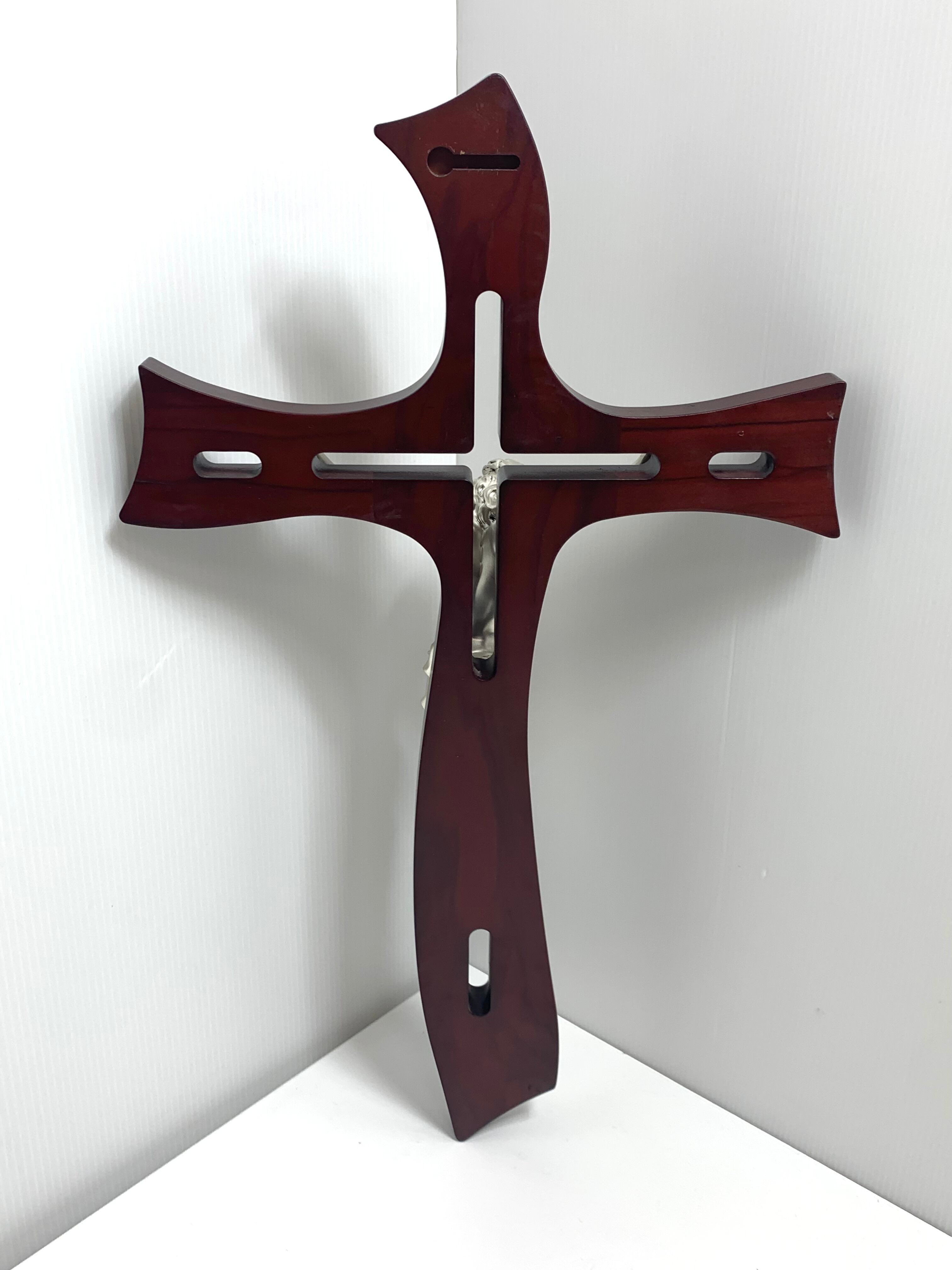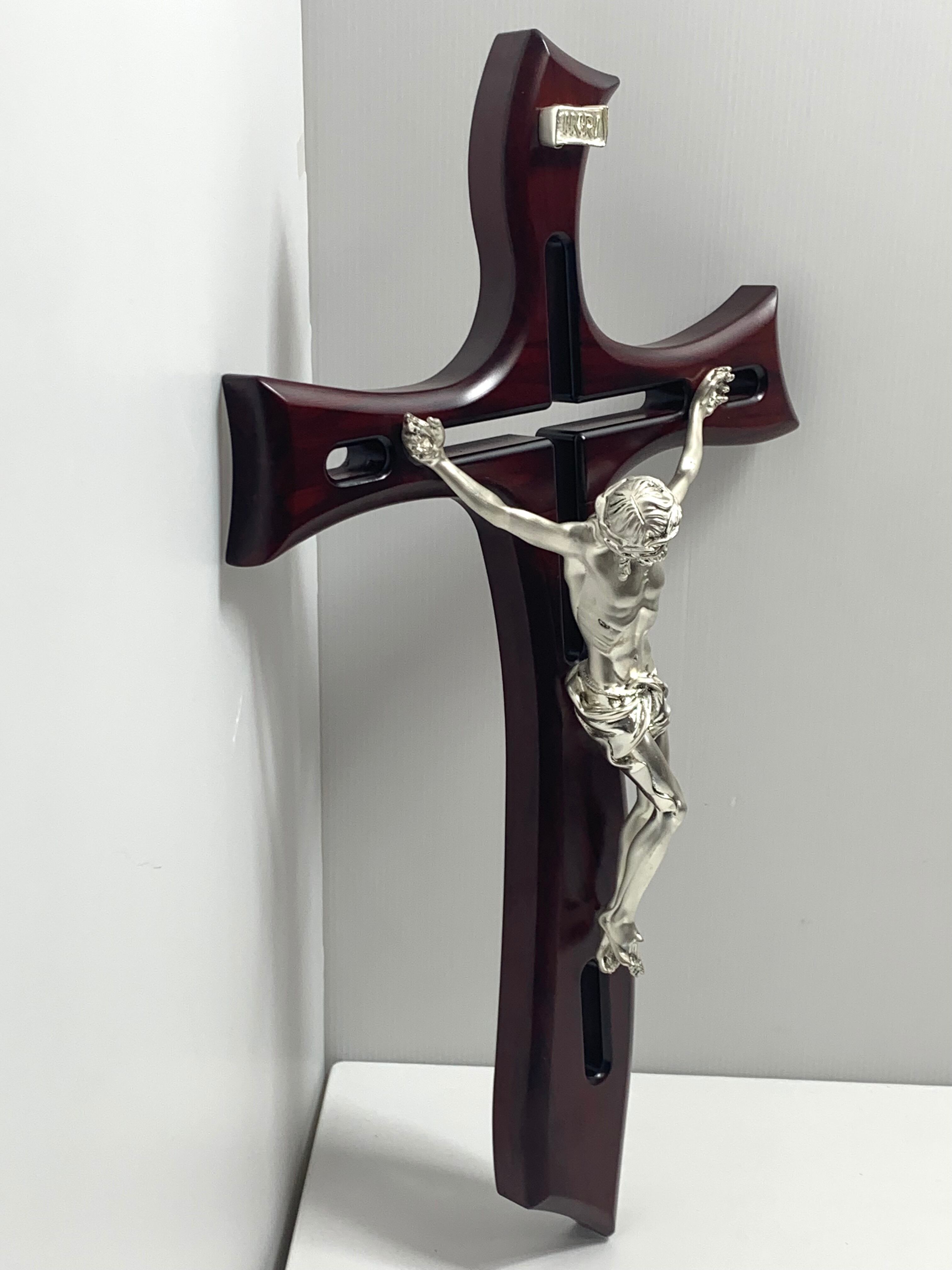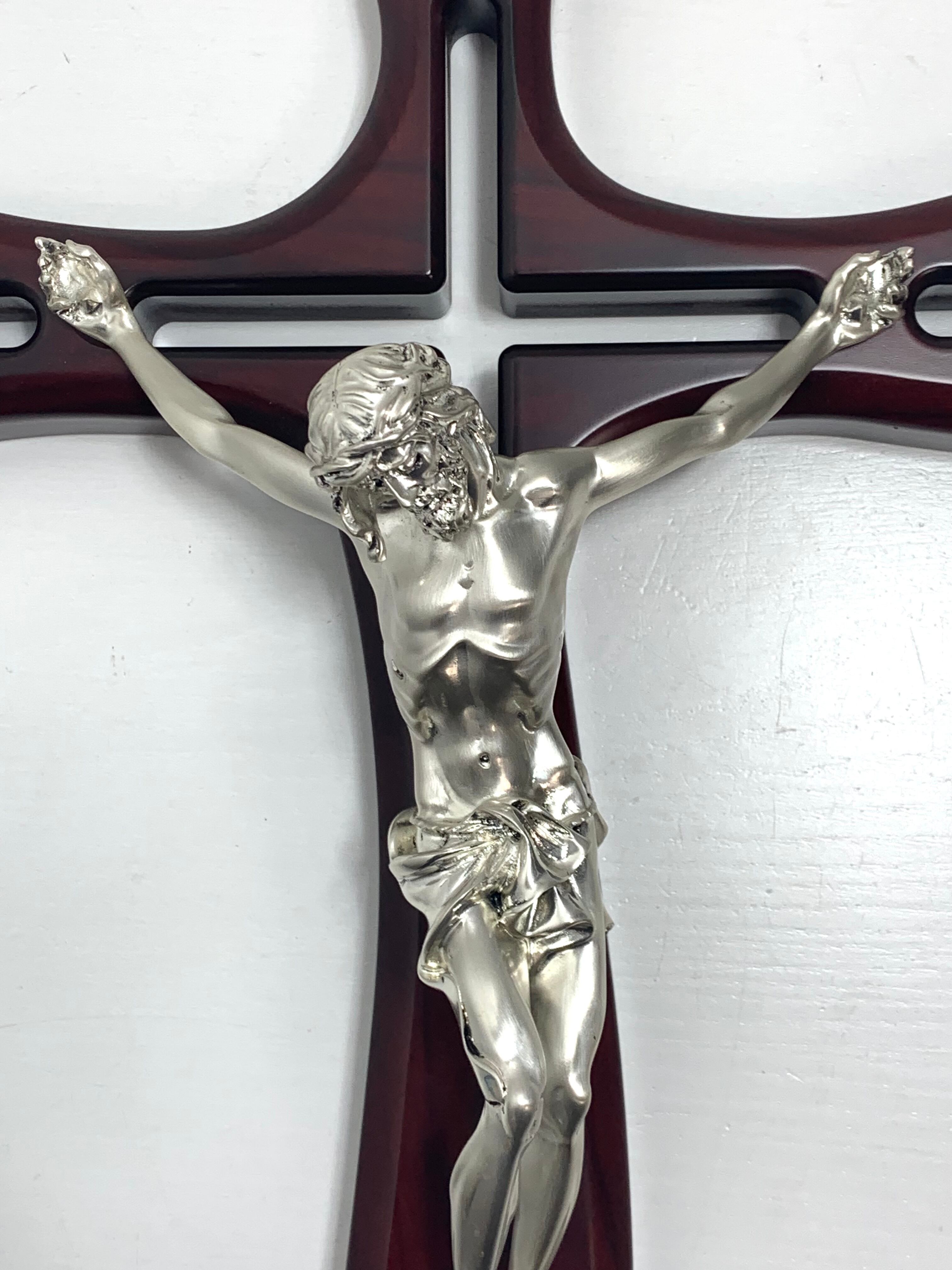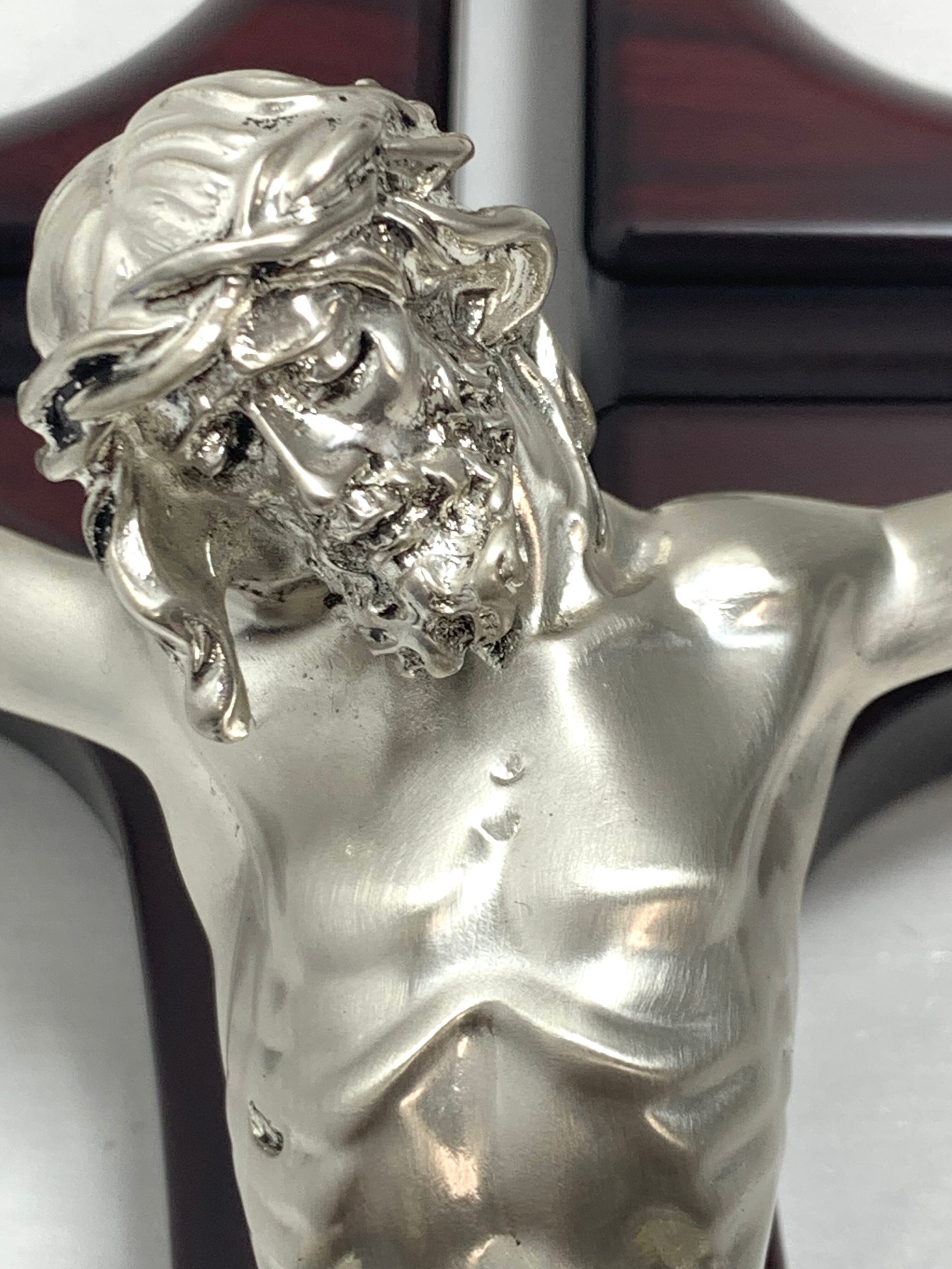キリスト樹脂シルバーのマホガニークロス。マホガニー材で作られた十字架と、銀の樹脂で作られたキリストの体。