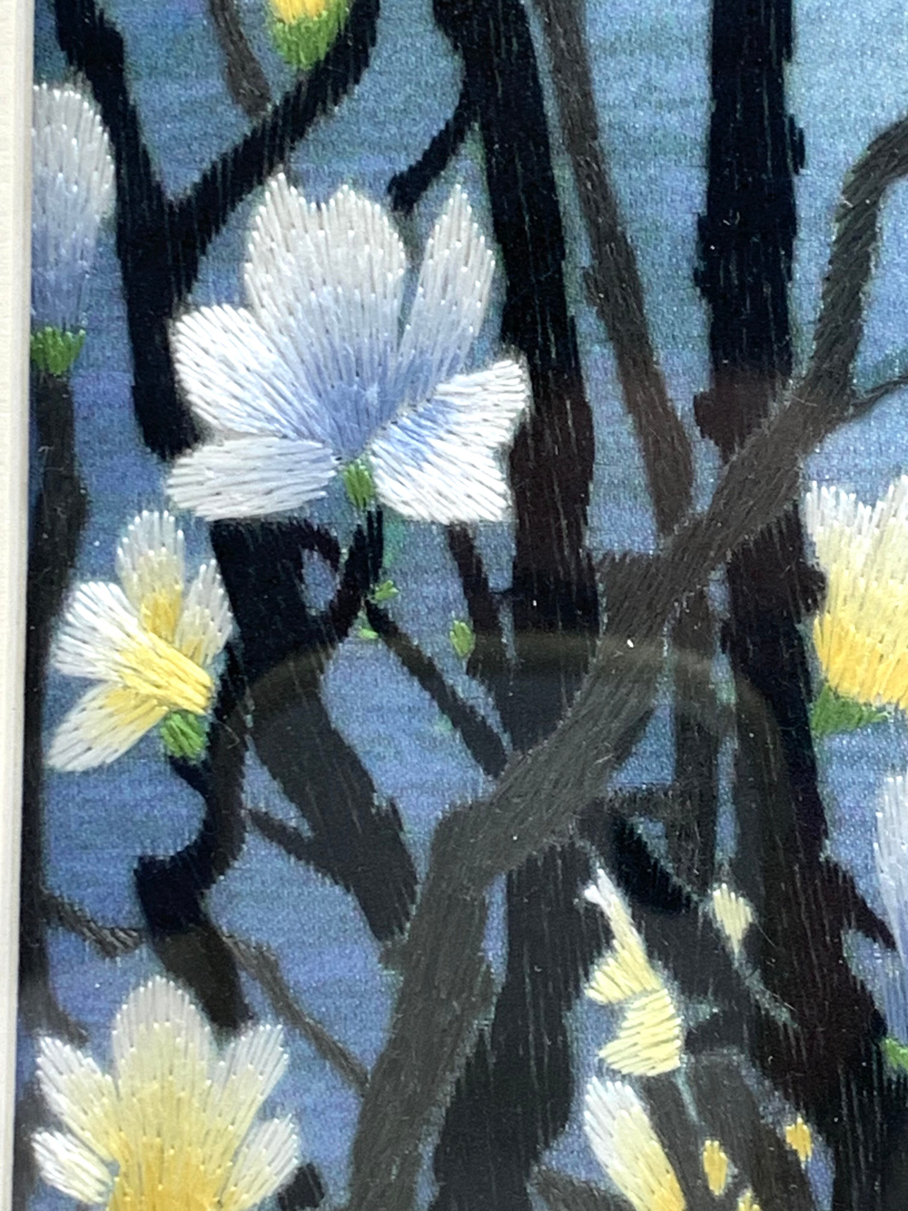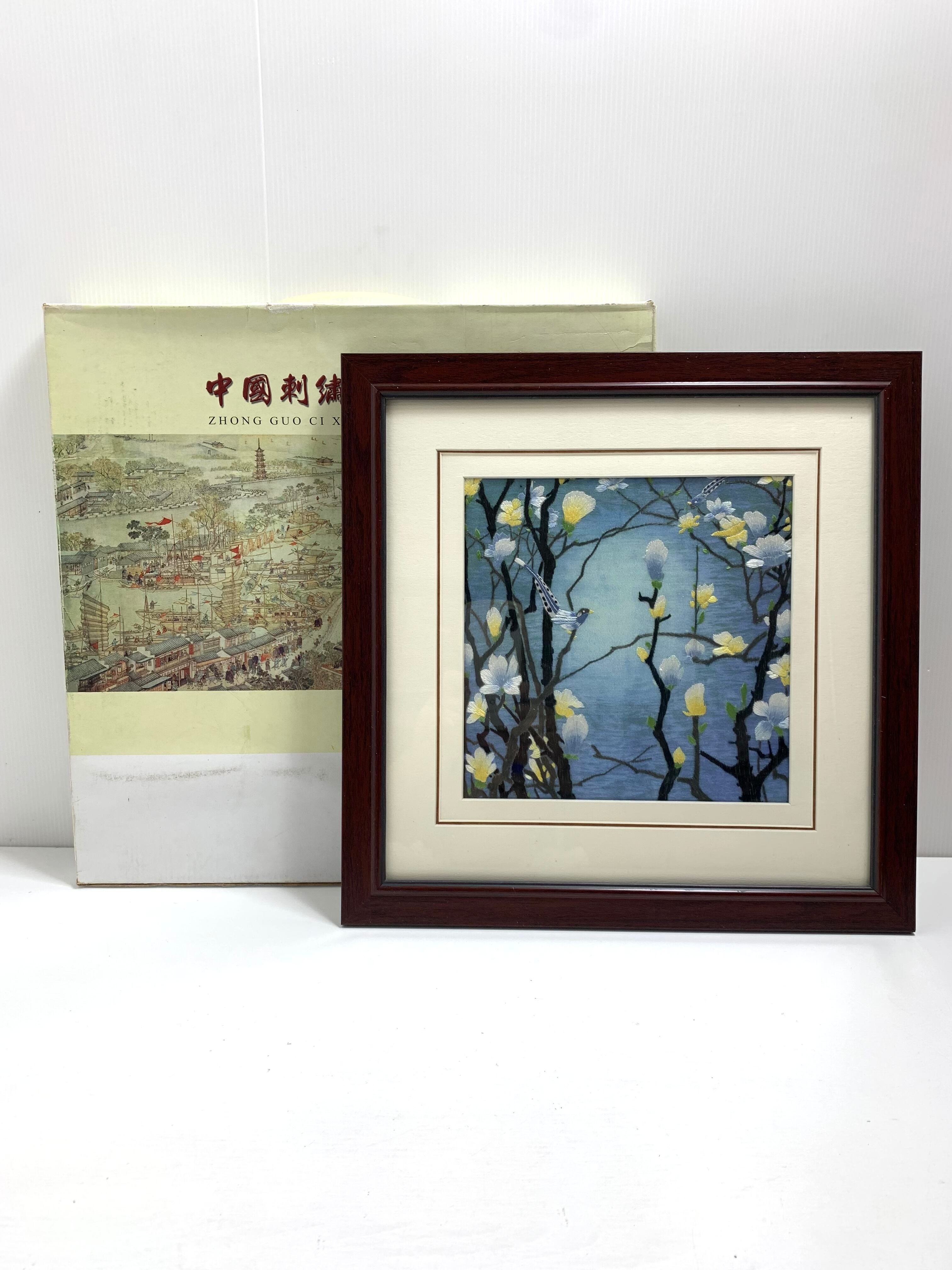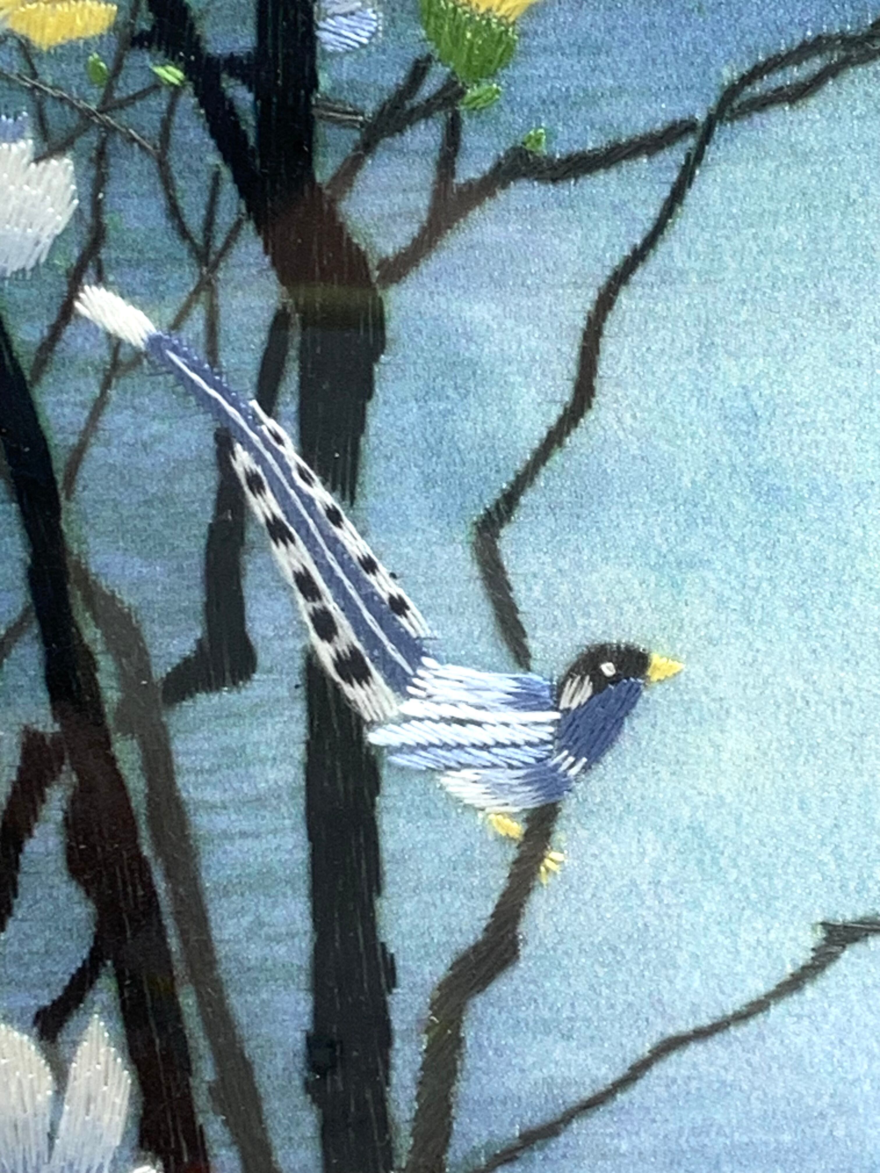 中国刺繍芸術精品、蘇州刺繍。その中でも、木々に止まる鳥を描いた春の風景は、芸術と工芸の融合が見事な一品です。手作業で丁寧に緻密に織り込まれた刺繍は、まるで絵画のような美しさ。