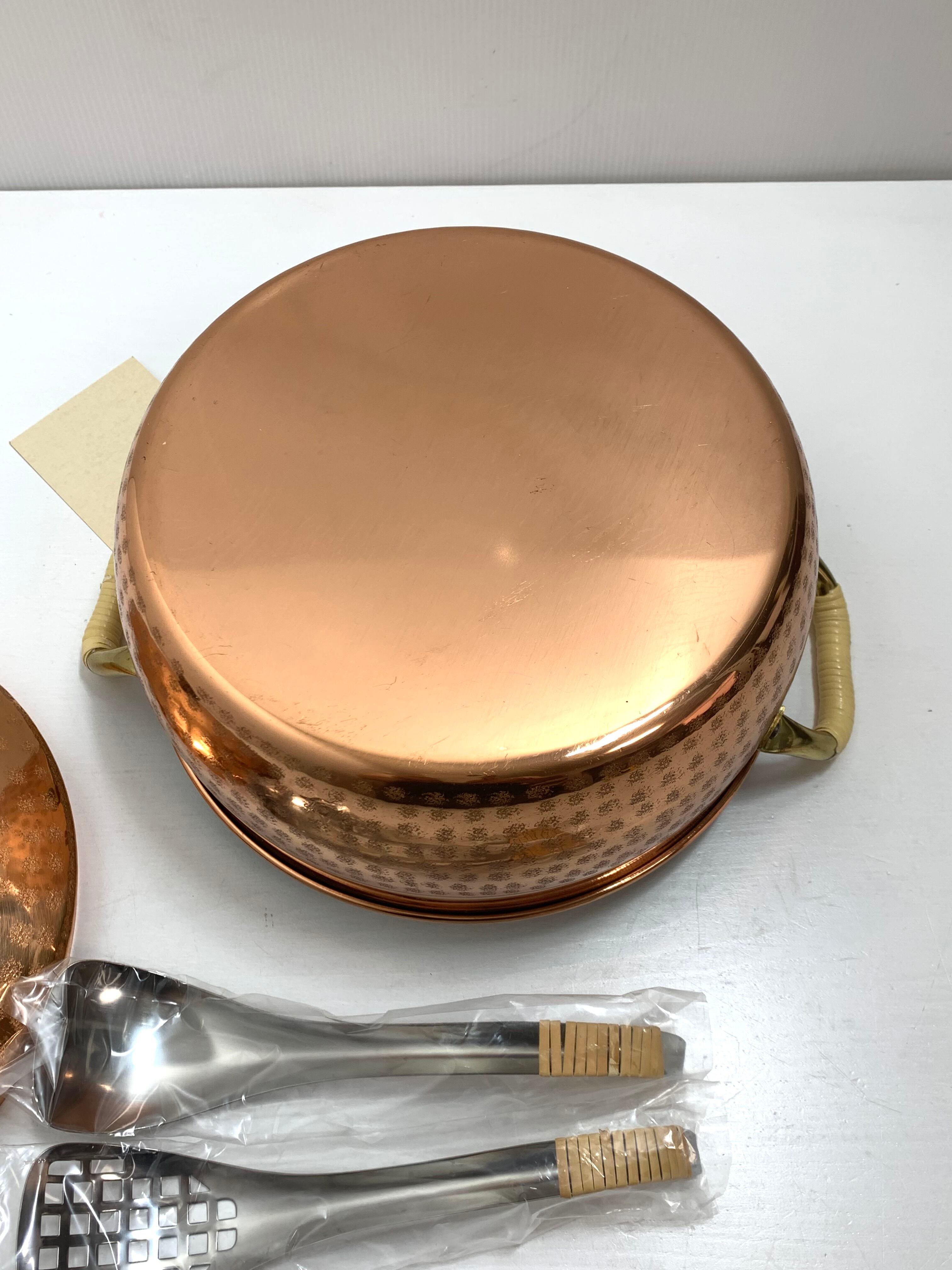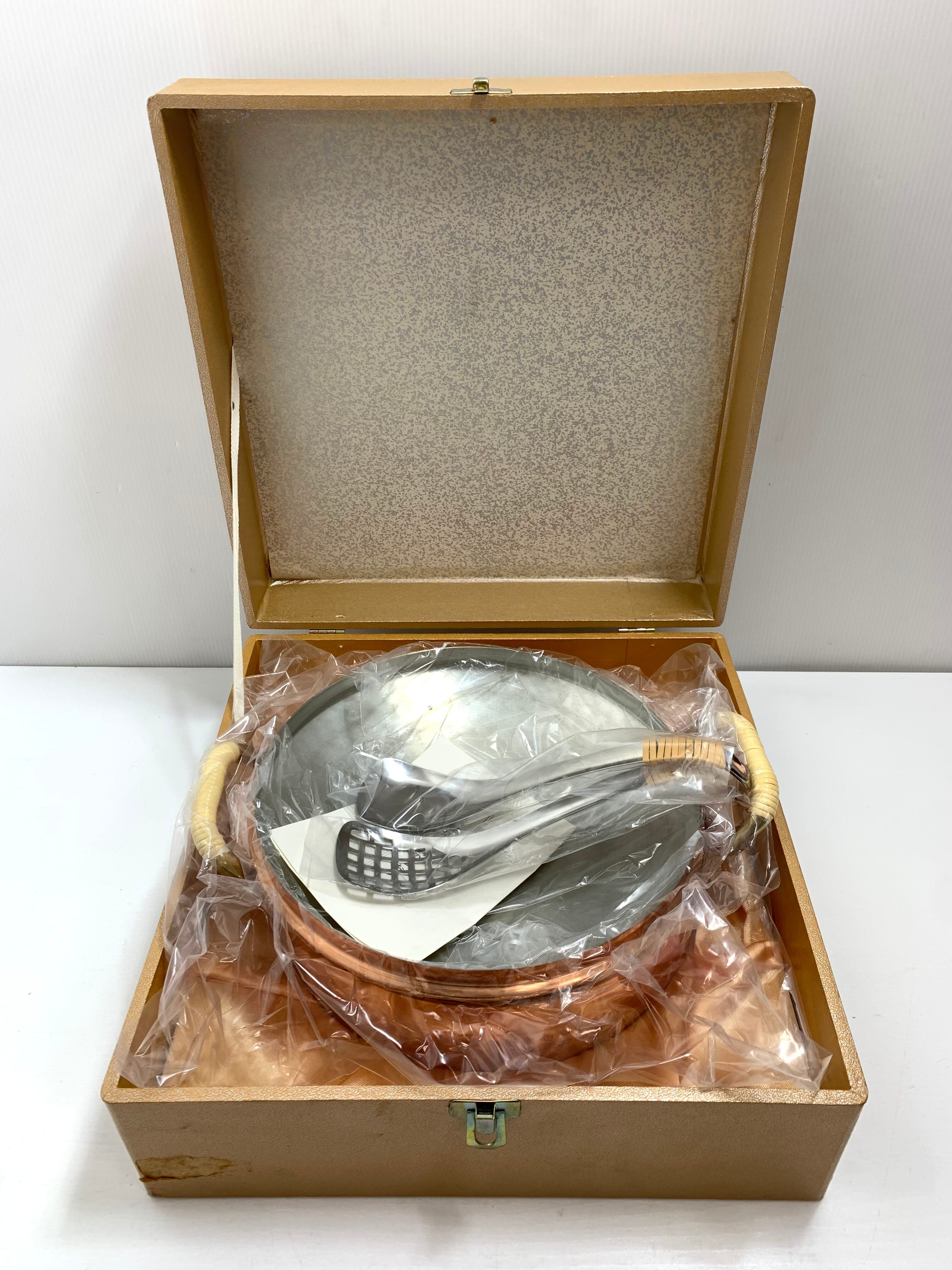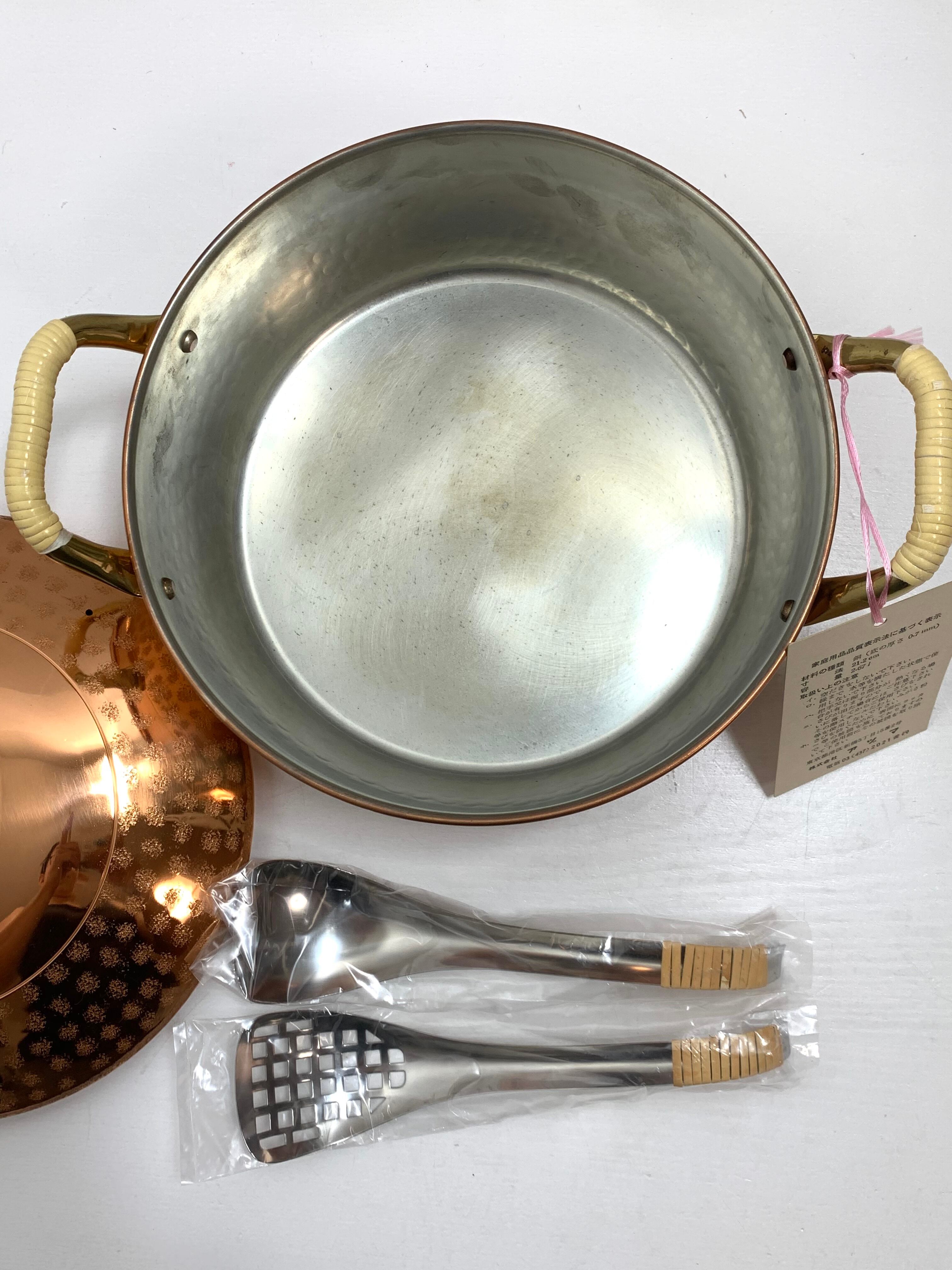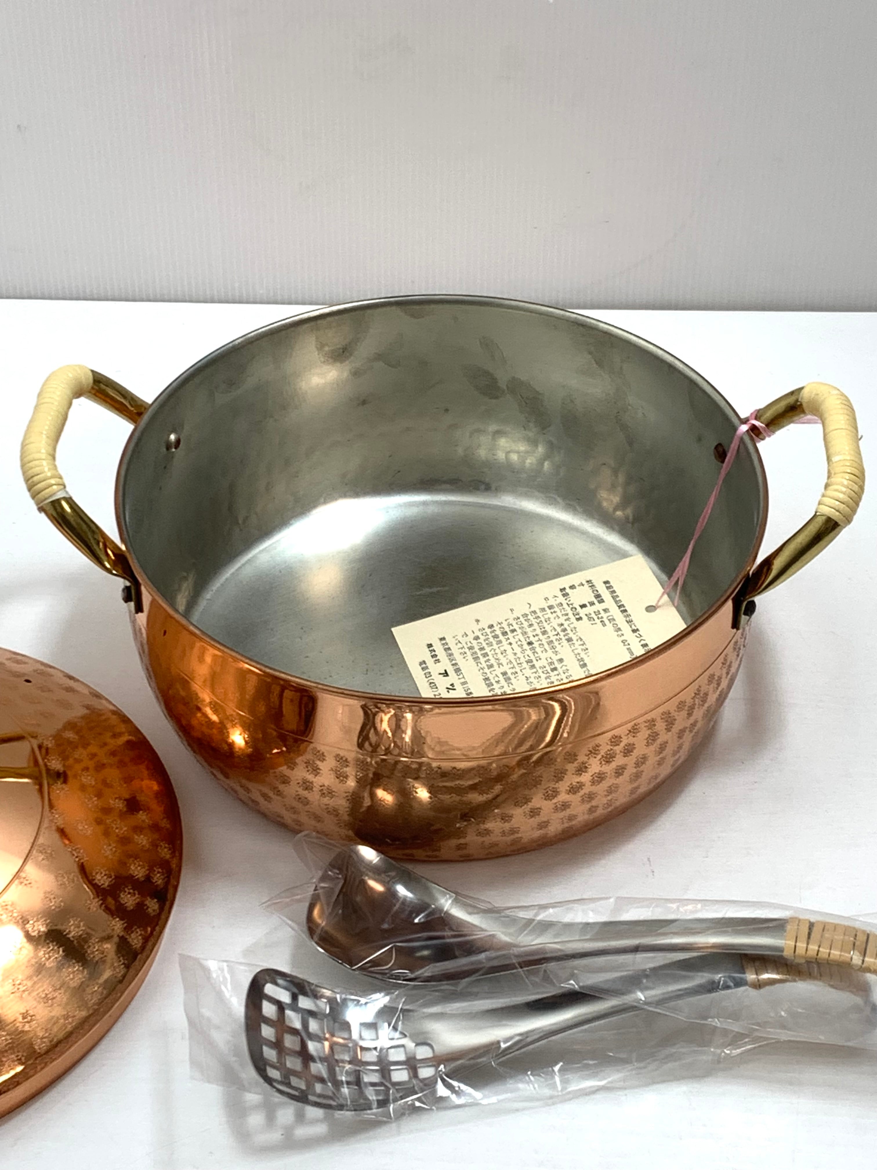 銅製タイコ鍋 両手鍋 鍋外側純銅,鍋内側純錫メッキ加工 穴あきレンズ&レンゲ付