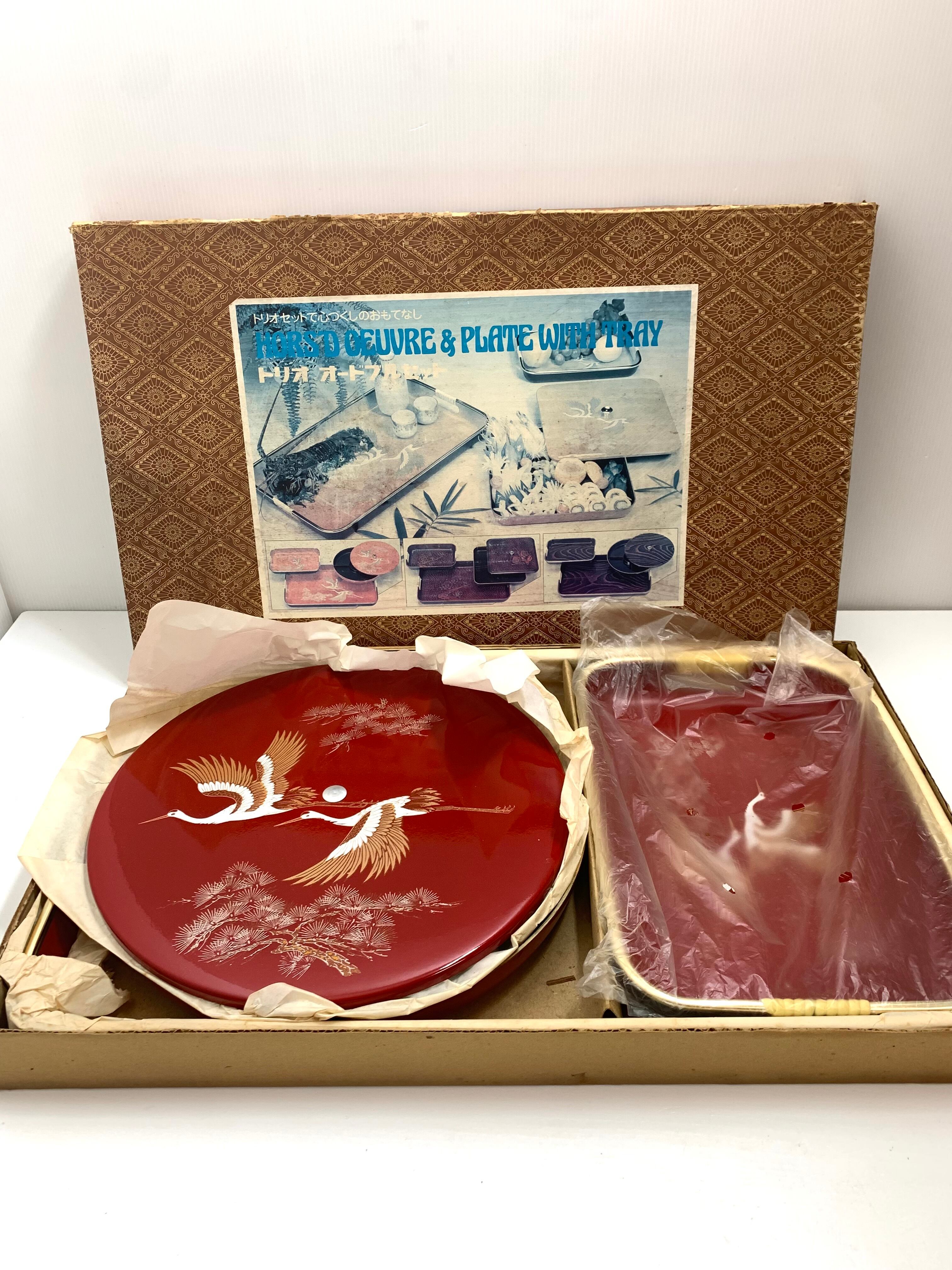 トリオオードブルセット長手盆大小 オードブル仕切り丸皿 寿鶴 木製トレイ おもてなしセット 昭和