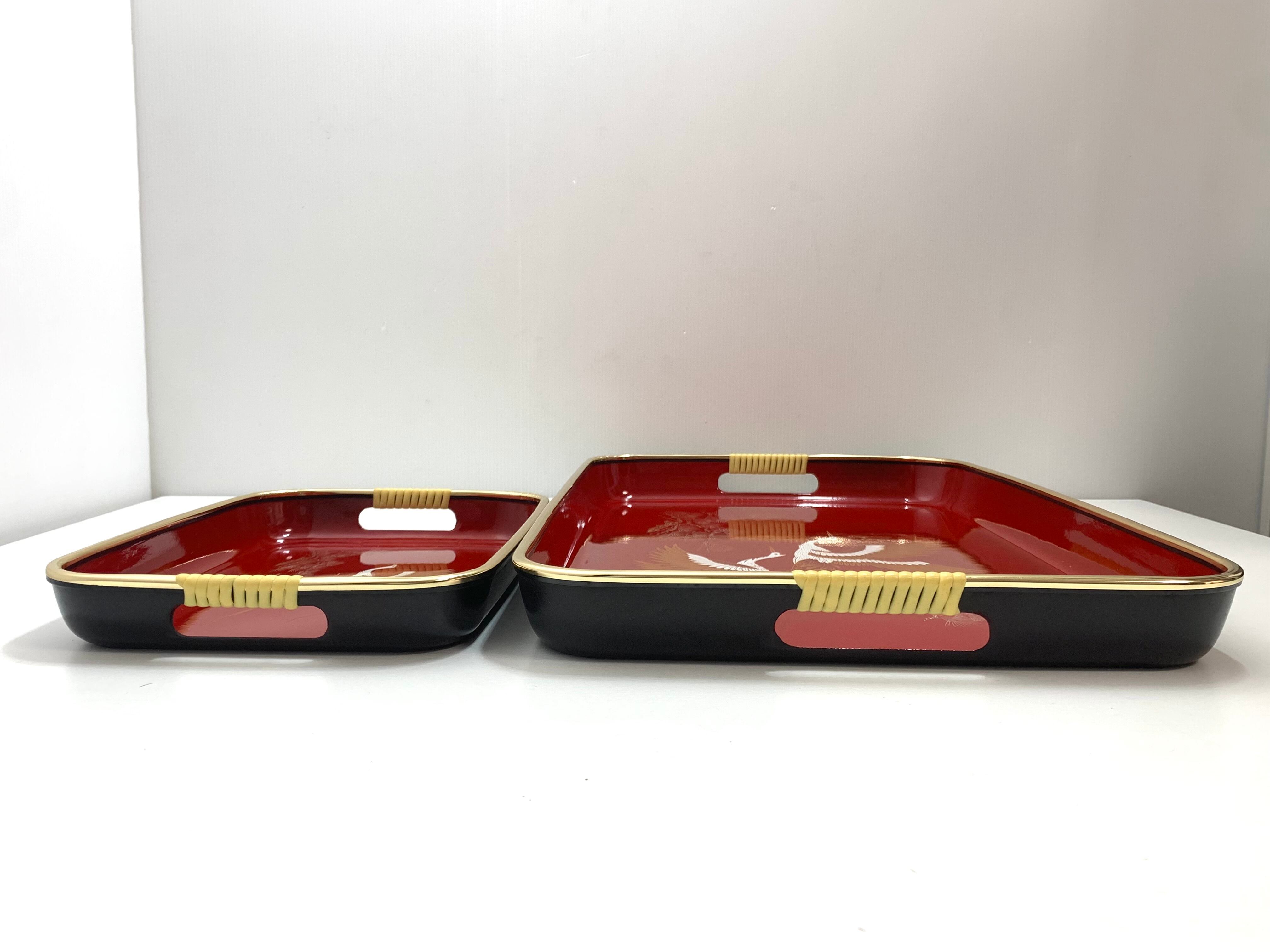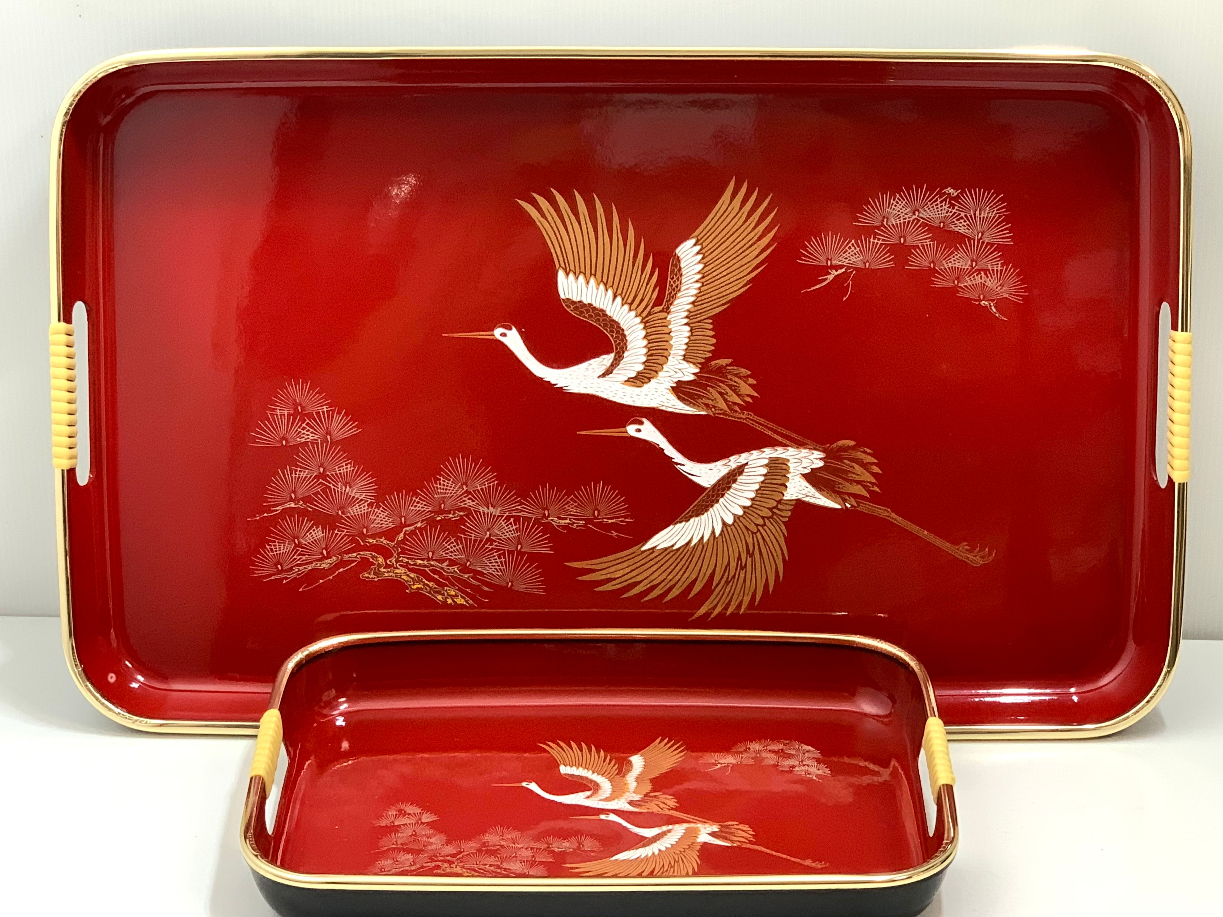 トリオオードブルセット長手盆大小は、おもてなしの心を大切にする方におすすめです。昭和のレトロな雰囲気が漂うセットは、大小の長手盆とオードブル仕切り丸皿がセットになっています。寿鶴のデザインが施された木製トレイです。
