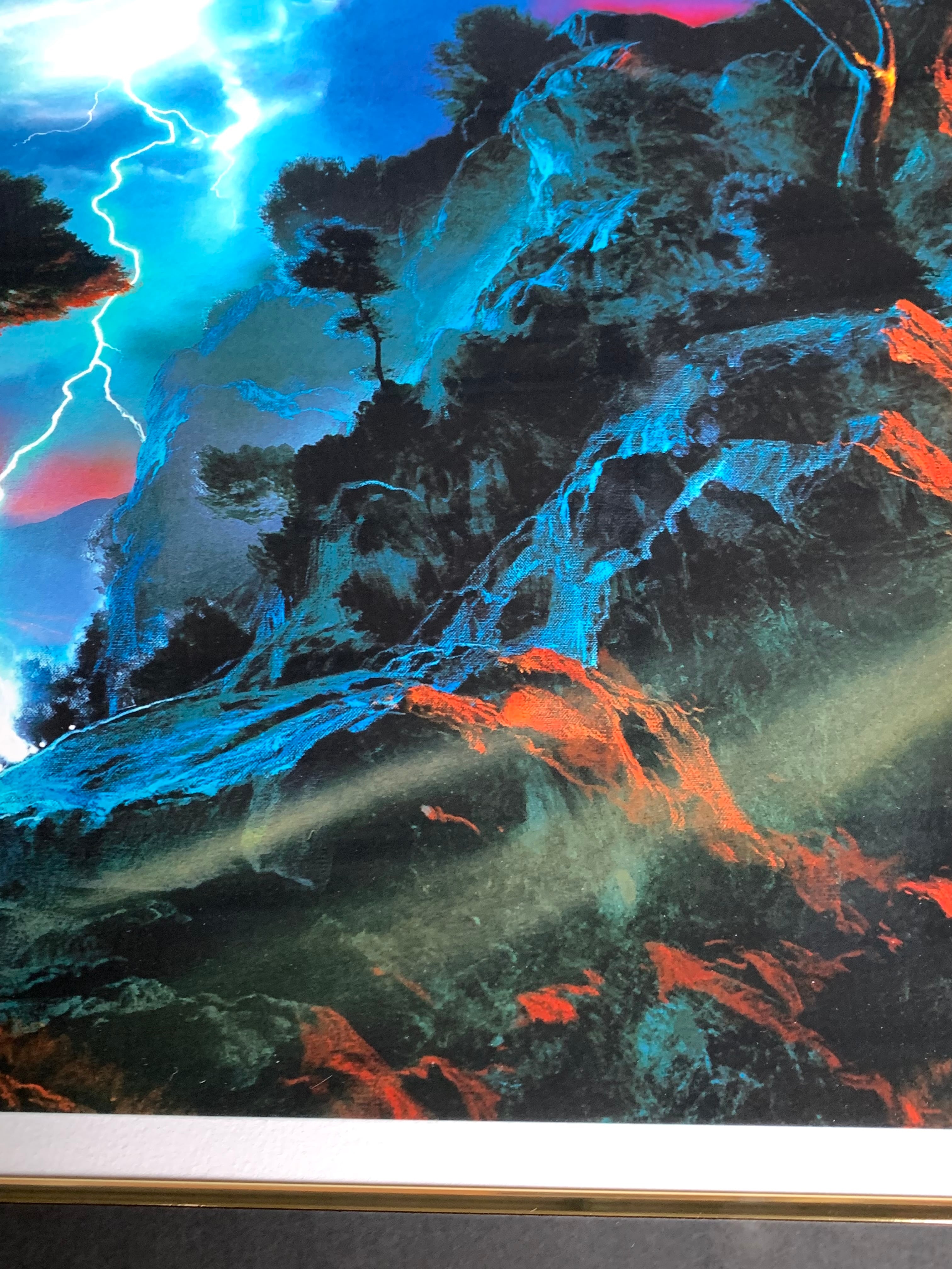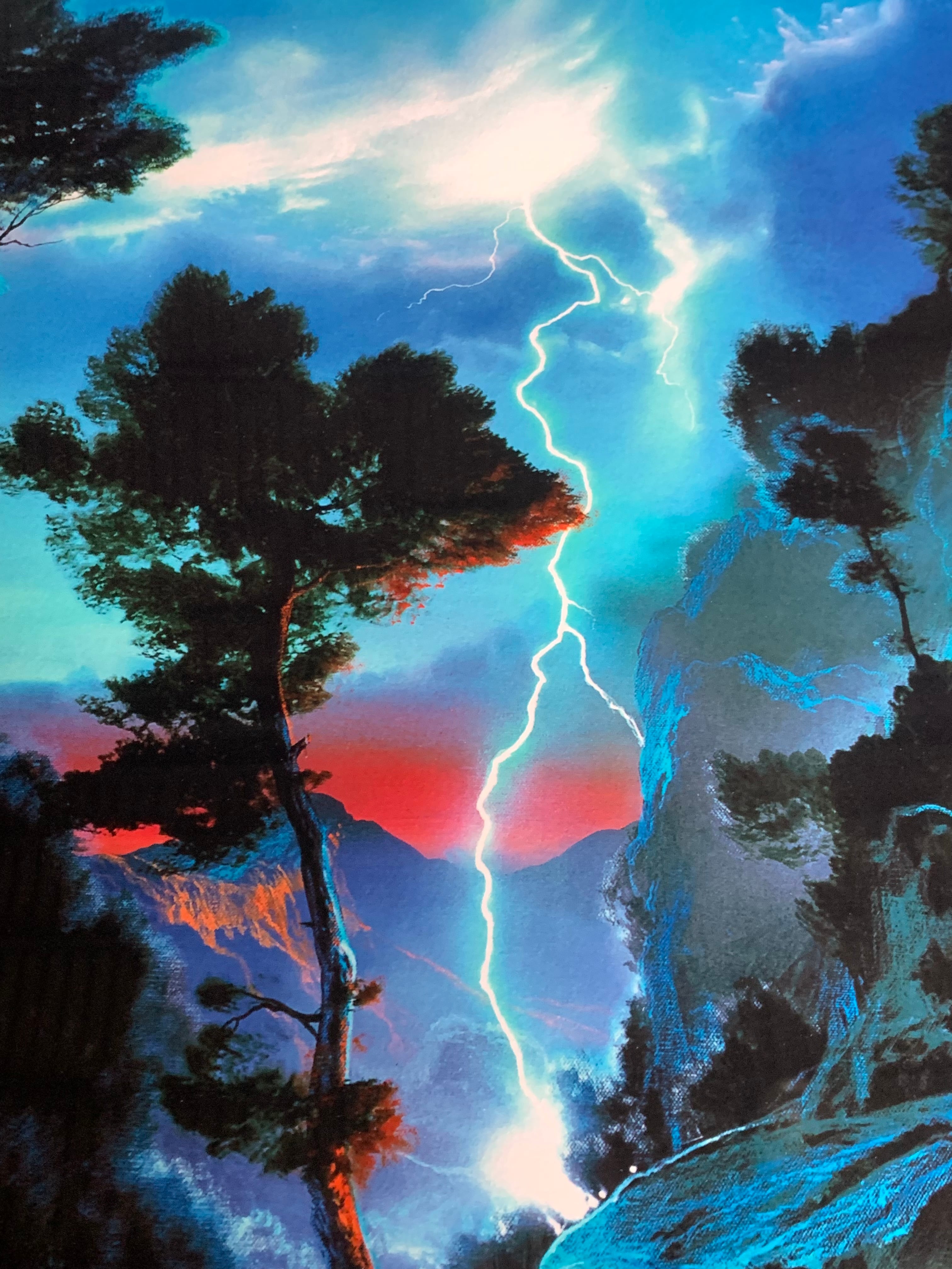 壮大な自然の情景とドラマチックな光が融合した、ディル・ターブッシュのオリジナル作品「永遠のダンス」をご紹介いたします。この作品は、深い青と黒、夕陽の光によって描かれた幻想的な世界を表現しています。空に走る稲妻が見事に描かれ、雲は深い青で覆われながらも、稲妻周辺が白く輝いています。画面右下からは、崖の合間を縫うように斜めに差し込む夕陽の光が描かれ、その強い光が中央へと広がることで、作品全体に神秘的な雰囲気をもたらしています。崖に生える黒い木々も、この情景に力強さを加えています。