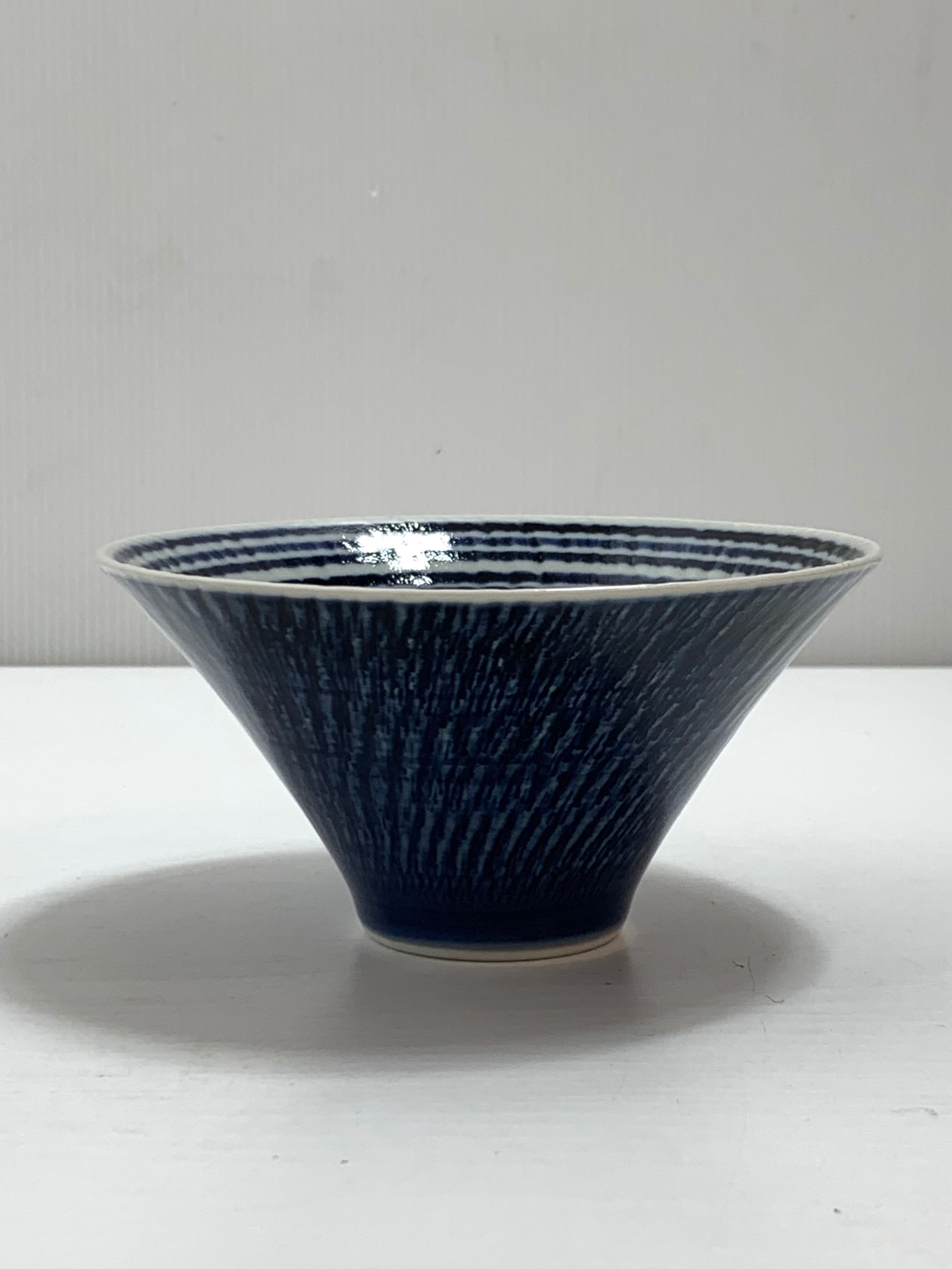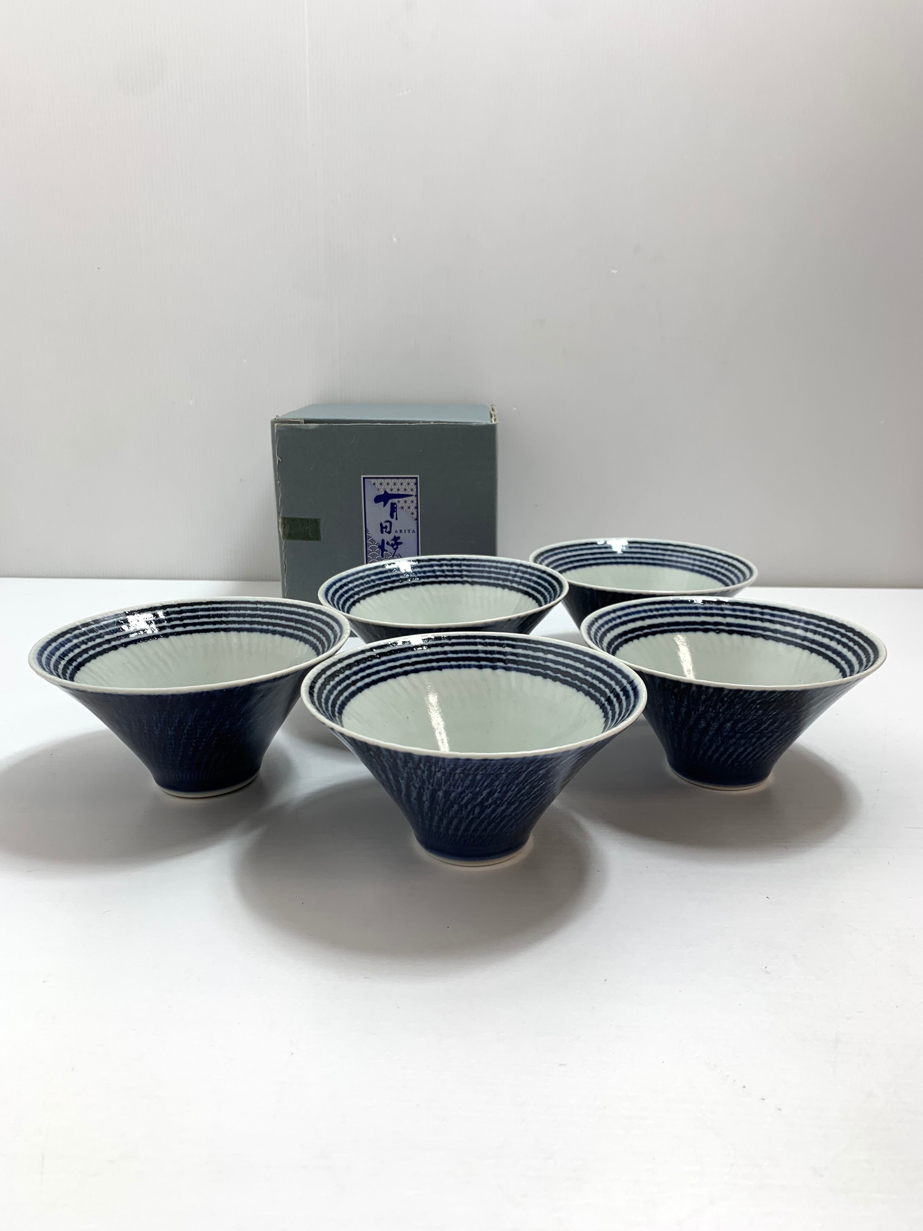 深い紺地に「飛びかんな」のような削り模様が施された、モダンな雰囲気の反鉢(円錐茶碗)5客セットです。