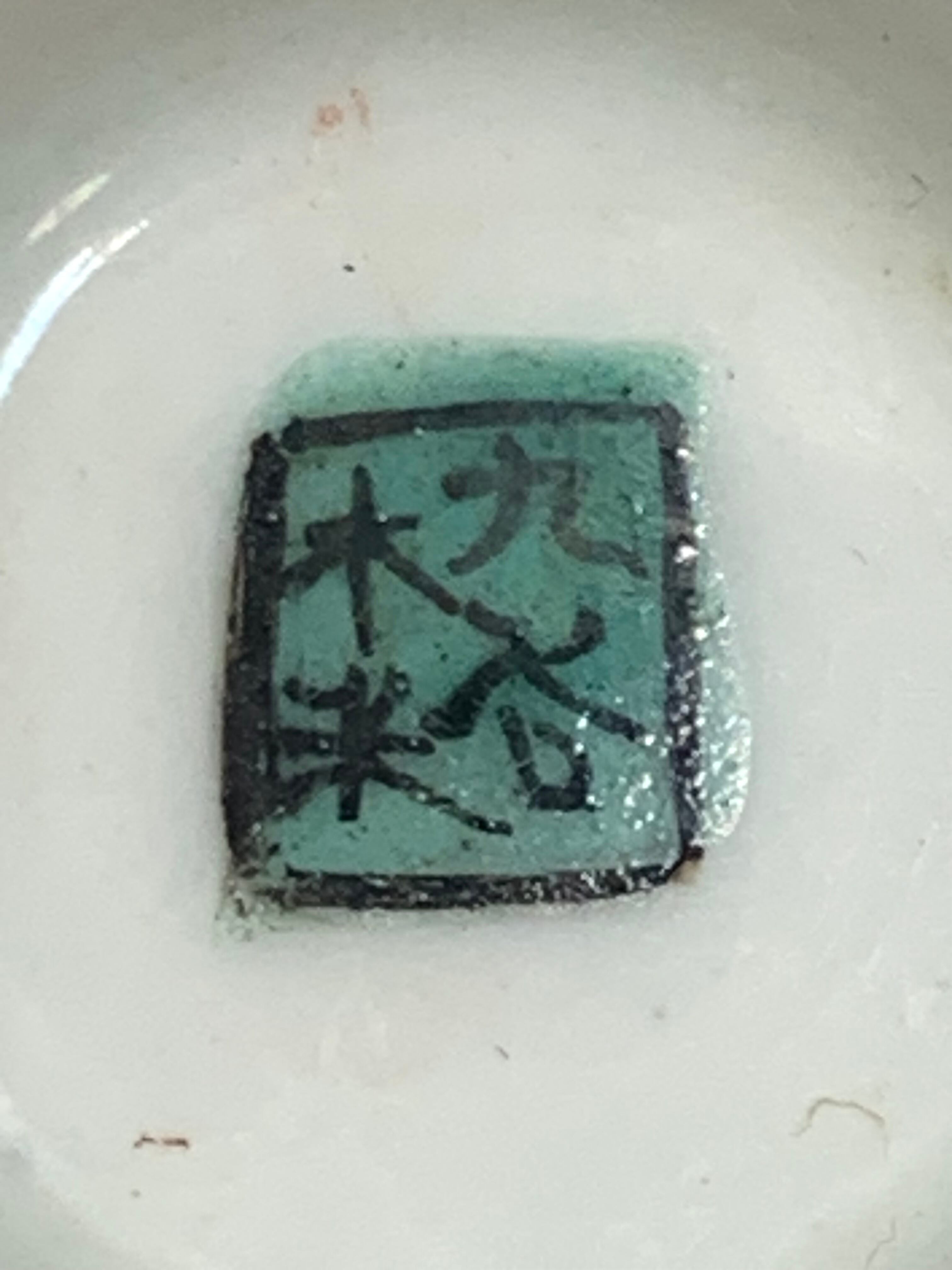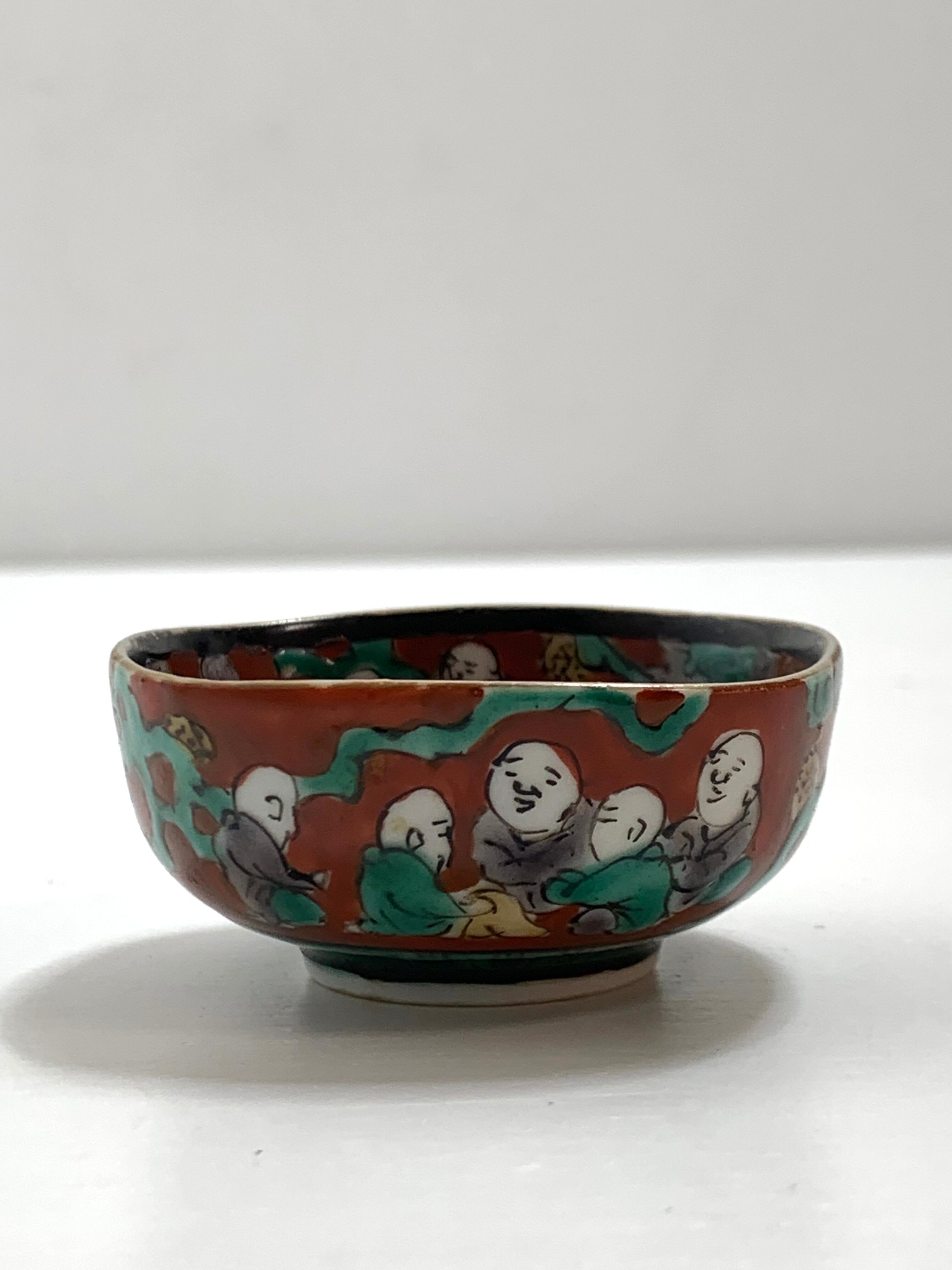 伝統的な九谷焼の魅力が詰まった木米風の四角い盃です。裏面には「木米」と描かれており、その名前に由来する中国の陶芸家木米(モクベイ)からインスピレーションを得た作品です。中央には鯉に乗る三人の人物が繊細に描かれ、物語性や神話的な要素を感じさせる絵柄が魅力的です。