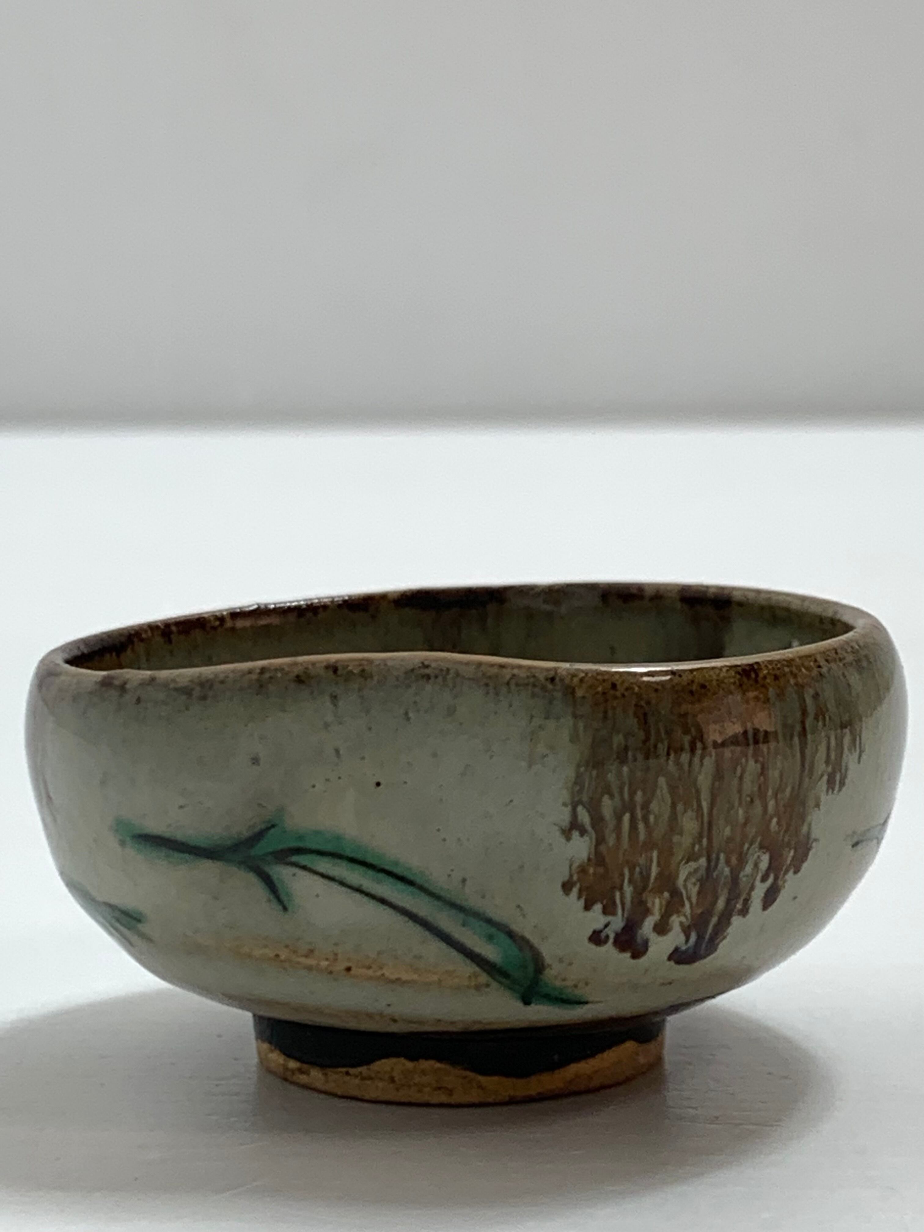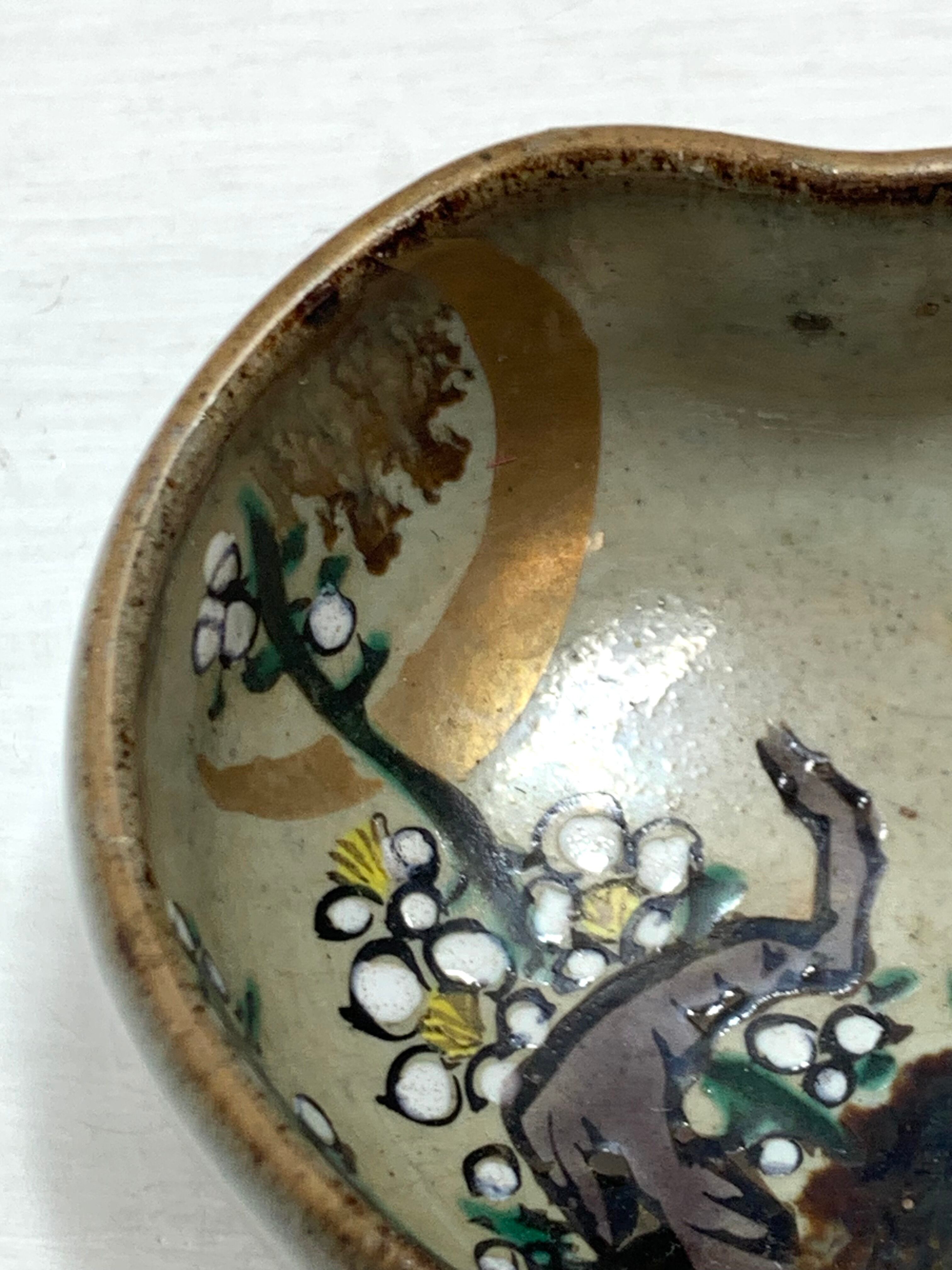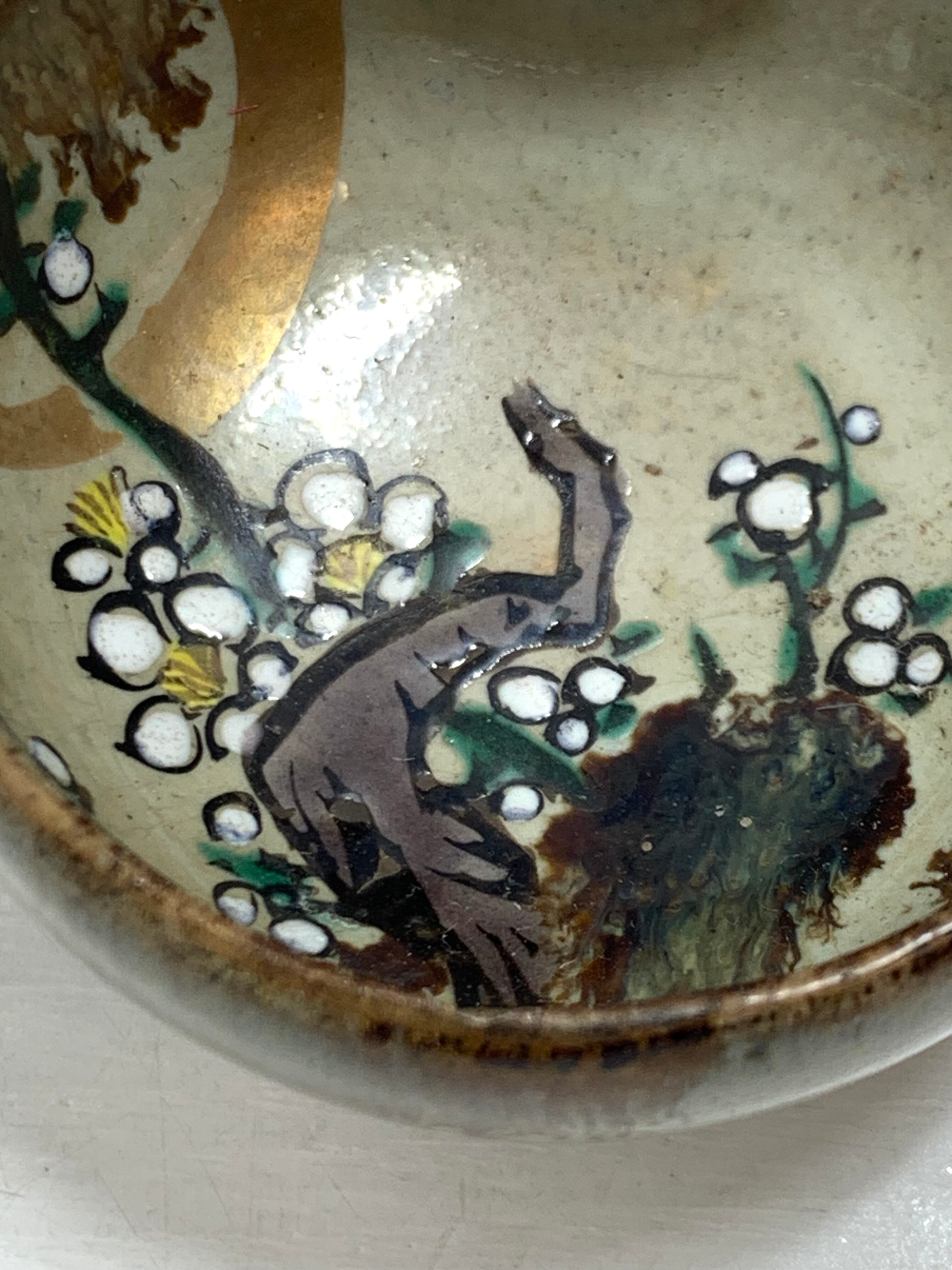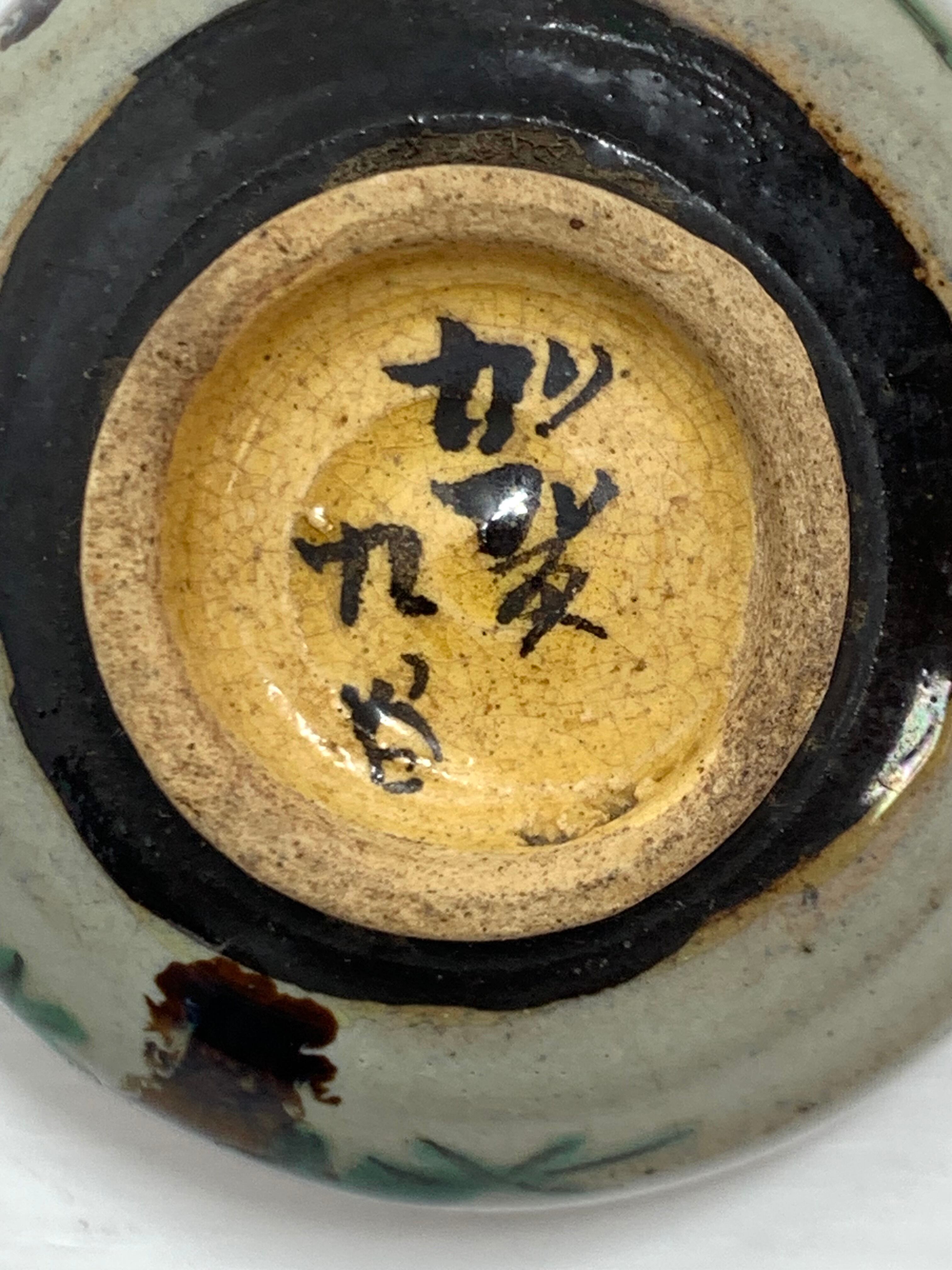 こちらは、加賀九谷の美しい盃(酒器)です。伝統的な九谷焼の技法を用いて、職人が丁寧に手描きした逸品。サイズは5×5cm、深さは2.6cmと手のひらに収まるコンパクトな大きさで、日本酒をゆっくりと楽しむのに最適です。