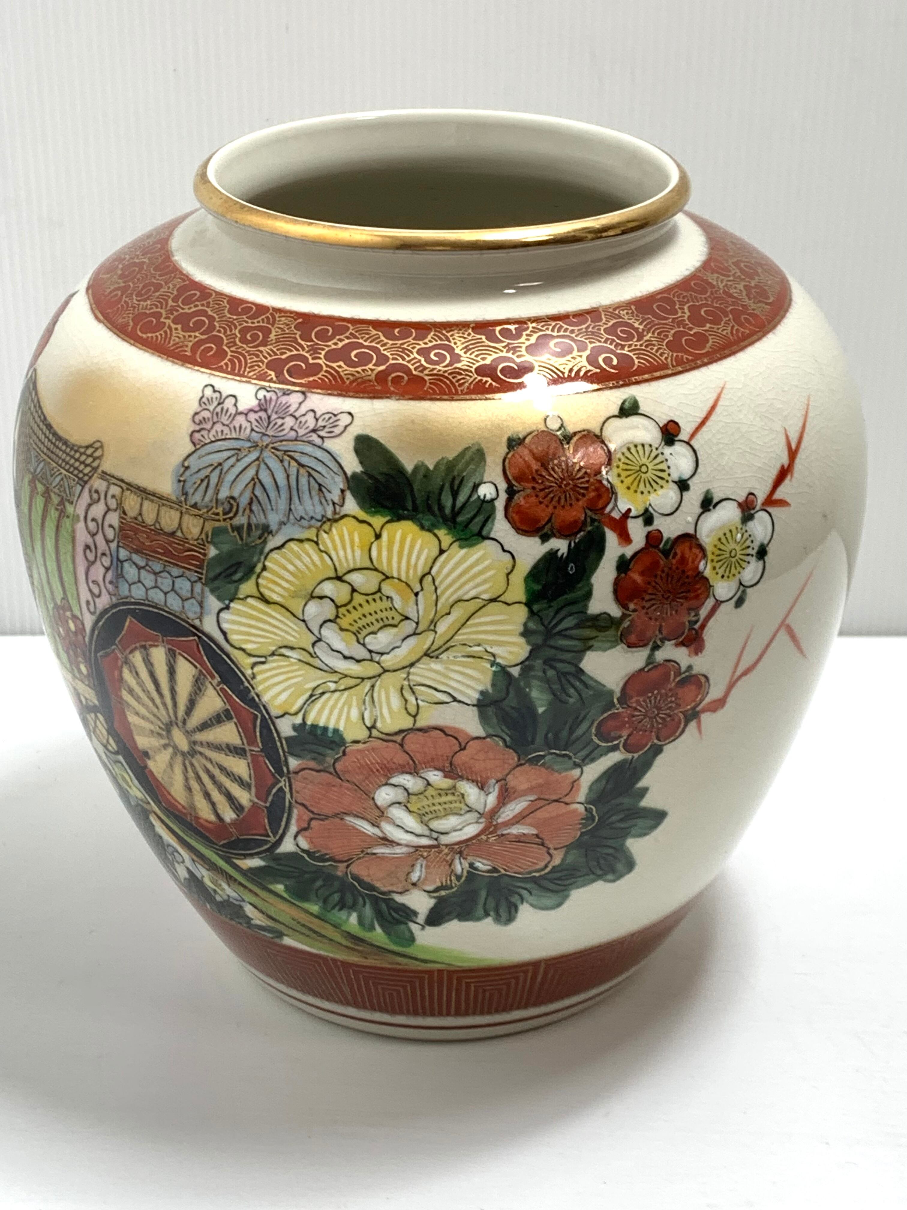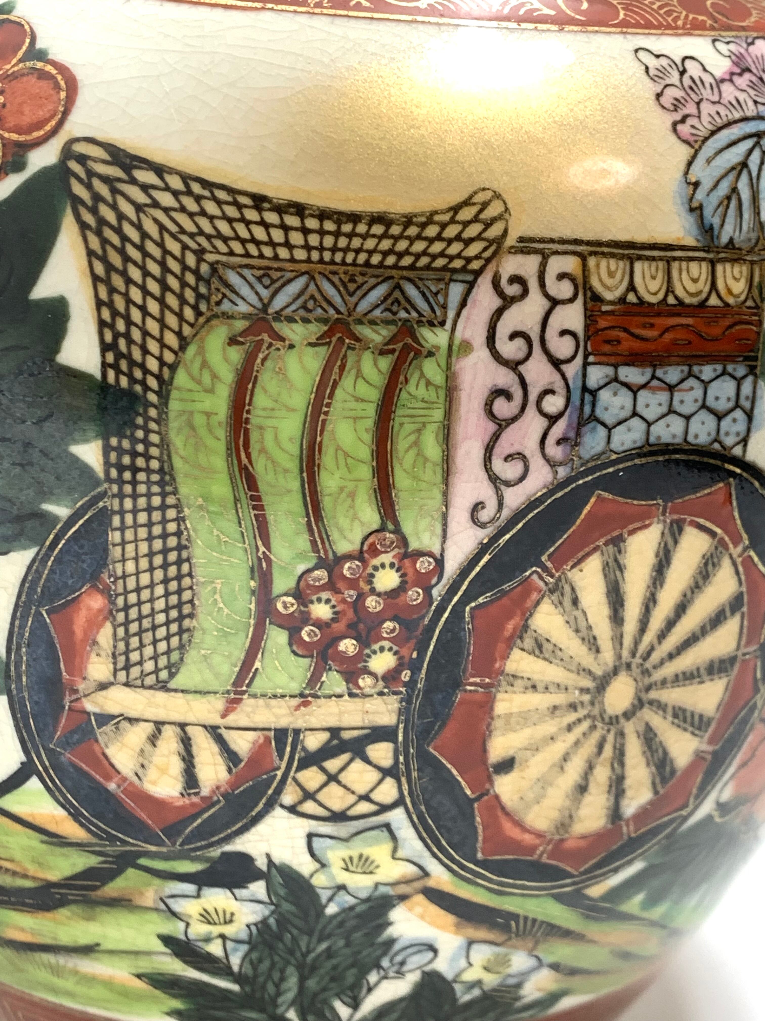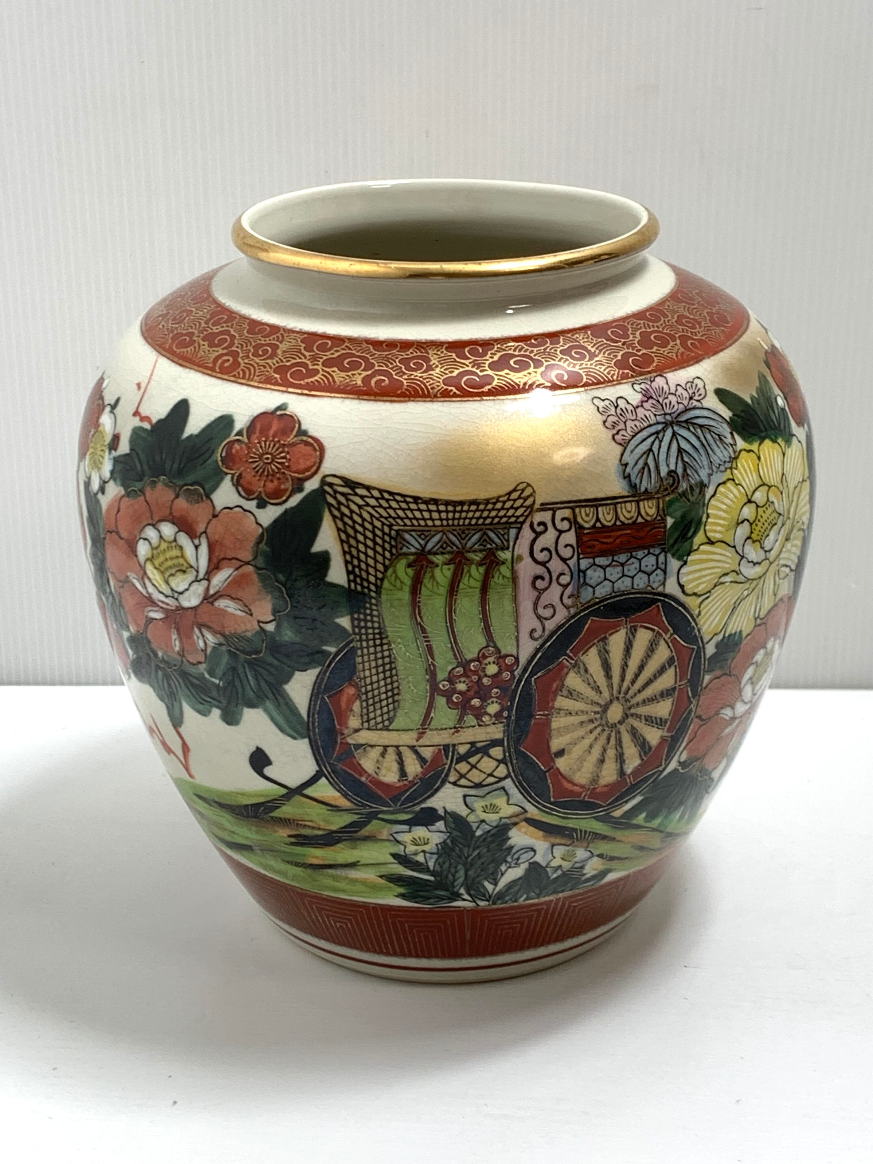 美しい九谷焼の花瓶、「九谷仙峰」の銘が入った逸品です。鮮やかな色彩と繊細な絵付けで、日本の伝統美を見事に表現しています。デザインには華やかな花々や御所車のモチーフが描かれ、和の風情を感じさせる仕上がりとなっています。