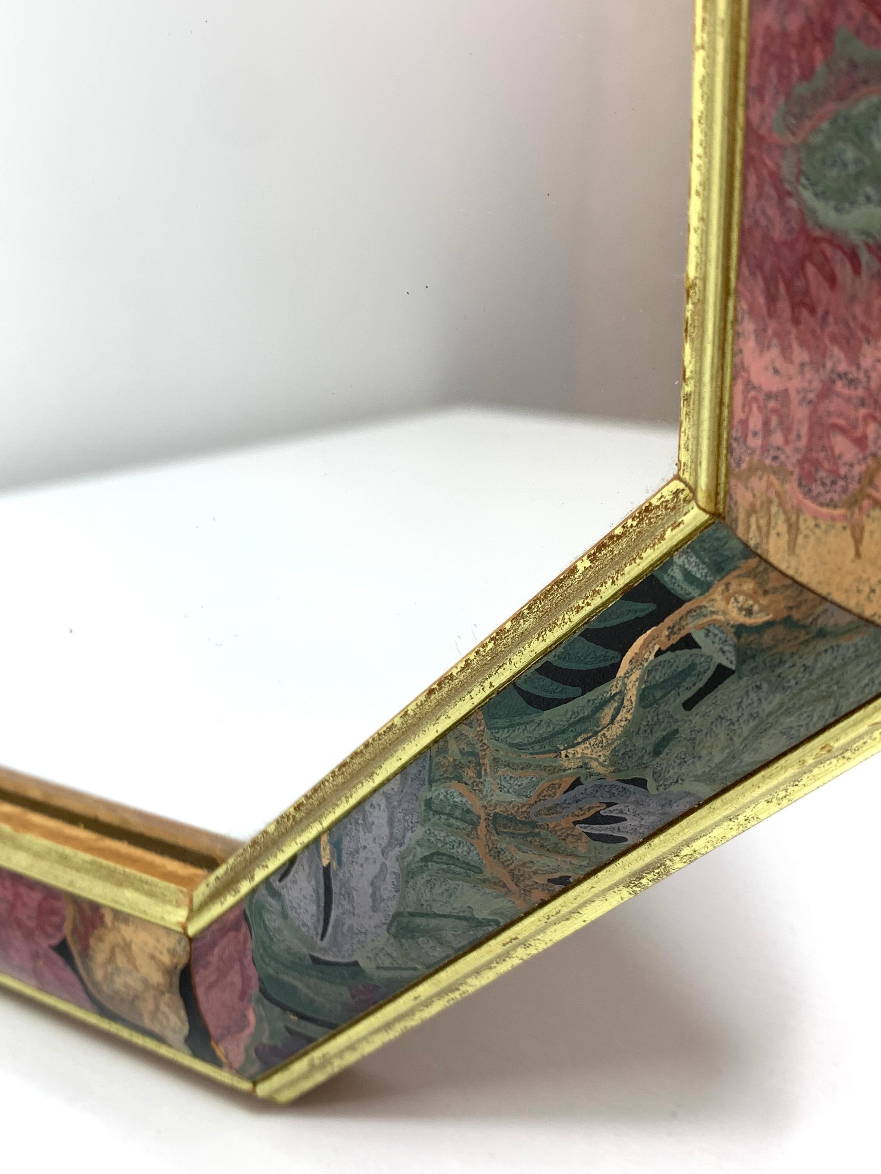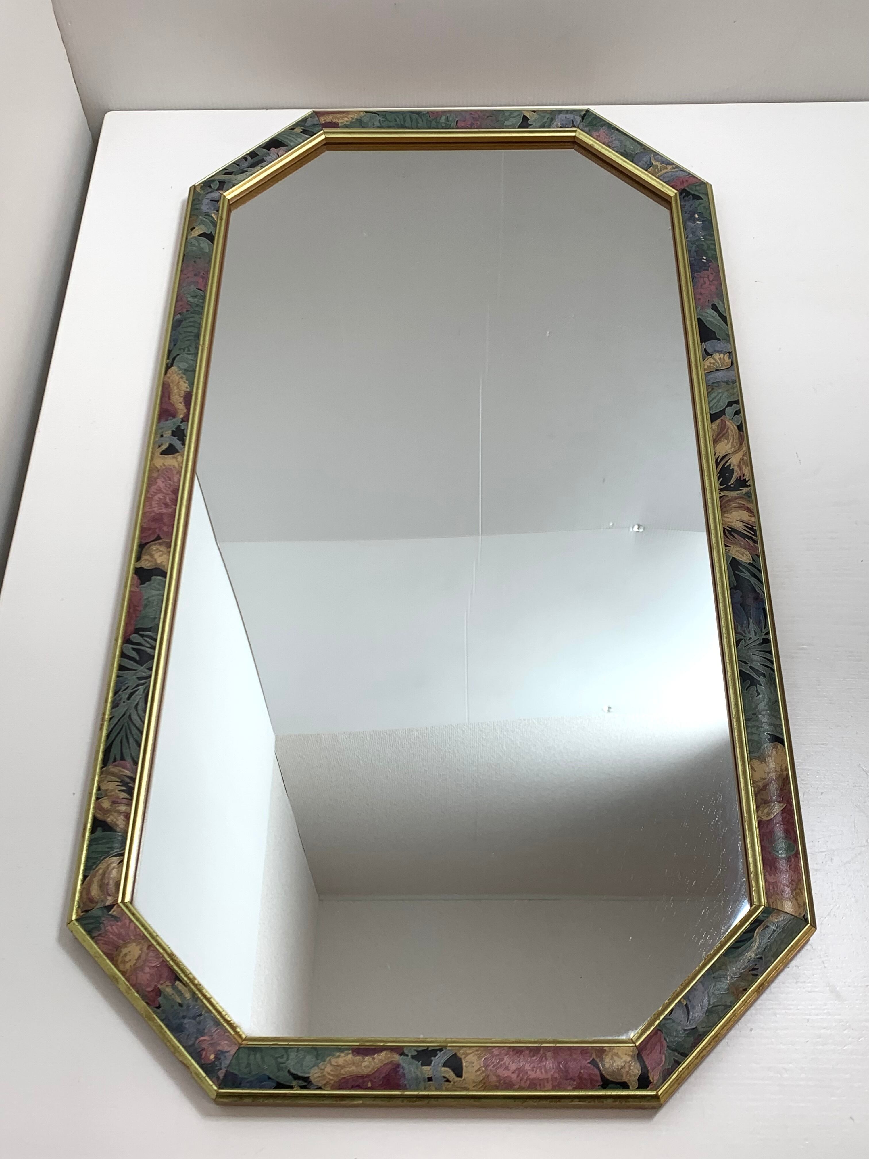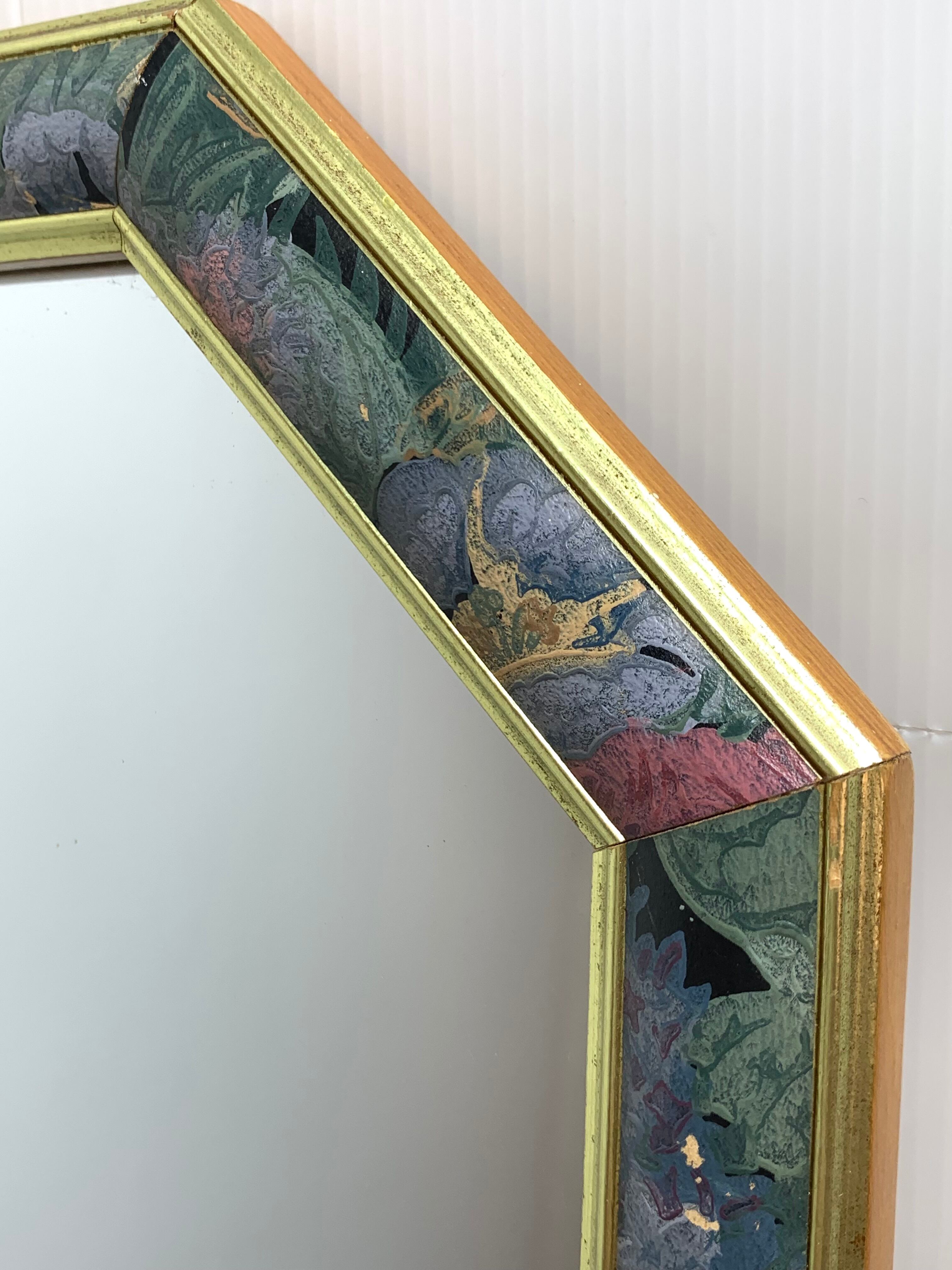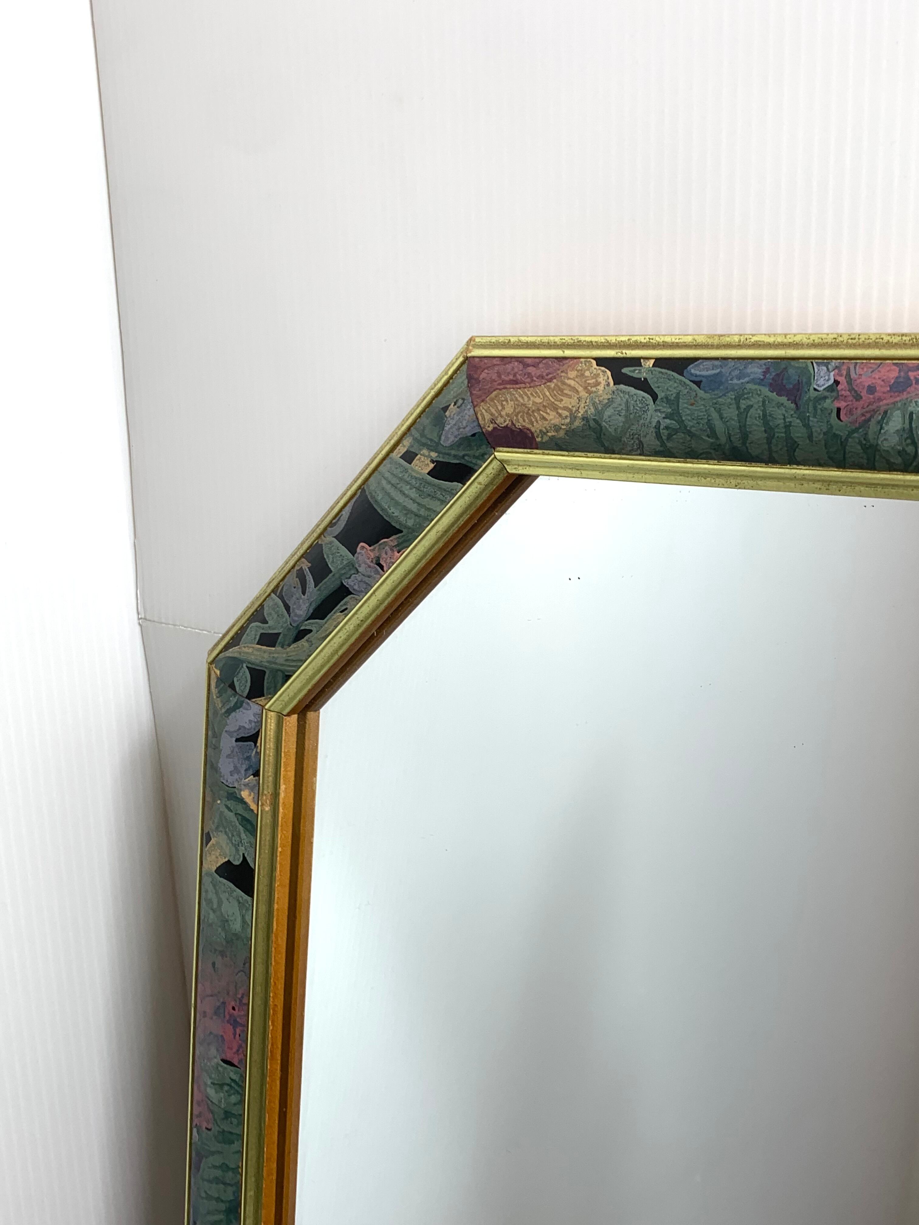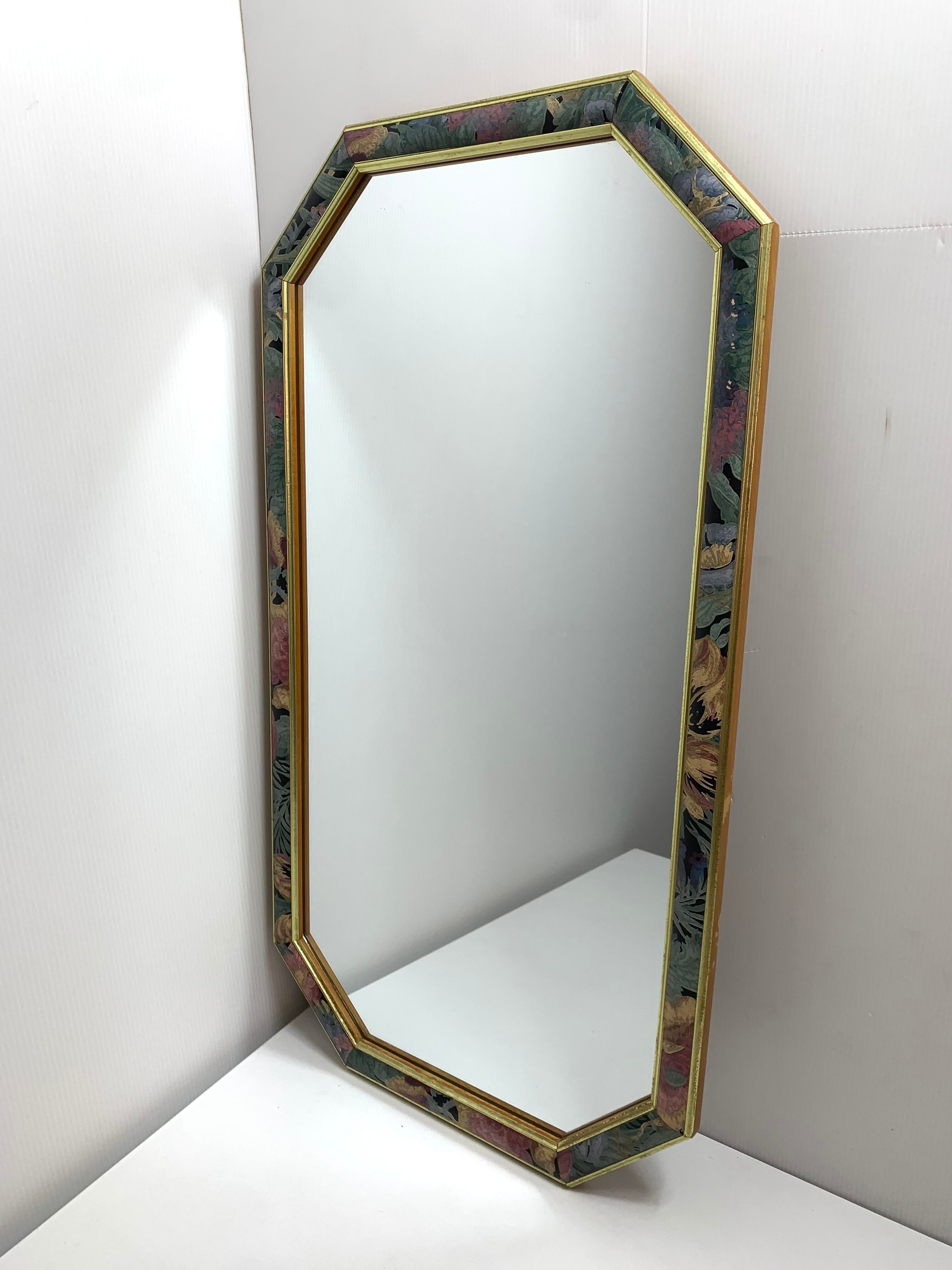 ボタニカルなデザインとクラシカルな魅力を兼ね備えた、イタリア製の八角形ウォールミラーです。長方形のフォルムに、グリーンを基調とした木製フレームが特徴で、上品な花柄が油絵タッチで描かれています。