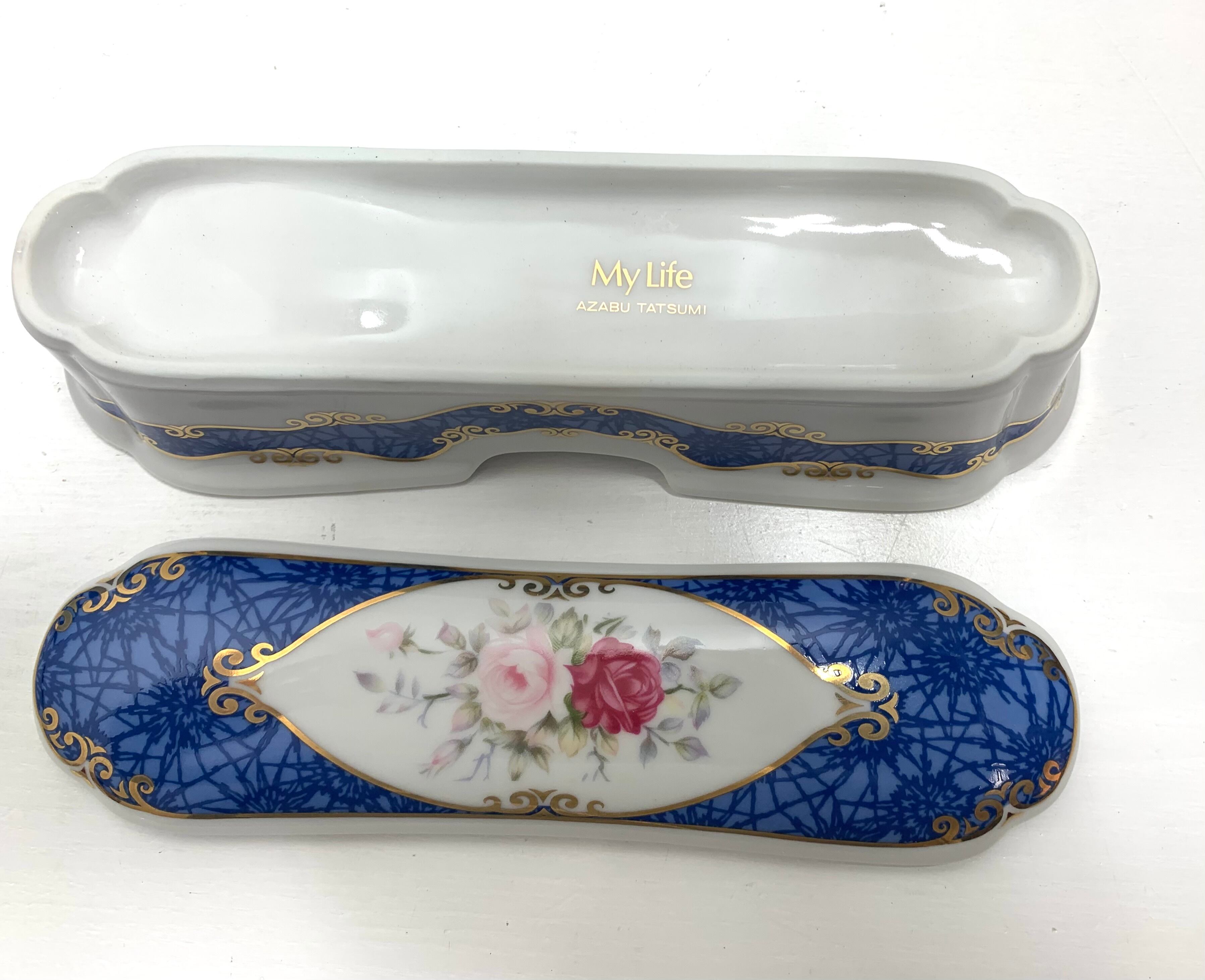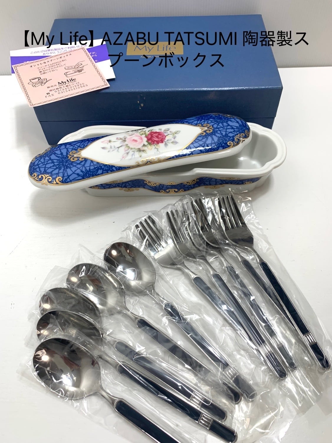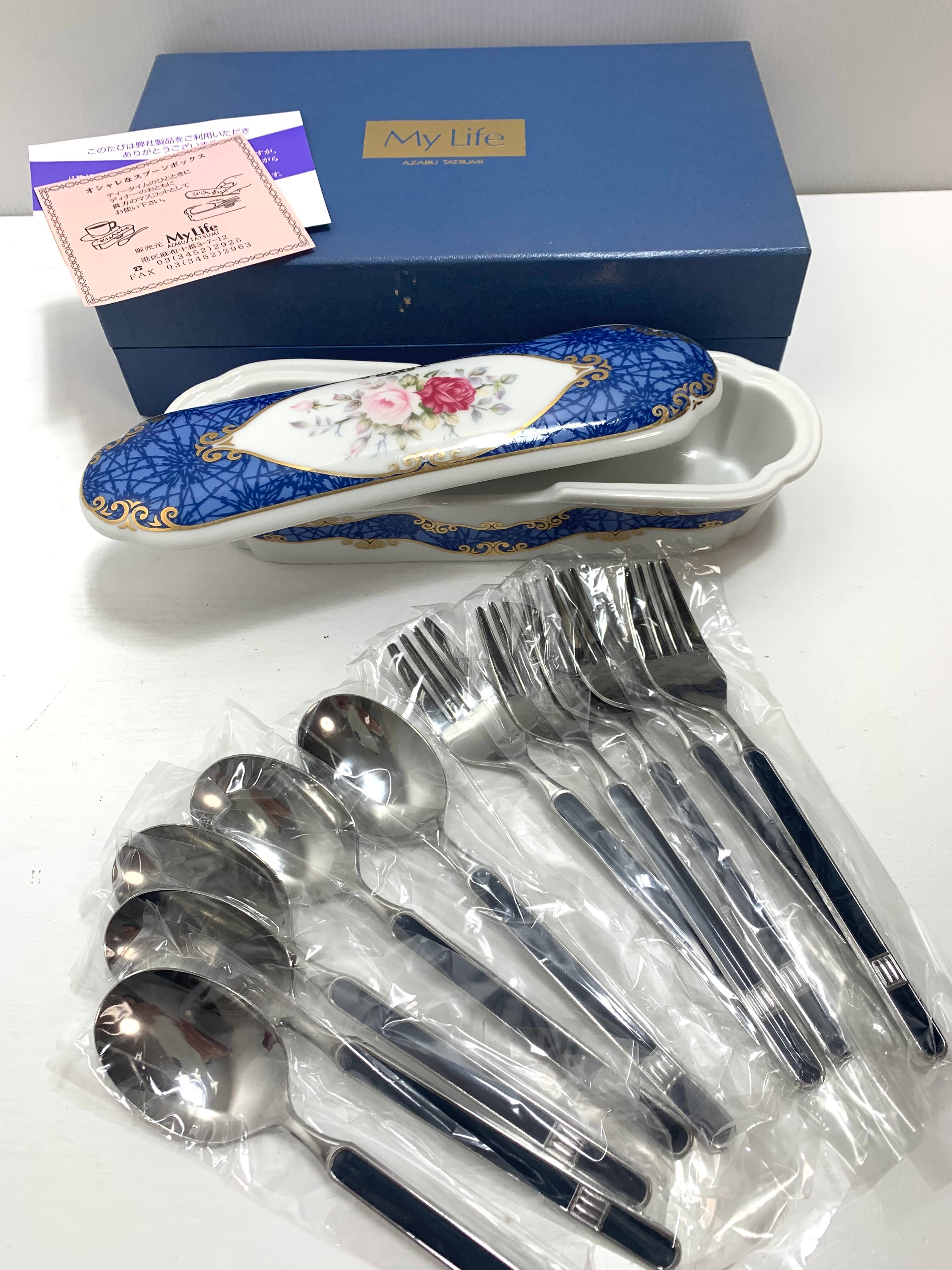 【My Life】AZABU TATSUMI 陶器製スプーンボックス スプーン&フォークセット付(各5本)