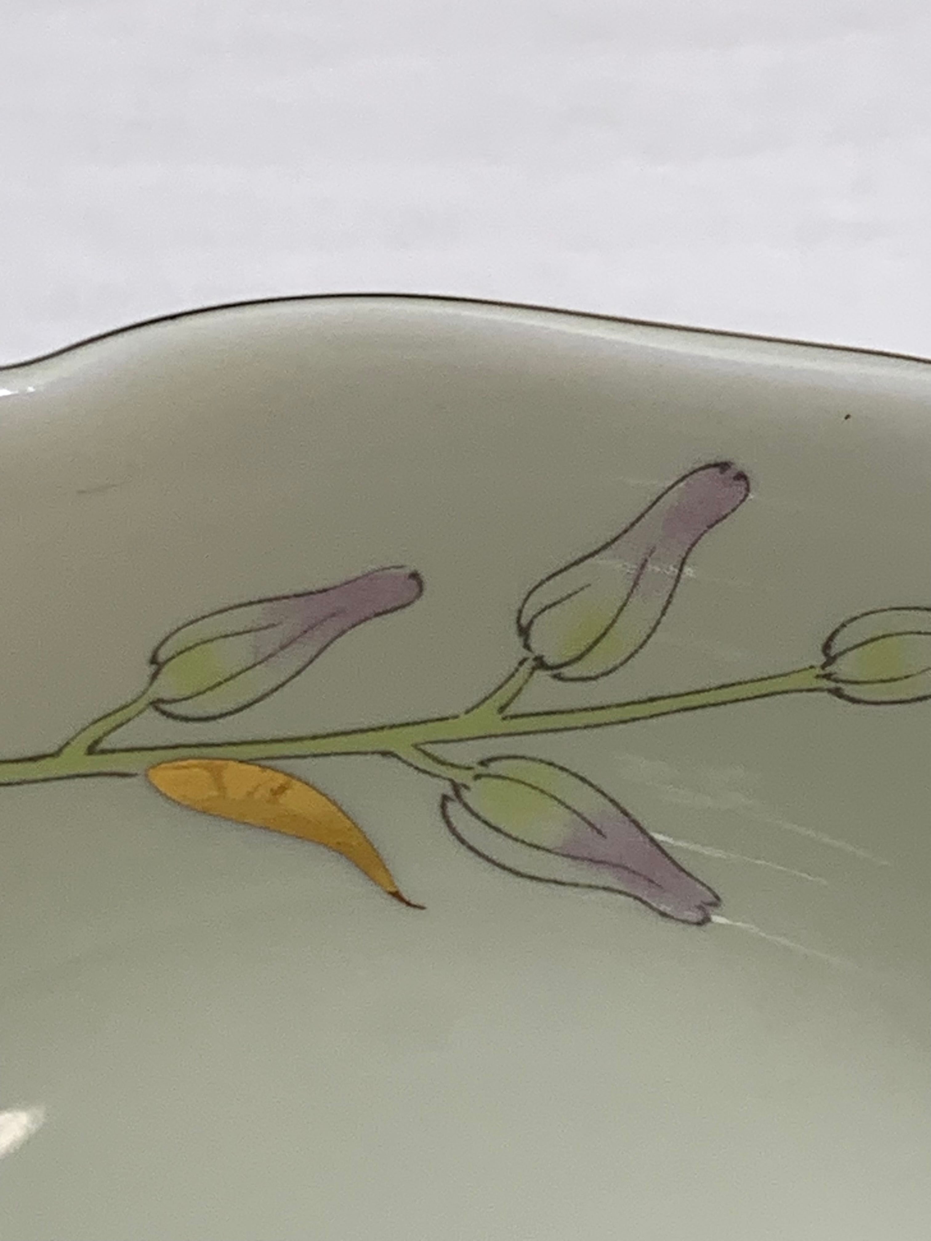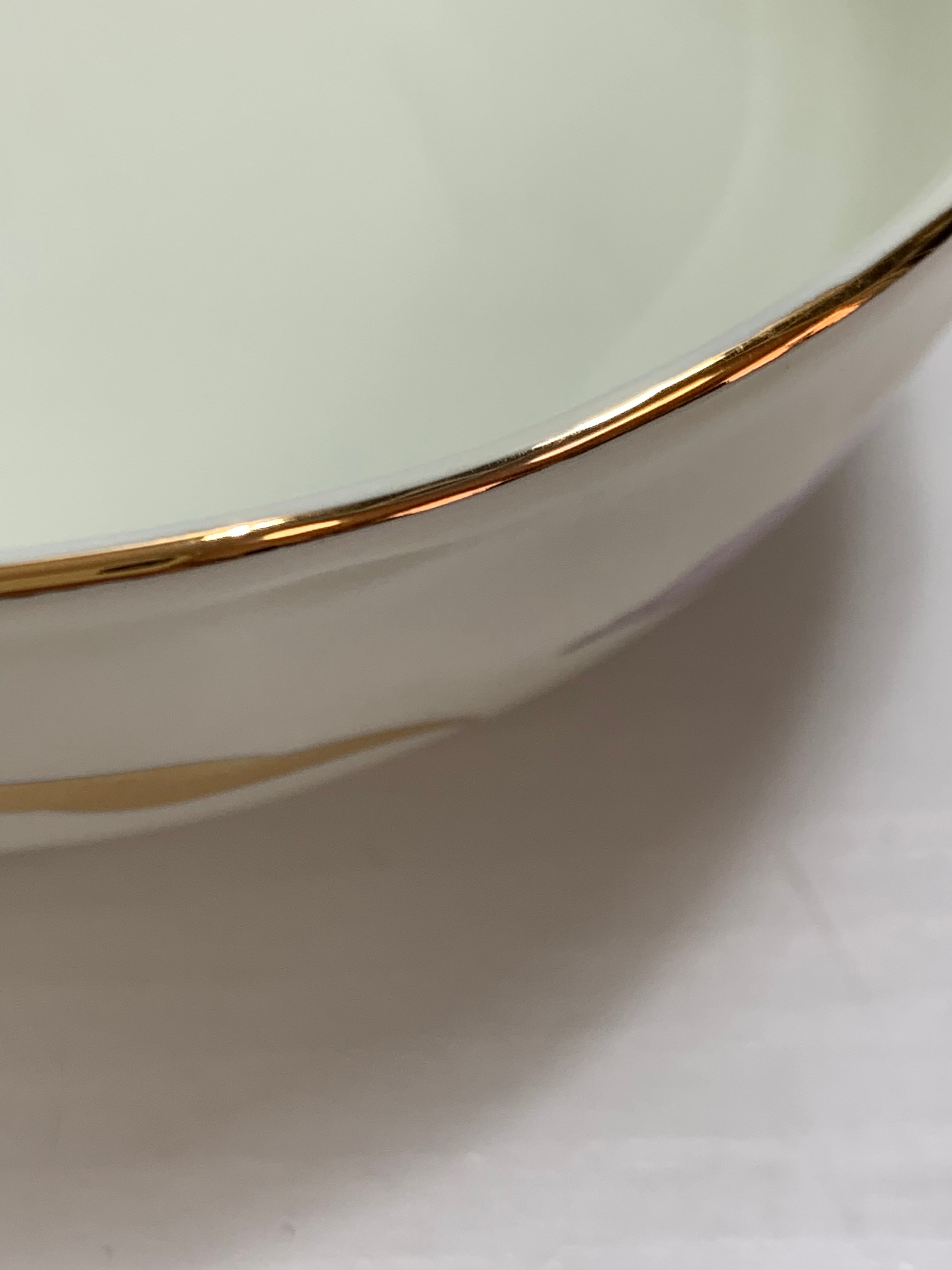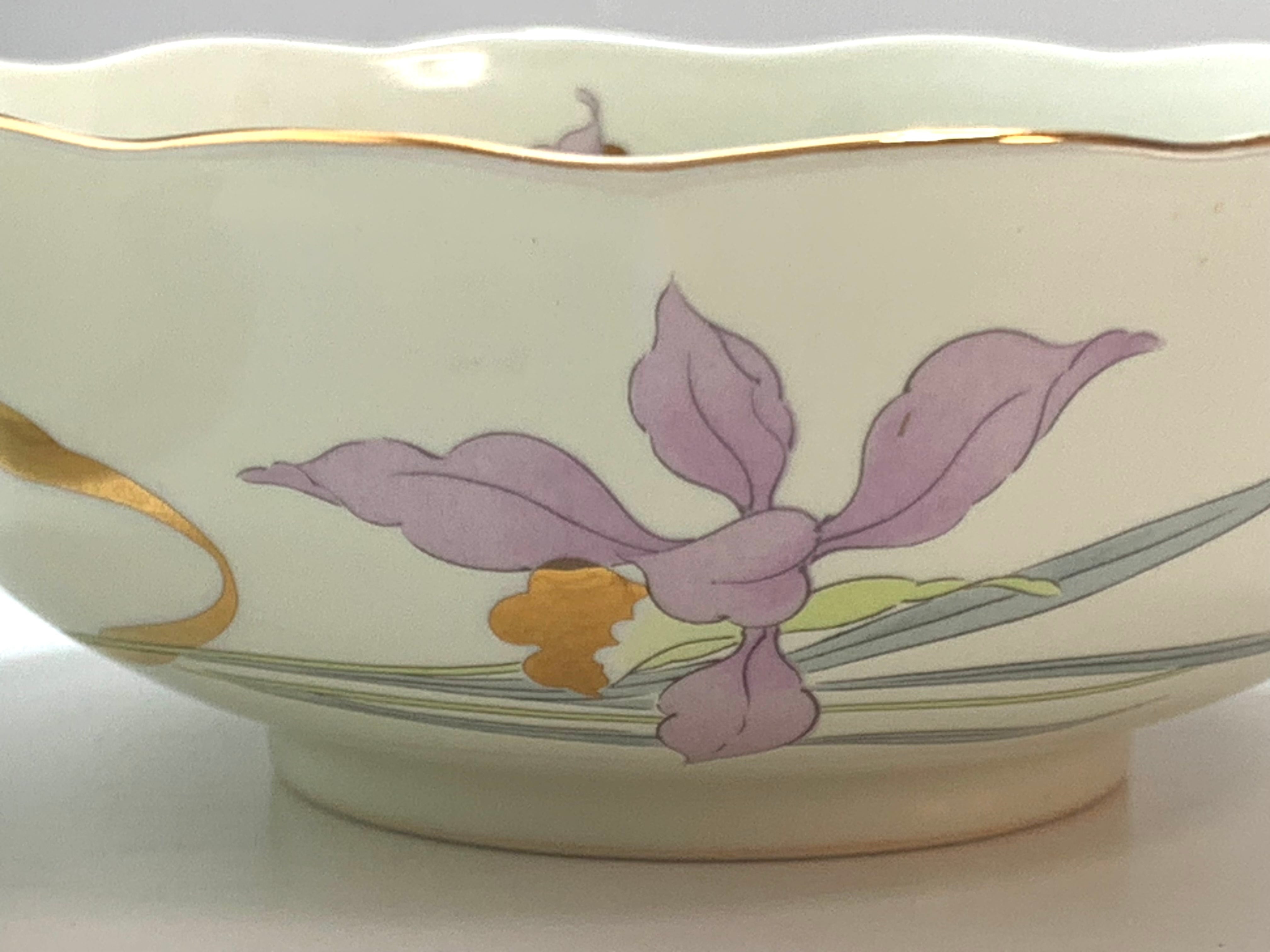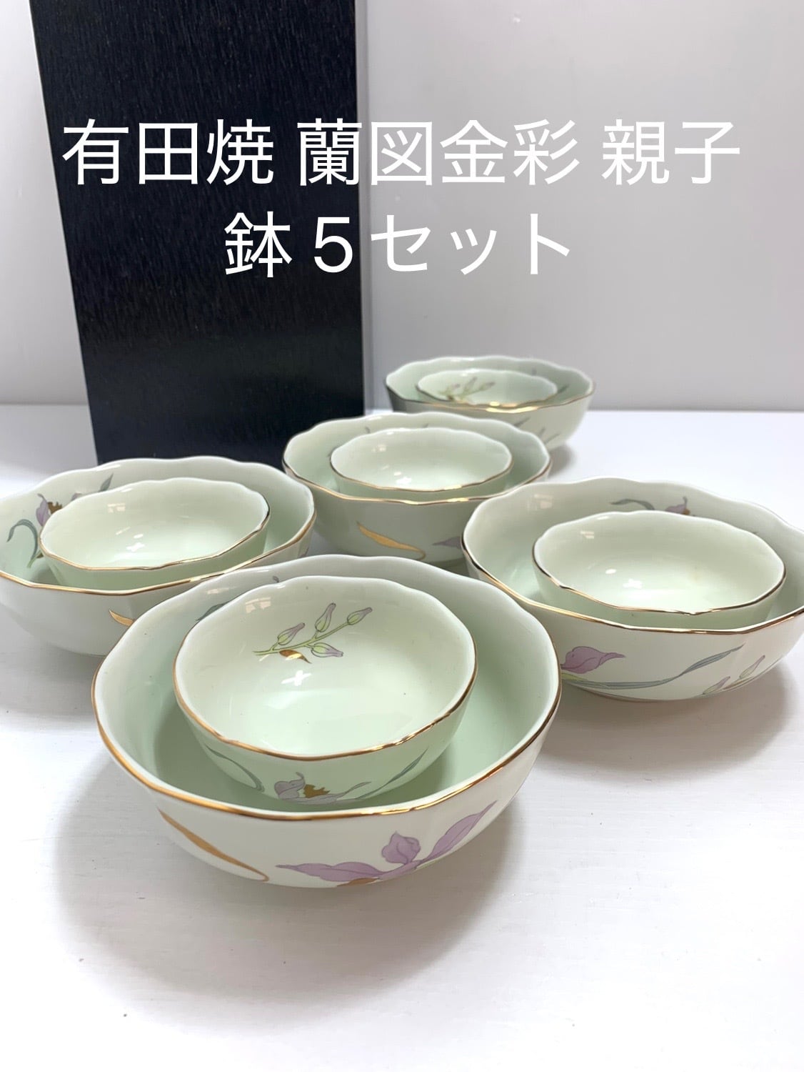 有田焼の親子鉢セットです。大鉢(直径12cm×高さ4.5cm)と小鉢(直径8cm×高さ3.5cm)の組み合わせが5セット含まれています。縁には金彩が施され、蘭の上品なデザインが特徴です。