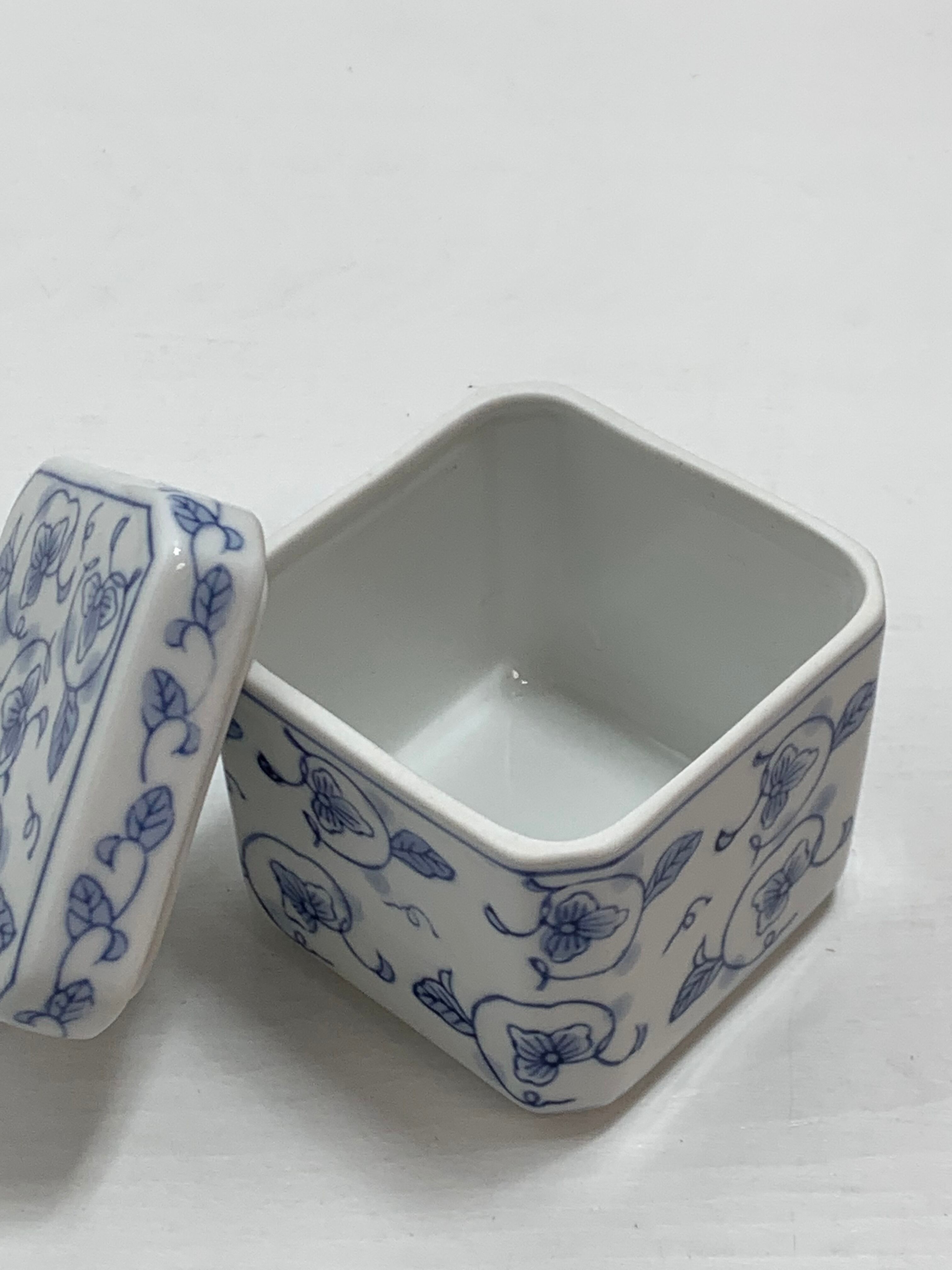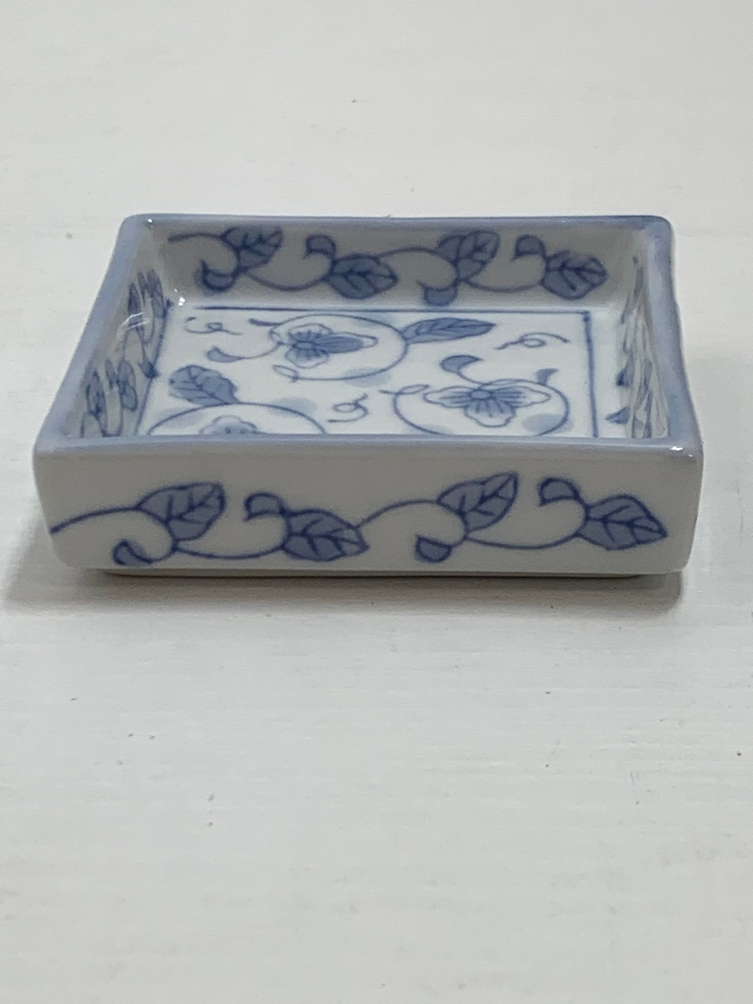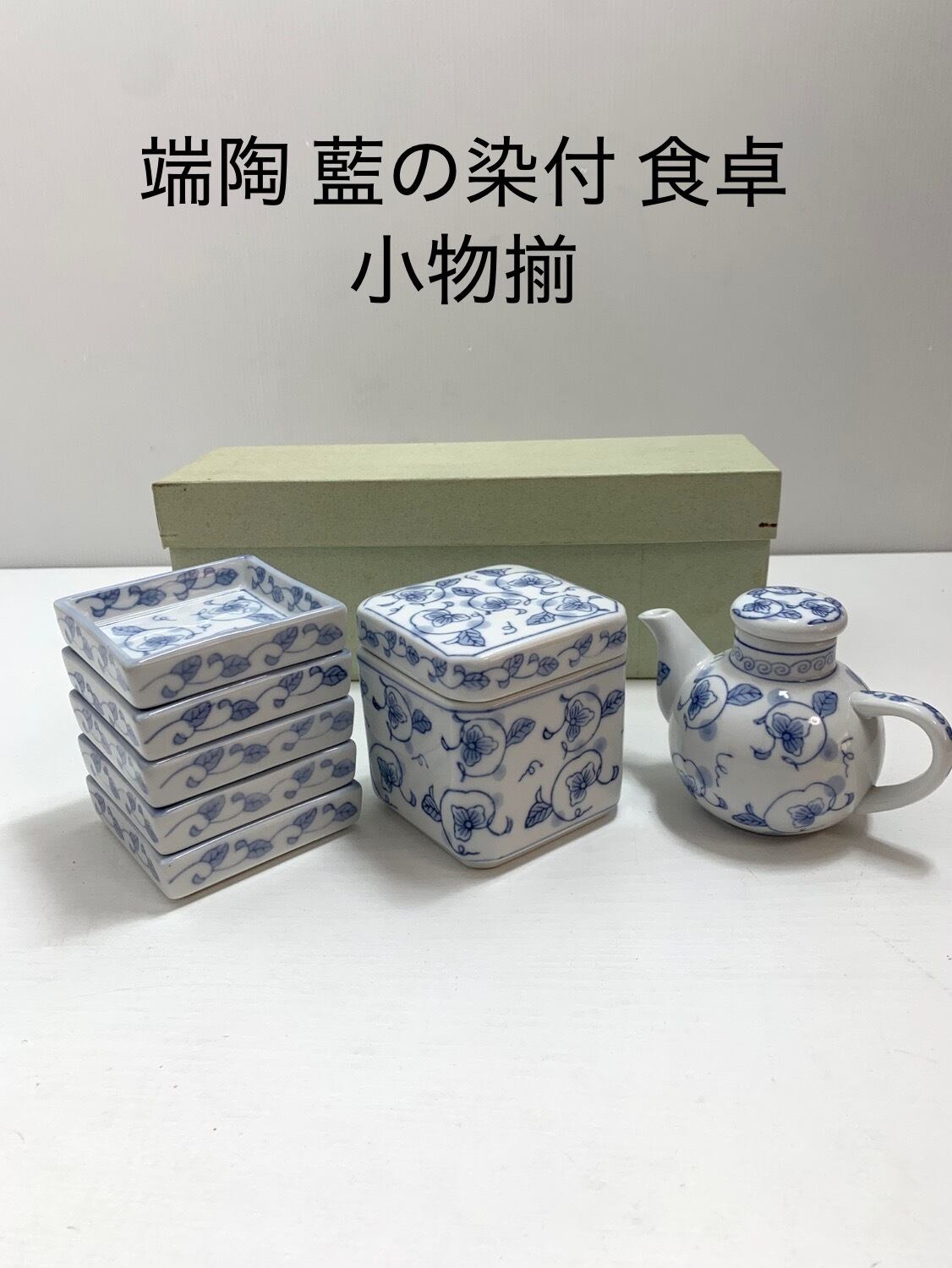 「端陶 藍の染付 食卓小物揃」は、伝統的な藍染め技法を用いた美しい食卓用小物のセットです。このセットには、7.5×7.5cmの四角い小皿、同サイズで高さ6.5cmの蓋付き四角柱容器、そして醤油差しが含まれています。藍色の染付が施されたこれらのアイテムは、食卓に上品な和の趣を添え、日常の食事をより豊かに演出します。また、蓋付き容器は調味料や小物の収納に便利で、機能性と美しさを兼ね備えています。伝統とモダンが融合したデザインは、和洋問わずさまざまな食卓シーンで活躍します。