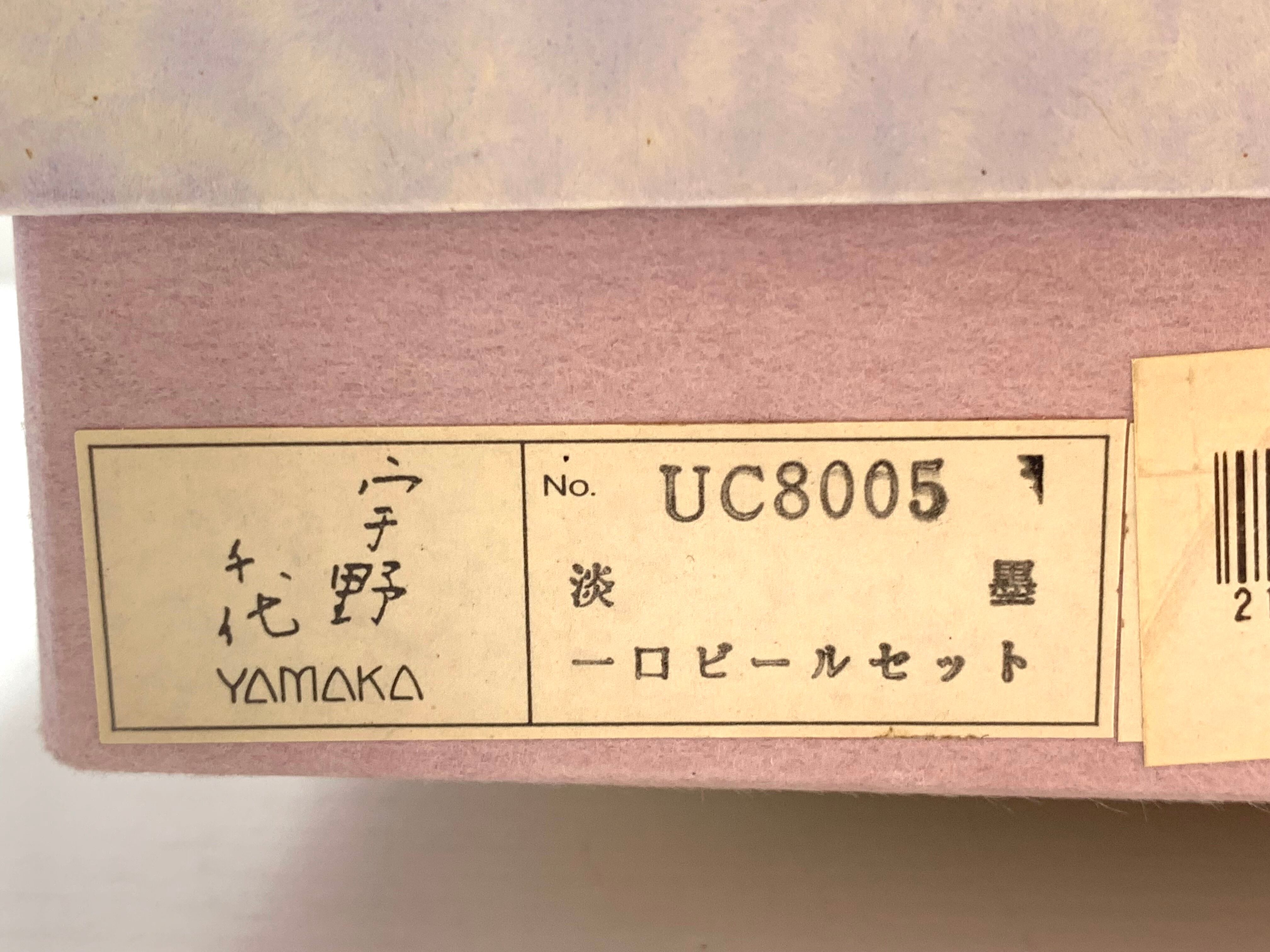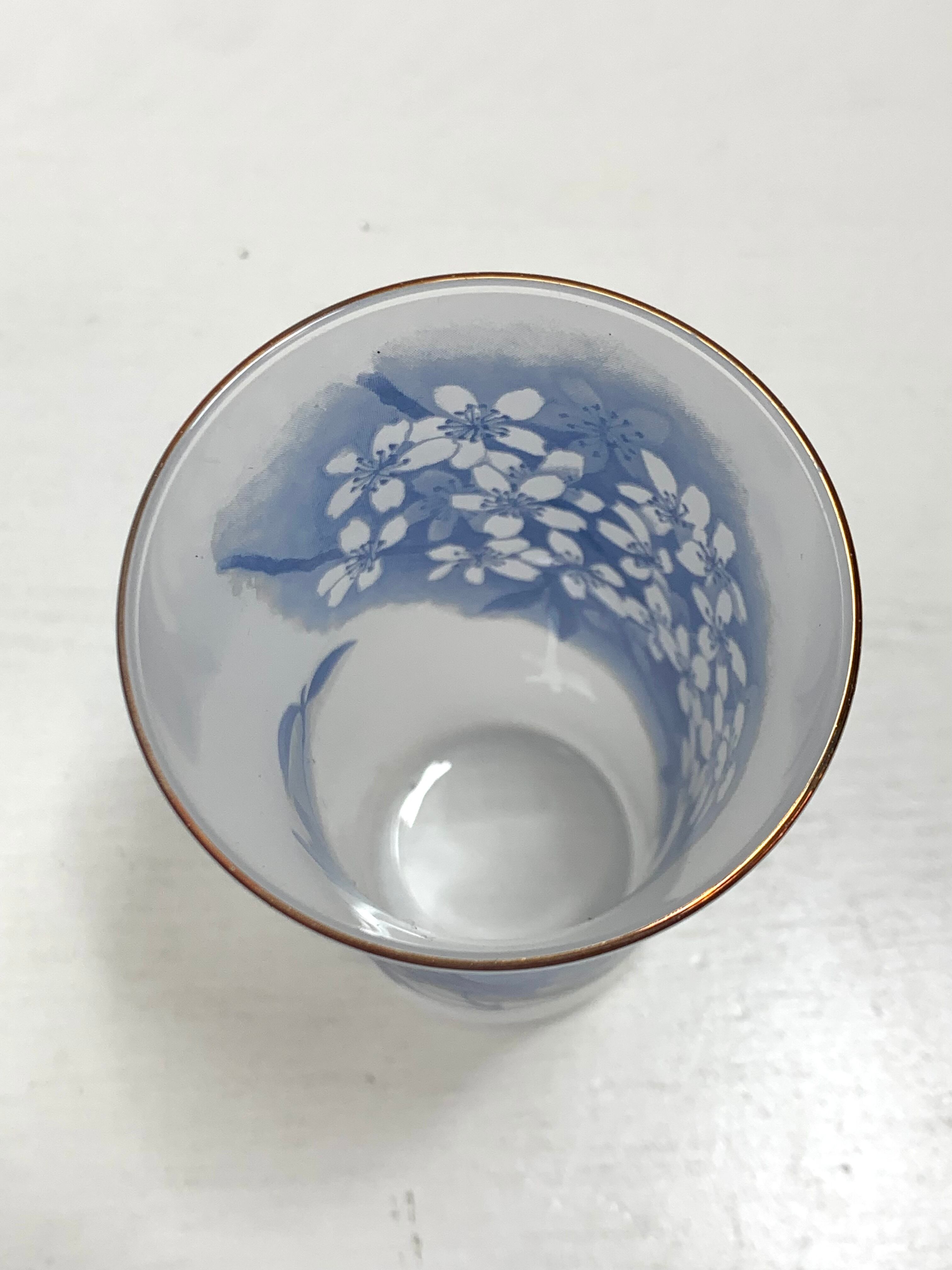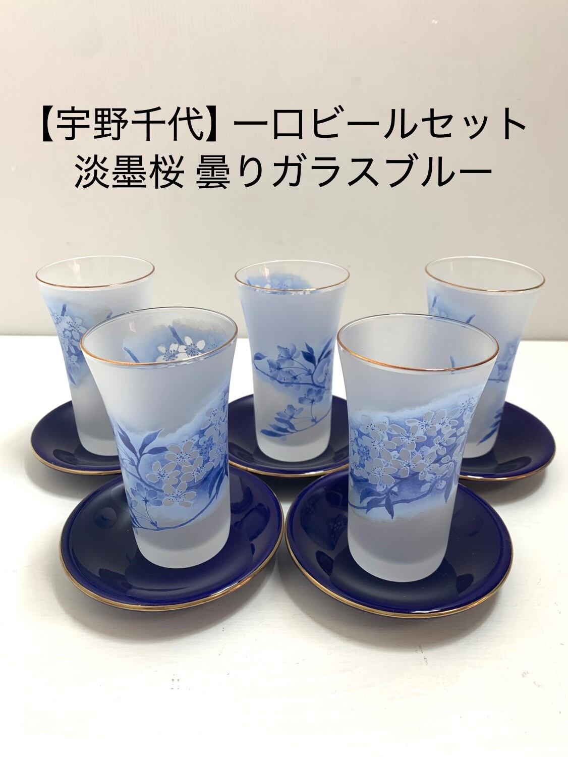 【宇野千代】一口ビールセット 淡墨桜 曇りガラスブルー(金縁グラス&紺色受け皿)5客揃