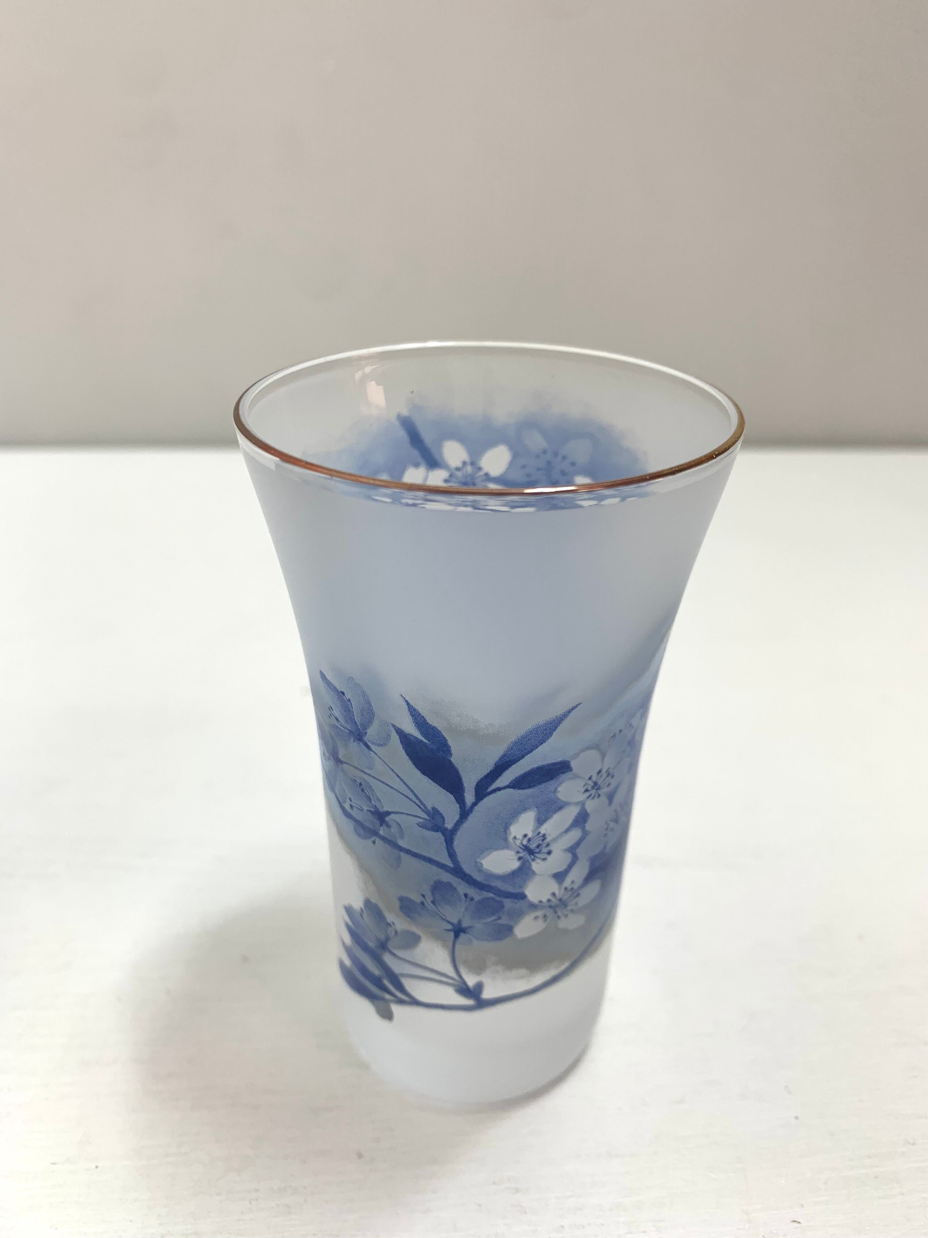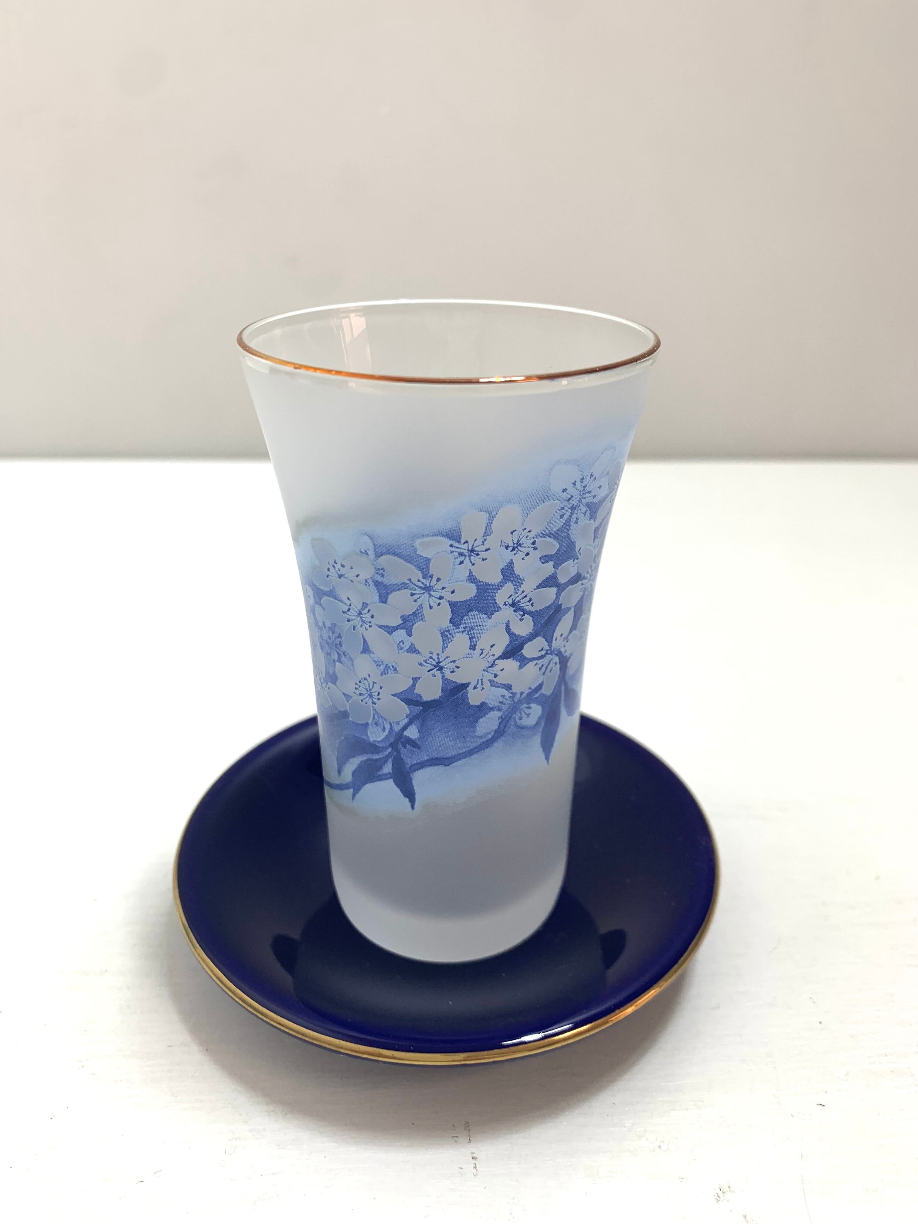 日本を代表する作家 宇野千代 デザインの、一口ビールセット「淡墨桜」のご紹介です。上品な曇りガラスのブルーに、青色の桜が描かれた美しいグラスと、金縁が施された紺色の受け皿がセットになっています。